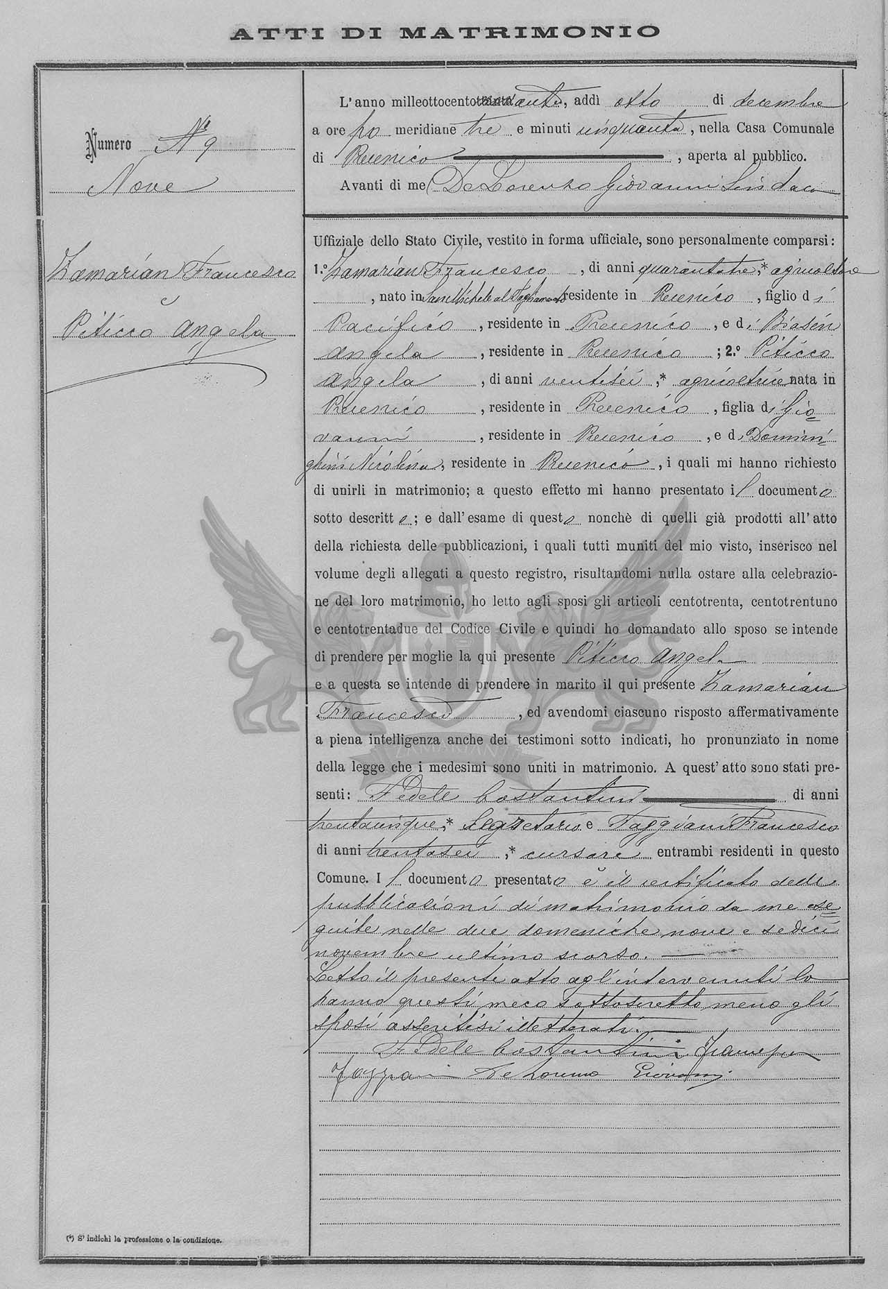 Diante de mim De Lorenzo Giovanni Síndico Oficial do Registro Civil, vestido em forma oficial, compareceram pessoalmente: 1º Zamarian Francesco, de quarenta e três anos, *agricultor, nascido em San Michele al Tagliamento, residente em Precenicco, filho de Pacifico, residente em Precenicco, e de Biasin Angela, residente em Precenicco; 2º Piticco Angela, de vinte e seis anos, *agricultora nascida em Precenicco, residente em Precenicco, filha de Giovanni, residente em Precenicco, e Dominghini Nicolina, residente em vida em Latisana, os quais me pediram para uni-los em matrimônio; a este efeito me apresentaram o documento abaixo descrito; e do exame destes também daqueles já produzidos no ato do requerimento das publicações, os quais todos munidos do meu visto, inseridos no volume dos anexos a este registro, resultando-me nada a impedir à celebração deste matrimônio, eu li aos nubentes os artigos cento e trinta, cento e trinta e um e cento e trinta e dois do Código Civil e então perguntei ao nubente se intende de tomar por mulher a aqui presente Piticco Angela e a esta se entende de tomar por marido o aqui presente Zamarian Francesco, e havendo-me cada um respondido de maneira afirmativa em plena inteligência inclusive para as testemunhas sub indicadas , pronunciei em nome da lei que os referidos foram unidos em matrimônio. A este ato estavam presentes: Fedele Costantini, de trinta e cinco anos, *secretário e Faggiani Francesco de trinta e seis anos, *cursor ambos presentes residentes neste Município.