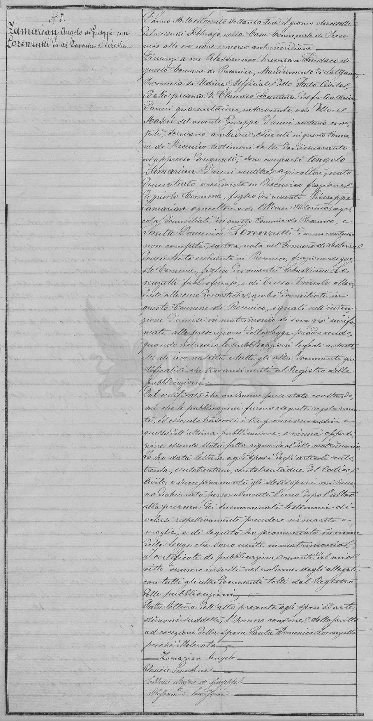 Diante de mim Alessandro Trevisan Síndico deste Município de Precenicco, mandamento de Latisana, Província de Udine, Oficial do Registro Civil, e à presença de Claudio Scantina filho do finado Antonio de quarenta e um anos, interventor, e de Ettore Maseri filho do vivente Giuseppe de vinte e um anos completos, servente ambos residentes neste Município de Precenicco testemunhas escolhidas pelos declarantes e assim designadas; compareceram Angelo Zamarian, de vinte e três anos agricultor, nascido e domiciliado e residente em Precenicco fração deste Município, filho dos viventes Giuseppe Zamarian, agricultor e de Olivier Caterina, agricultora domiciliados nesse Município de Precenicco, e Santa Domenica Lorenzutti de vinte e um anos completos, artesã, nascida no Município de Lestizza domiciliada e residente em Precenicco, fração deste Município, filha dos viventes Sebastiano Lorenzutti, ferreiro, e de Teresa Crissolo, atendente domestica, ambos domiciliados neste Município de Precenicco, os quais na intenção de unirem-se em matrimônio estão já dentro dos dos preceitos da Lei produzindo, quando requisitado as publicações as respectivas autenticas certidões de seus nascimentos e todos os outros documentos justificáveis que encontram-se anexos ao Registro das publicações.