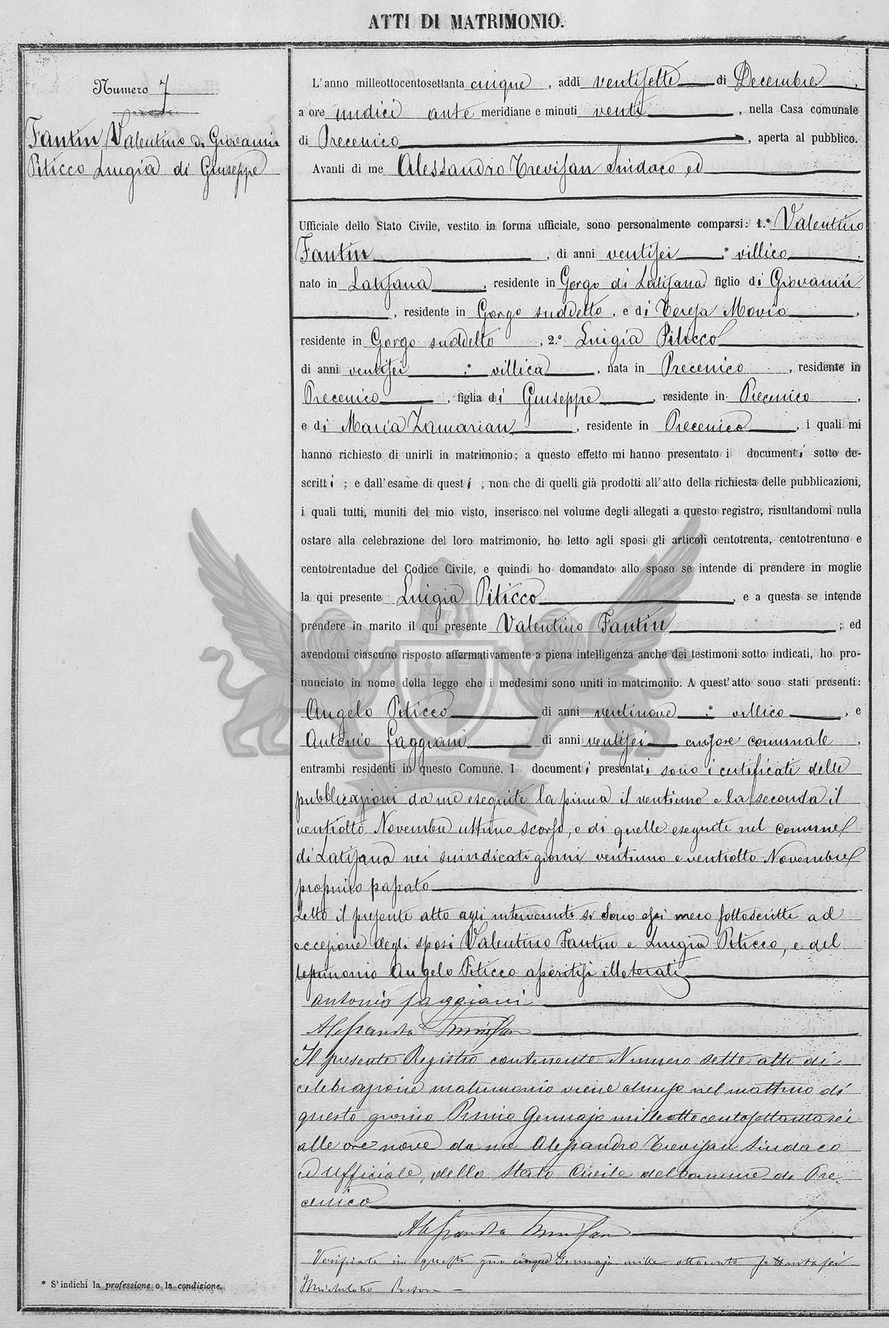 Diante de mim Alessandro Trevisan Síndico Oficial do Registro Civil, vestido em forma oficial, compareceram pessoalmente: 1º Valentino Fantin, de vinte e seis anos, camponês, nascido em Latisana, residente em Gorgo de Latisana, filho de Giovanni, residente em Gorgo referido, e de Teresa Movio, residente em Gorgo referido; 2º Luigia Pittico de vinte e seis anos, camponesa nascida em Precenicco, residente em Precenicco, filha de Giuseppe, residente em Precenicco, e Maria Zamarian, residente em Precenicco, os quais me pediram para uni-los em matrimônio; a este efeito me apresentaram os documentos abaixo descritos; e do exame destes também daqueles já produzidos no ato do requerimento das publicações, os quais todos munidos do meu visto, inseridos no volume dos anexos a este registro, resultando-me nada a impedir à celebração deste matrimônio, eu li aos nubentes os artigos cento e trinta, cento e trinta e um e cento e trinta e dois do Código Civil e então perguntei ao nubente se intende de tomar por mulher a aqui presente Luigia Piticco e a esta se intende de tomar por marido o aqui presente Valentino Fantin, e havendo-me cada um respondido de maneira afirmativa em plena inteligência inclusive para as testemunhas sub indicadas , pronunciei em nome da lei que os referidos foram unidos em matrimônio. A este ato se apresentaram: Angelo Piticco de vinte e nove anos secretário e Antonio Faggiani de vinte e seis anos, cursor municipal ambos presentes residentes neste Município. Os documentos apresentados são os certificados das publicações de matrimônio por mim exibidas a primeira no dia vinte e um e a segunda vinte e oito de novembro último passado, e daquelas exibidas pelo Município de Latisana nos referidos dias vinte e um e vinte e oito de novembro passado.