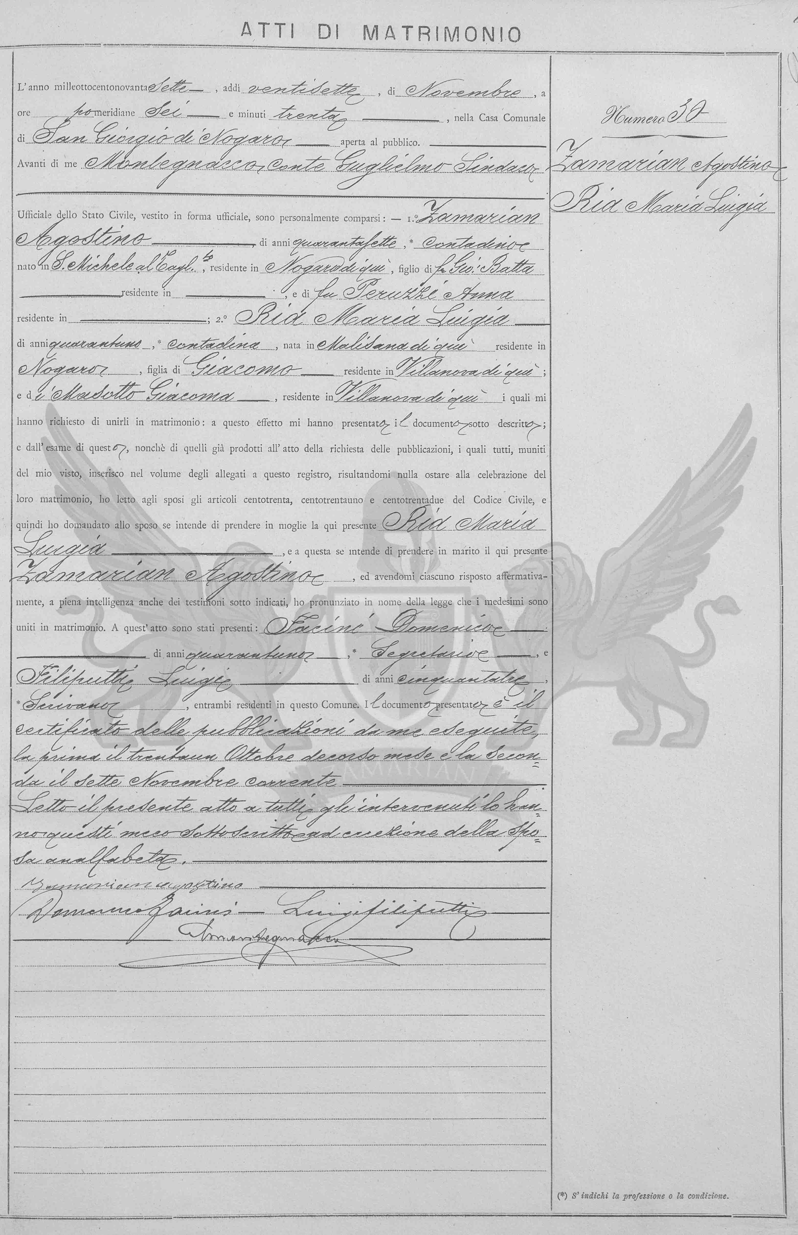 1º Zamarian Agostino, de quarenta e sete anos, *camponês, nascido e, San Michele al Tagliamento residente in Nogaro di qui, filho do falecido Giovanni Battista, e da falecida Peruzzi Anna; 2º Ria Maria Luigia de quarenta e um anos, *camponesa nascida em Malisana daqui, residente em Nogaro, filha de Giacomo, residente em Villanova daqui, e de Masotto Giacoma, residente em Villanova daqui, os quais me requereram de uni-los em matrimônio; a este efeito me apresentaram o documento sub descrito; e do exame deste também aqueles já produzidos no ato de requerimento das publicações, os quais todos munidos do meu visto, inseri no volume dos anexos à este registro, resultando-me nada a impedir à celebração do matrimônio deles, eu li aos esposos os artigo cento e trinta, cento e trinta e um e cento e trinta e dois do Código Civil e então perguntei ao esposo se intende de tomar por mulher a presente Ria Maria Luigia, e a este se intende de tomar por marido o aqui presente Zamarian Agostino, e tendo-me cada um respondido afirmativamente em plena inteligência inclusive às testemunhas sub indicadas, pronunciei em nome da lei que os nubentes foram unidos em matrimônio. A este ato estiveram presentes: Facini Domenico de quarenta e um anos, *secretário e Filiputti Luigi de cinquenta e três anos, escrevente ambos presentes e residentes neste Município. O documento apresentado é o certificado das publicações por mim exibidas, a primeira no dia trinta e um de outubro do decorrido mês e a segunda no dia sete de novembro corrente.
