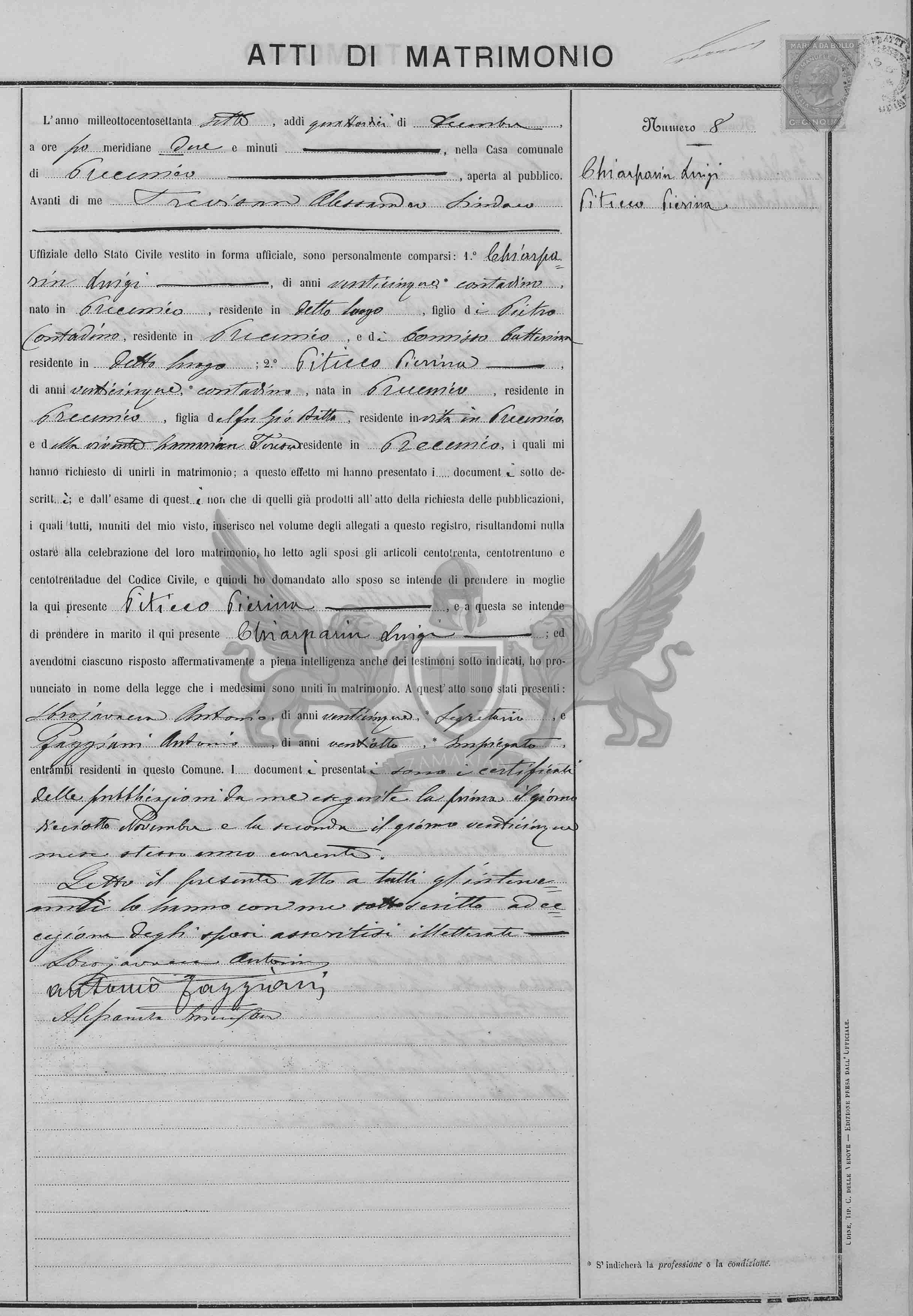 Diante de mim Trevisan Alessandro Síndico e Oficial do Registro Civil, vestido em forma oficial, compareceram pessoalmente: 1º Chiarparin Luigi, de vinte e cinco anos, camponês, nascido em Precenicco, residente no referido local, filho de Pietro, camponês, residente em Precenicco, e de Comisso Catterina, residente em no referido local; 2º Piticco Pierina de vinte e cinco anos, camponesa nascida em Precenicco, residente em Precenicco, filha do finado Gio Batta, residente em vida em Precenicco, e da vivente Zamarian Teresa, residente em Precenicco, os quais me pediram para uni-los em matrimônio; a este efeito me apresentaram o documento abaixo descrito; e do exame deste também daqueles já produzidos no ato do requerimento das publicações, os quais todos munidos do meu visto, inseridos no volume dos anexos a este registro, resultando-me nada a impedir à celebração deste matrimônio, eu li aos nubentes os artigos cento e trinta, cento e trinta e um e cento e trinta e dois do Código Civil e então perguntei ao nubente se intende de tomar por mulher a aqui presente Piticco Pierina e a esta se intende de tomar por marido o aqui presente Chiarparin Luigi, e havendo-me cada um respondido de maneira afirmativa em plena inteligência inclusive para as testemunhas sub indicadas , pronunciei em nome da lei que os referidos foram unidos em matrimônio. A este ato se apresentaram: Sbrajavacea Antonio de vinte e cinco anos secretário e Faggiani Antonio de vinte e oito anos, empregado ambos presentes residentes neste Município.