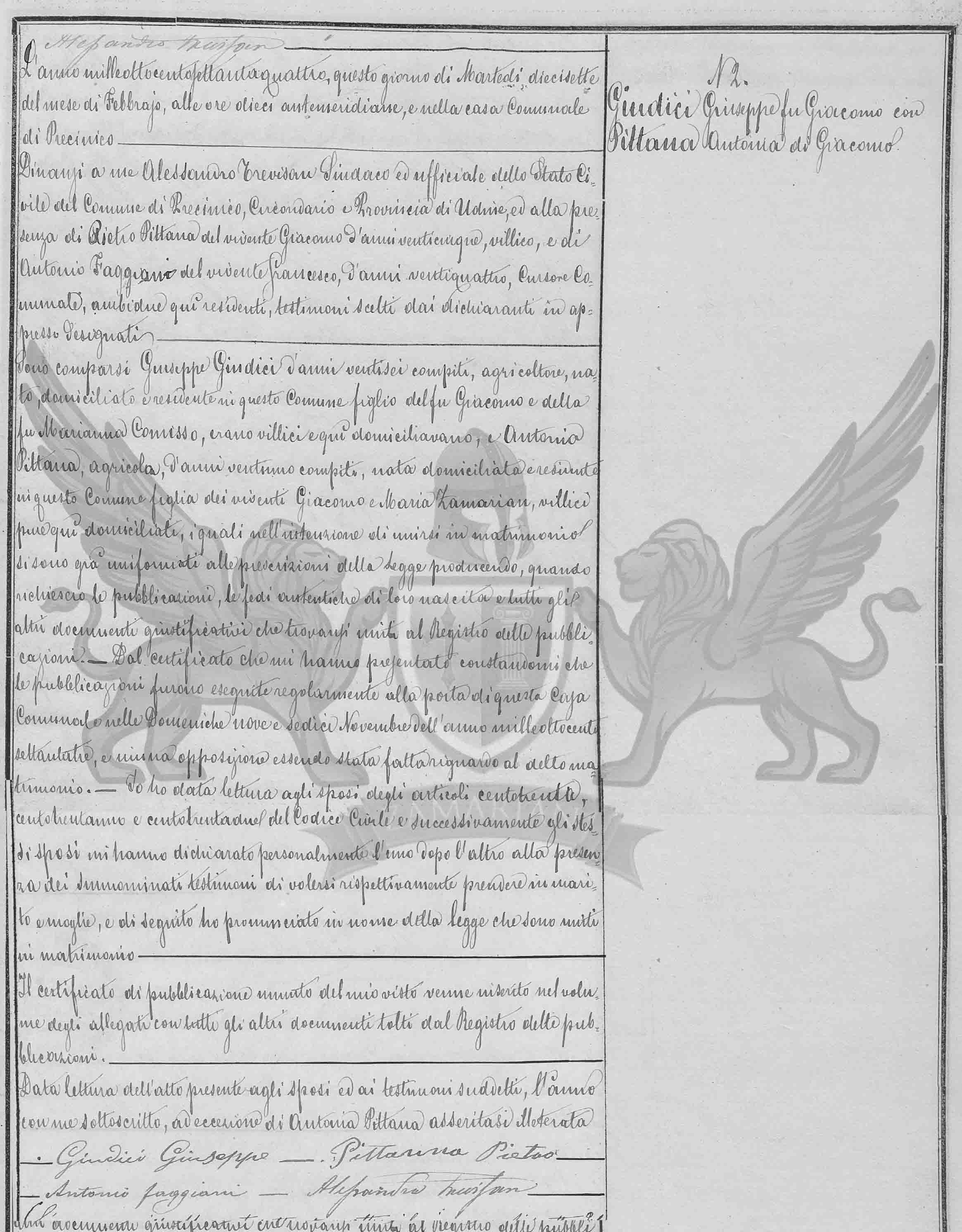 Compareceram Giuseppe Giudici de vinte e seis anos completos, agricultor, nascido domiciliado e residente neste Municipio filho do falecido Giacomo e da falecida Marianna Comisso, eram camponeses e aqui domiciliavam, e Antonia Pittana, agricultora, de vinte e um anos completos, nascida, domiciliada e residente neste Município, filha dos viventes Giacomo e Maria Zamarian, camponeses também aqui domiciliados, os quais na intenção de unirem-se em matrimônio já estão em conformidade com as prescrições da lei produzindo, quando requerido as publicações, as fé autênticas de seus nascimentos e todos os outros documentos justificativos que encontram-se unidos ao Registro das publicações. Do certificado que me apresentaram constando-me que as publicações foram exibidas regularmente à porta desta casa Municipal nos domingos nove e dezesseis de novembro do ano mil oitocentos e setenta e três, e nenhuma oposição sendo feita em relação ao dito matrimônio. Eu dei leitura aos esposos dos artigos cento trinta, cento e trinta e um e cento e trinta e dois do Código Civil e sucessivamente os mesmos esposos me declararam pessoalmente um após o outro à presença das supra nomeadas testemunhas de quererem respectivamente tomar por marido e mulher, e em seguida eu pronunciei em nome da lei que se uniram em matrimônio.