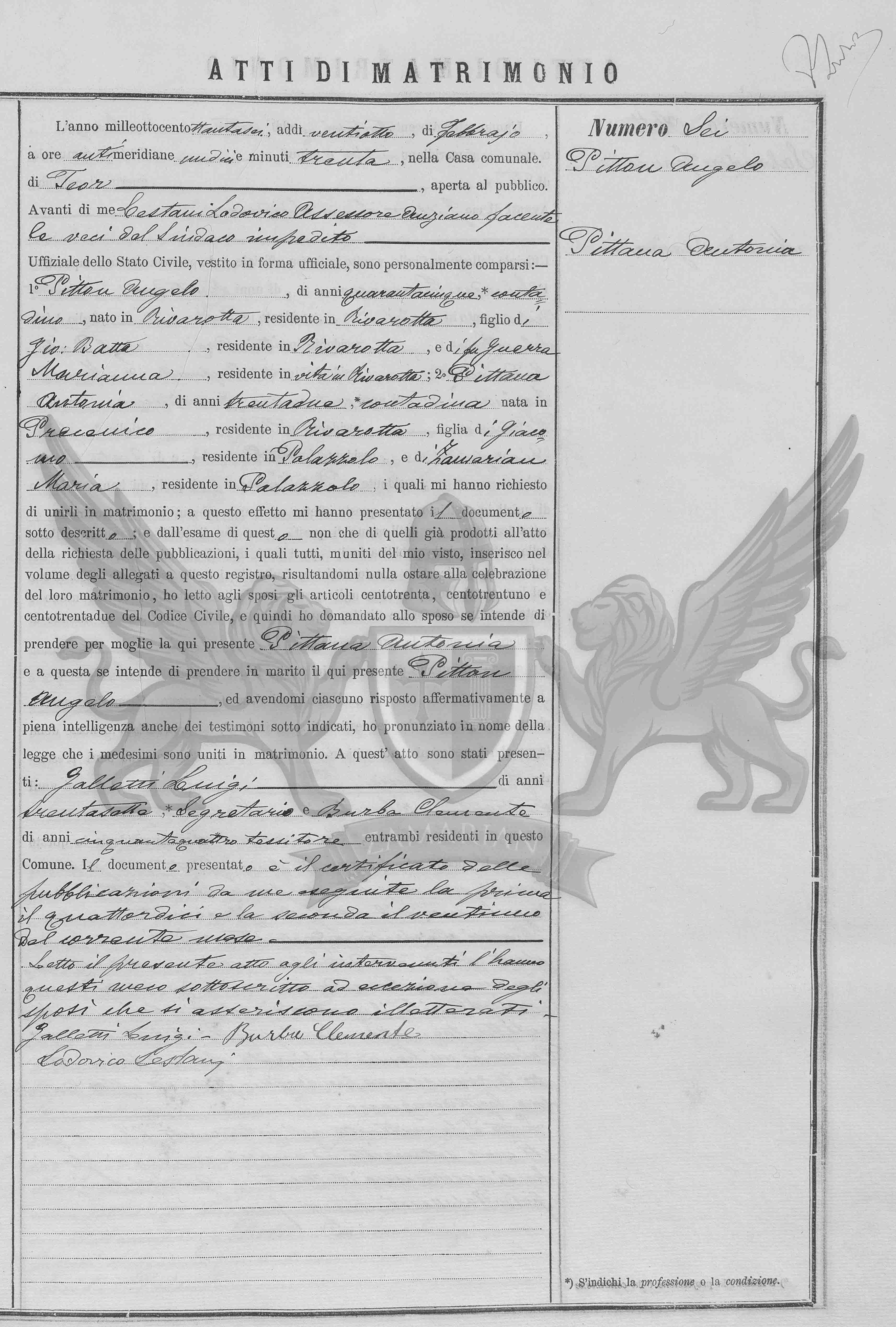 Diante de mim Lestani Ludovico assessor antigo fazendo as funções de Síndico impedido Oficial do Estado Civil, vestido em forma oficial, compareceram pessoalmente: 1º Pitton Angelo, de quarenta e cinco anos, *camponês, nascido em Rivarotta, residente em Rivarotta, filho de Gio Batta, residente em Rivarotta, e da finada Guerra Marianna, residente em vida em Rivarotta; 2º Pittana Antonia, de trinta e dois anos, *camponesa nascida em Precenicco, residente em Rivarotta, filha de Giacomo, residente em Palazzolo, e de Zamarian Maria, residente em Palazzolo, os quais me pediram para uni-los em matrimônio; a este efeito me apresentaram o documento abaixo descrito; e do exame deste também daqueles já produzidos no ato do requerimento das publicações, os quais todos munidos do meu visto, inseridos no volume dos anexos a este registro, resultando-me nada a impedir à celebração deste matrimônio, eu li aos nubentes os artigos cento e trinta, cento e trinta e um e cento e trinta e dois do Código Civil e então perguntei ao nubente se intende de tomar por mulher a aqui presente Pittana Antonia e a esta se entende de tomar por marido o aqui presente Pitton Angelo, e havendo-me cada um respondido de maneira afirmativa em plena inteligência inclusive para as testemunhas sub indicadas , pronunciei em nome da lei que os referidos foram unidos em matrimônio. A este ato estavam presentes: Galletti Luigi, de trinta e sete anos, *secretário e Barba Clemente, de cinquenta e quatro anos, *tecelão ambos presentes residentes neste Município.