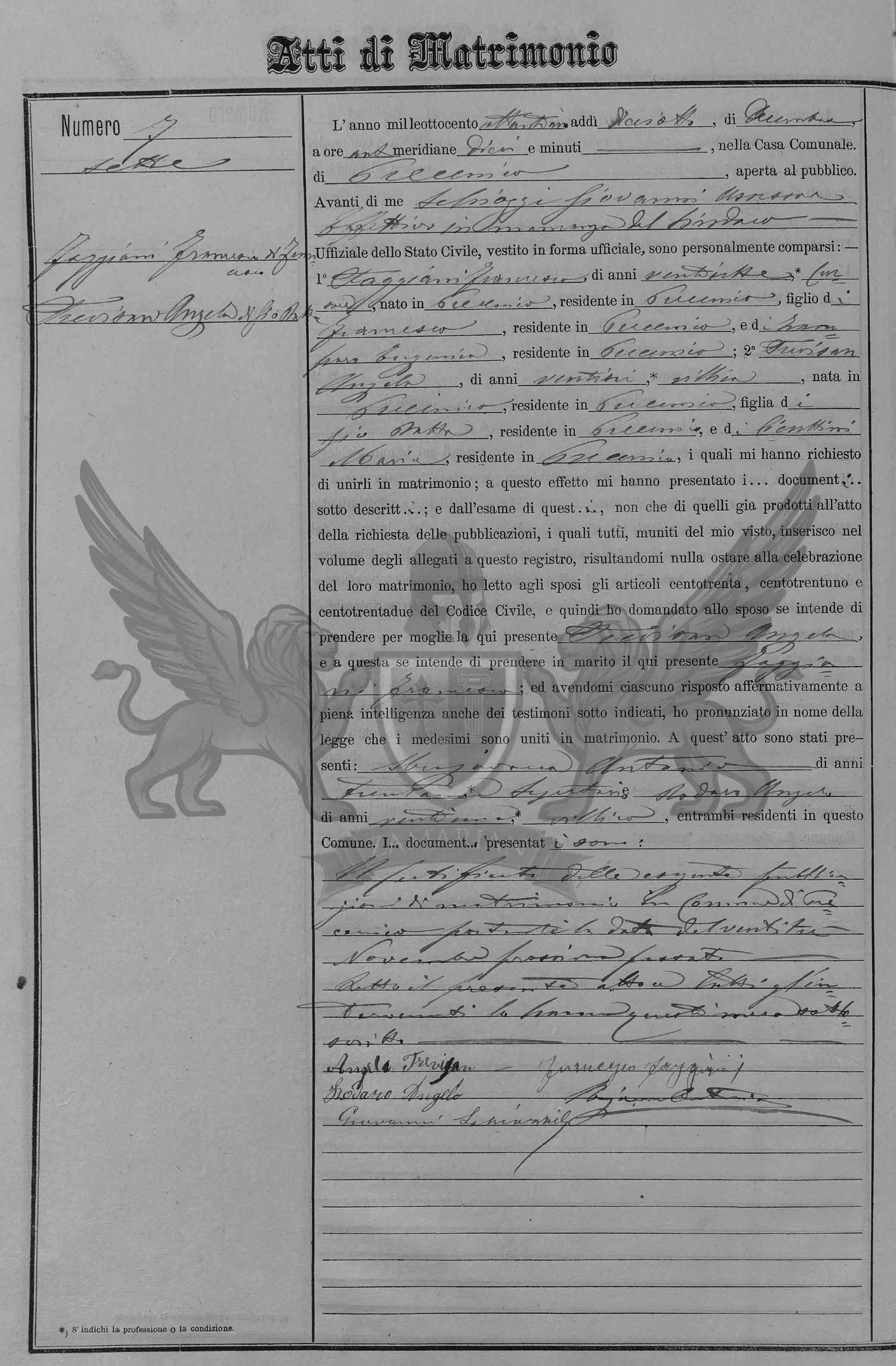 Diante de mim Schiozzi Giovanni delegado assessor efetivo na ausência do Síndico Oficial do Registro Civil, vestido em forma oficial, compareceram pessoalmente: 1º Faggiani Francesco, de vinte e três anos, cursor, nascido em Precenicco, residente em Precenicco, filho de Francesco, residente em Precenicco, e de Zamparo Eugenia, residente em Precenicco; 2º Trevisan Angela de vinte e seis anos, camponesa nascida em Precenicco, residente em Precenicco, filha de Giovanni Battista, residente em Precenicco, e de Cicuttini Maria, residente em Precenicco, os quais me pediram para uni-los em matrimônio; a este efeito me apresentaram os documentos abaixo descritos; e do exame destes também daqueles já produzidos no ato do requerimento das publicações, os quais todos munidos do meu visto, inseridos no volume dos anexos a este registro, resultando-me nada a impedir à celebração deste matrimônio, eu li aos nubentes os artigos cento e trinta, cento e trinta e um e cento e trinta e dois do Código Civil e então perguntei ao nubente se intende de tomar por mulher a aqui presente Trevisan Angela e a esta se intende de tomar por marido o aqui presente Faggiani Francesco, e havendo-me cada um respondido de maneira afirmativa em plena inteligência inclusive para as testemunhas sub indicadas , pronunciei em nome da lei que os referidos foram unidos em matrimônio. A este ato se apresentaram: Sbrajavacea Antonio de trinta anos secretário e Rodaro Angelo de vinte e um anos, camponês ambos presentes residentes neste Município. Os documentos apresentados são certificado das exibidas publicações de matrimônio no Município de Precenicco postados no dia vinte e três de novembro próximo passado.