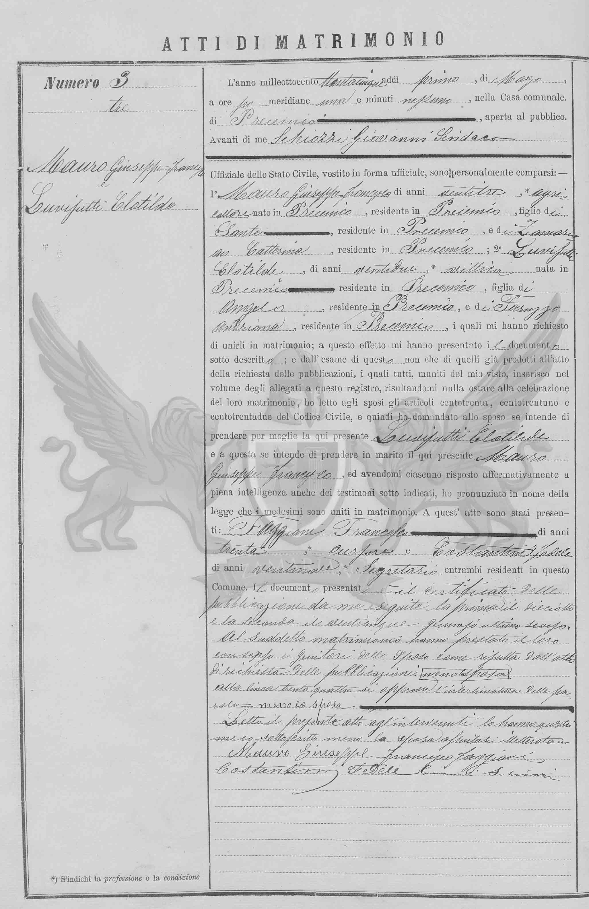 Diante de mim Domenighini Francesco segundo assessor não estando a disposição o síndico e o assessor mais antigo Oficial do Estado Civil, vestido em forma oficial, compareceram pessoalmente: 1º Pasiani Giuseppe, de trinta anos, *camponês, nascido em San Michele al Tagliamento, residente em Precenicco, filho do finado Antonio, residente em vida em Precenicco, e de Zamarian Catterina, residente em Precenicco; 2º Gigante Giustina, de vinte anos, *camponesa nascida em Fraforeano de Ronchis, residente em Fraforeano, filha de Luigi, residente em Fraforeano, e de Zanello Regina, residente em Fraforeano, os quais me pediram para uni-los em matrimônio; a este efeito me apresentaram os documentos abaixo descritos; e do exame destes também daqueles já produzidos no ato do requerimento das publicações, os quais todos munidos do meu visto, inseridos no volume dos anexos a este registro, resultando-me nada a impedir à celebração deste matrimônio, eu li aos nubentes os artigos cento e trinta, cento e trinta e um e cento e trinta e dois do Código Civil e então perguntei ao nubente se intende de tomar por mulher a aqui presente Gigante Giustina e a esta se entende de tomar por marido o aqui presente Pasiani Giuseppe, e havendo-me cada um respondido de maneira afirmativa em plena inteligência inclusive para as testemunhas sub indicadas , pronunciei em nome da lei que os referidos foram unidos em matrimônio. A este ato estavam presentes: Faggiani Francesco de trinta anos, *cursor e Costantini Fedele de vinte e nove anos, *secretário ambos presentes residentes neste Município.