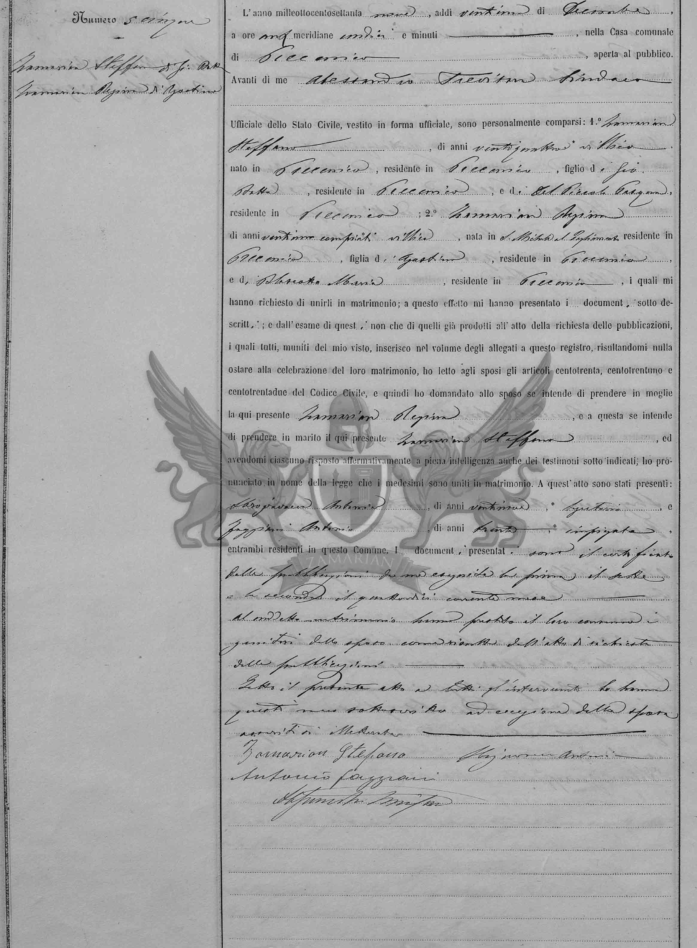 Diante de mim De Lorenzo Giovanni Síndico Oficial do Registro Civil, vestido em forma oficial, compareceram pessoalmente: 1º Zamarian Stefano de trinta e cinco anos, agricultor, nascido em Precenicco, filho de Gio Batta, residente em Precenicco, e de Del Piccolo Pasqua, residente Precenicco; 2º Barusso Maria de dezenove anos, agricultora nascida em Concordia, residente em Precenicco, filha de Giuseppe, residente em Precenicco, e de Leandrin Anna, residente em Precenicco, os quais me pediram para uni-los em matrimônio; a este efeito me apresentaram o documento abaixo descrito; e do exame deste também daqueles já produzidos no ato do requerimento das publicações, os quais todos munidos do meu visto, inseridos no volume dos anexos a este registro, resultando-me nada a impedir à celebração deste matrimônio, eu li aos nubentes os artigos cento e trinta, cento e trinta e um e cento e trinta e dois do Código Civil e então perguntei ao nubente se intende de tomar por mulher a aqui presente Barusso Maria e a esta se entende de tomar por marido o aqui presente Zamarian Stefano, e havendo-me cada um respondido de maneira afirmativa em plena inteligência inclusive para as testemunhas sub indicadas , pronunciei em nome da lei que os referidos foram unidos em matrimônio. A este ato se apresentaram: Fedele Costantini de trinta e cinco anos, secretário e Faggiani Francesco de trinta e seis anos, secretário ambos presentes residentes neste Município.