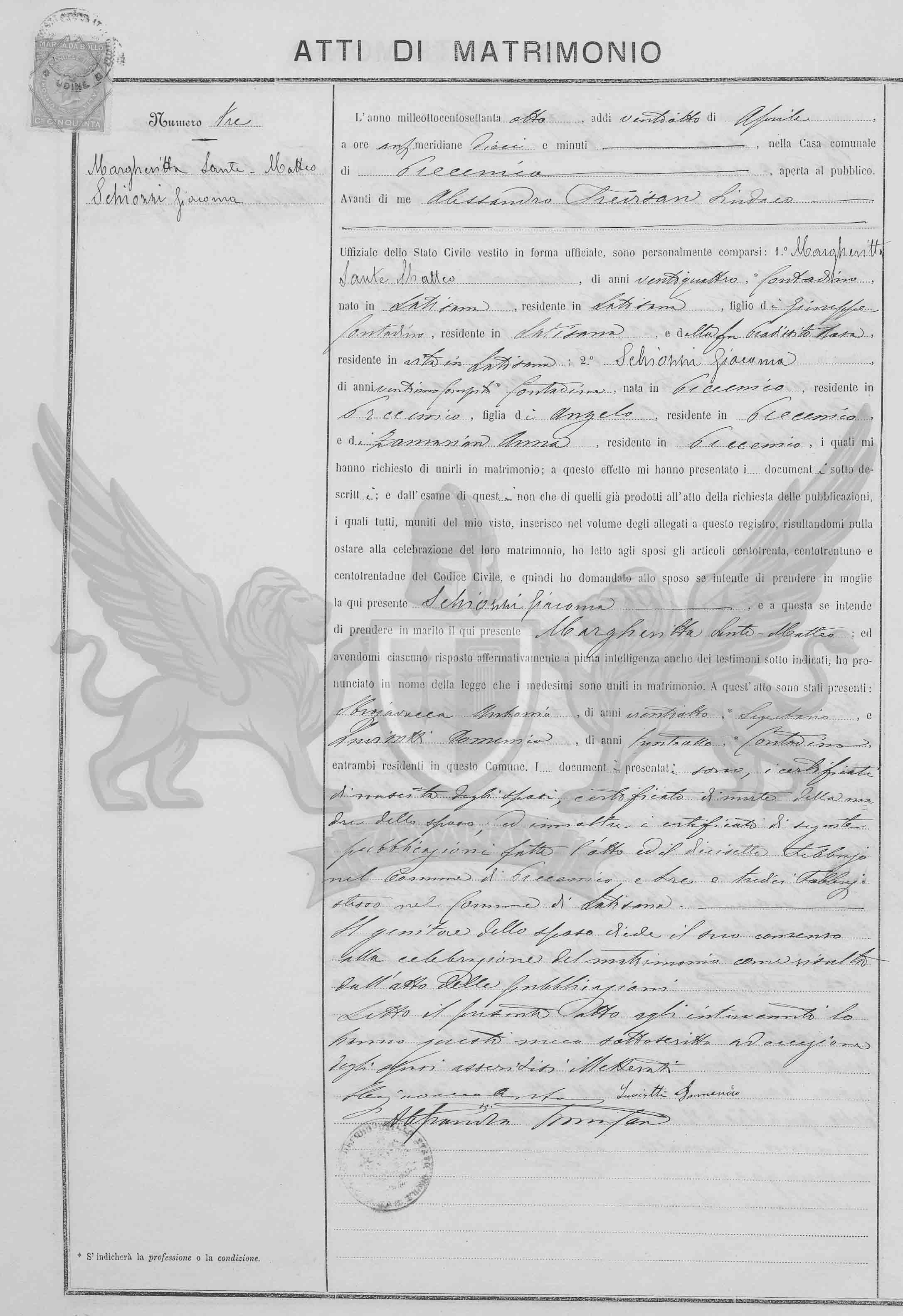 Diante de mim Alessandro Trevisan Síndico Oficial do Registro Civil, vestido em forma oficial, compareceram pessoalmente: 1º Margherita Sante Matteo, de vinte e quatro anos, camponês, nascido em Latisana, residente Latisana, filho de Giuseppe camponês, residente em Latisana, e da finada Pradissito Rosa, residente em Precenicco; 2º Schiozzi Giacoma de vinte e um anos completos, camponesa nascida em Precenicco, residente em Precenicco, filha de Angelo, residente em vida em Precenicco, e de Zamarian Anna, residente em vida em Precenicco, os quais me pediram para uni-los em matrimônio; a este efeito me apresentaram os documentos abaixo descritos; e do exame destes também daqueles já produzidos no ato do requerimento das publicações, os quais todos munidos do meu visto, inseridos no volume dos anexos a este registro, resultando-me nada a impedir à celebração deste matrimônio, eu li aos nubentes os artigos cento e trinta, cento e trinta e um e cento e trinta e dois do Código Civil e então perguntei ao nubente se intende de tomar por mulher a aqui presente Schiozzi Giacoma e a esta se entende de tomar por marido o aqui presente Margheritta Santo-Matteo, e havendo-me cada um respondido de maneira afirmativa em plena inteligência inclusive para as testemunhas sub indicadas , pronunciei em nome da lei que os referidos foram unidos em matrimônio. A este ato se apresentaram: Sbrojavacea Antonio de vinte e oito anos, secretário e Luvisutti Domenico de vinte anos, contadino ambos presentes residentes neste Município. Os documentos apresentados são os certificados das exibidas publicações de matrimônio por mim e pelo oficial do registro civil do município de Teor nos dois domingos trinta de agosto e seis de setembro de mil oitocentos e noventa e um.