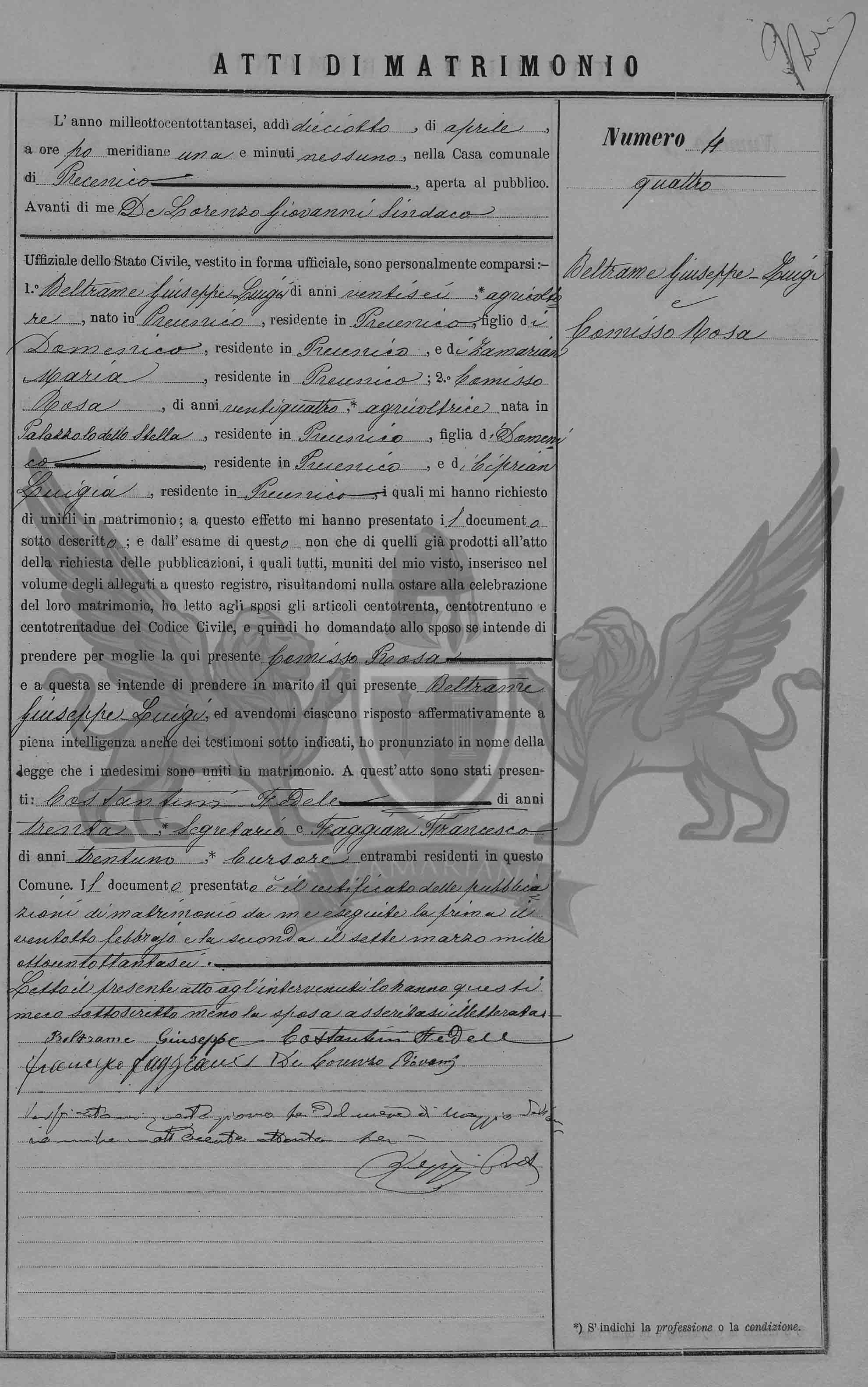Diante de mim De Lorenzo Giovanni Síndico Oficial do Estado Civil, vestido de forma oficial, compareceram pessoalmente: 1º Beltrame Giuseppe Luigi, de vinte e seis anos, *agricultor, nascido em Precenicco, residente em Precenicco, filho de Domenico, residente em Precenicco, e de Zamarian Maria, residente em Precenicco; 2º Comisso Rosa de vinte e quatro anos, *agricultora nascida em Palazzolo dello Stella, residente em Precenicco, filha de Domenico, residente em Precenicco, e de Ciprian Luigia, residente em Precenicco, os quais me requereram de uni-los-los em matrimônio; a este efeito me apresentaram o documento sub descrito; e do exame deste também daqueles já produzidos no ato do requerimento das publicações, os quais todos munidos do meu visto, inseri no volume dos anexos deste registro, resultando-me nada a obstruir a celebração do matrimônio deles, li aos esposos os artigos cento e trinta, cento e trinta e um e cento e trinta e dois do Código Civil e então perguntei ao esposo se intende de tomar por mulher a aqui presente Comisso Rosa e a este se intende tomar por marido o aqui presente Beltrame Giuseppe Luigi, e havendo-me cada um respondido afirmativamente em plena inteligência também às testemunhas sub indicadas, pronunciei em nome da lei que os referidos se uniram em matrimônio.