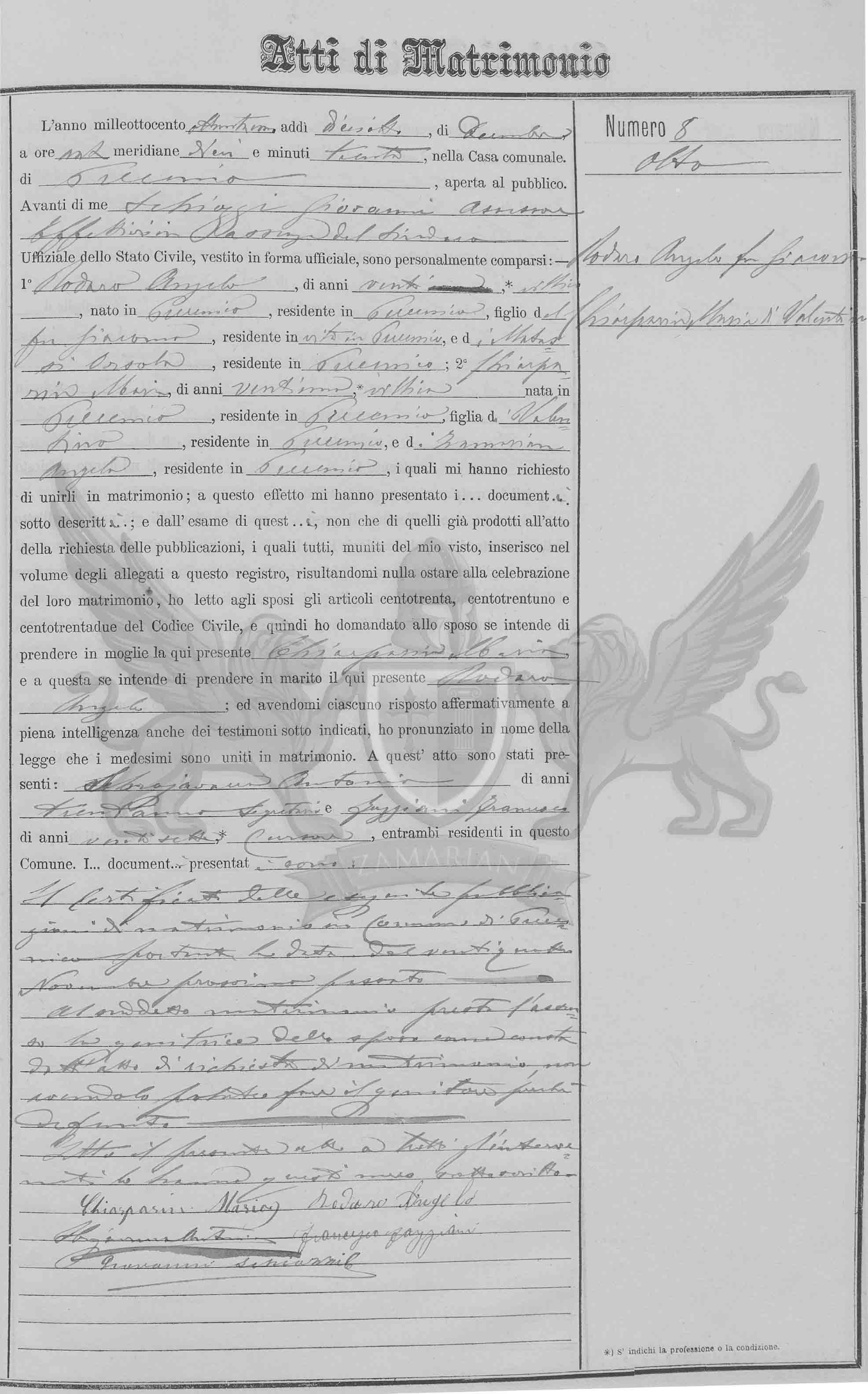 Diante de mim Schiozzi Giovanni assessor efetivo na ausência do Síndico Oficial do Registro Civil, vestido em forma oficial, compareceram pessoalmente: 1º Rodaro Angelo de vinte anos, camponês, nascido em Precenicco, residente em Precenicco, filho do finado Giacomo, residente em vida em Precenicco, e de Matassi Orsola, residente em Precenicco; 2º Chiarparin Maria de vinte e um anos, camponesa nascida em Precenicco, residente em Precenicco, filha de Valentino, residente em vida em Precenicco, e de Zamarian Angela, residente em vida em Precenicco, os quais me pediram para uni-los em matrimônio; a este efeito me apresentaram os documentos abaixo descritos; e do exame destes também daqueles já produzidos no ato do requerimento das publicações, os quais todos munidos do meu visto, inseridos no volume dos anexos a este registro, resultando-me nada a impedir à celebração deste matrimônio, eu li aos nubentes os artigos cento e trinta, cento e trinta e um e cento e trinta e dois do Código Civil e então perguntei ao nubente se intende de tomar por mulher a aqui presente Chiarparin Maria e a esta se entende de tomar por marido o aqui presente Rodaro Angelo, e havendo-me cada um respondido de maneira afirmativa em plena inteligência inclusive para as testemunhas sub indicadas , pronunciei em nome da lei que os referidos foram unidos em matrimônio. A este ato se apresentaram: Sbrajavacea Antonio de trinta e um anos, secretário e Faggiani Francesco de vinte e sete anos, cursor ambos presentes residentes neste Município. Os documentos apresentados são os certificados das publicações de matrimônio no Município de Precenicco postadas na data de vinte e quatro de novembro passado.