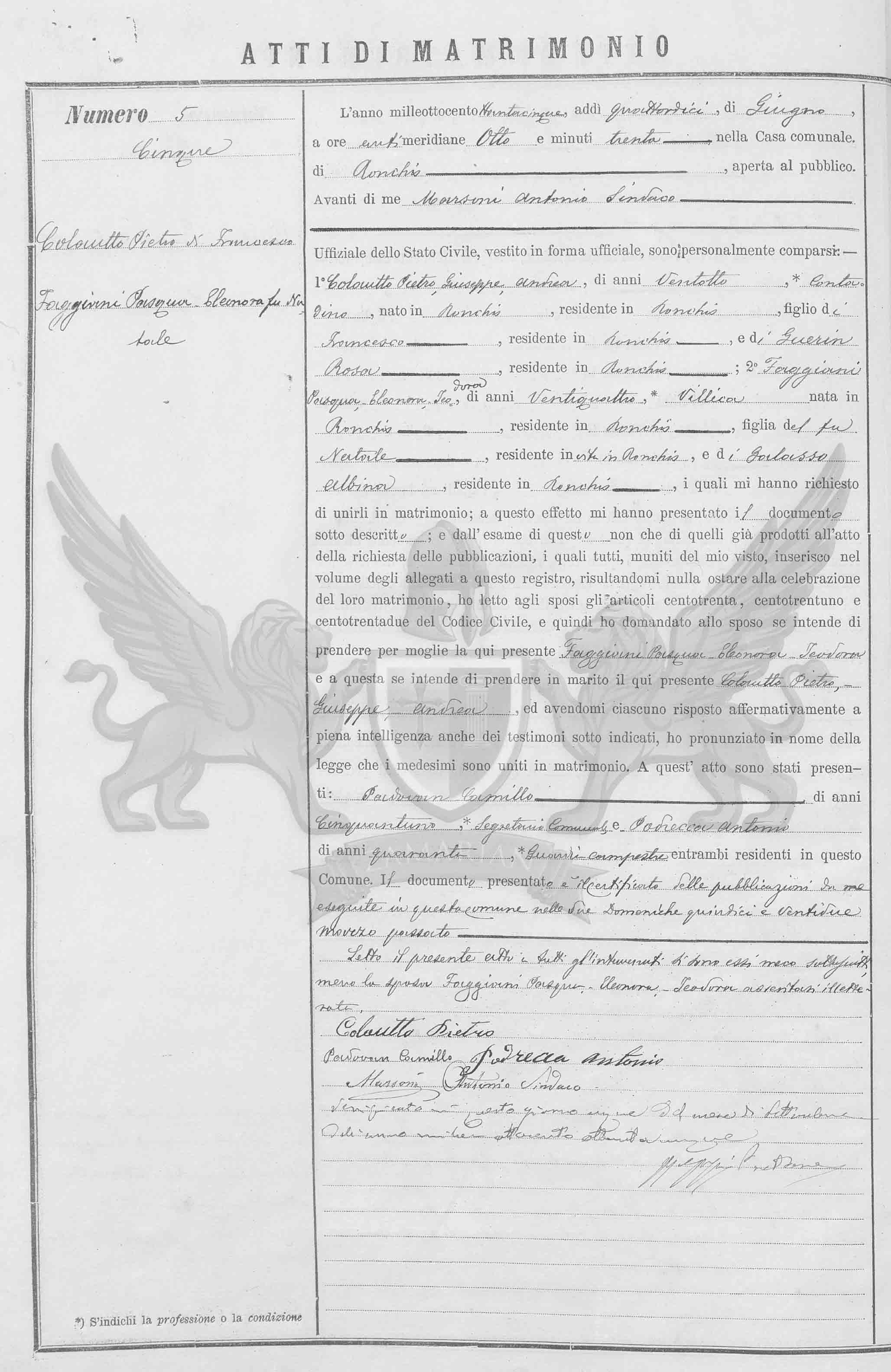 Diante de mim Marsoni Antonio Síndico Oficial do Registro Civil, vestido em forma oficial, compareceram pessoalmente: 1º Colautto Pietro Giuseppe-Andrea, de vinte e oito anos, *camponês, nascido em Ronchis, residente em Ronchis, filho de Francesco, residente em Ronchis, e de Guerin Rosa, residente em Ronchis; 2º Faggiani Pasqua-Eleonora-Teodora, de vinte e quatro anos, *camponesa nascida em Ronchis, residente em Ronchis, filha do finado Natale, residente em vida em Ronchis, e de Galasso Albina, residente em Ronchis, os quais me pediram para uni-los em matrimônio; a este efeito me apresentaram o documento abaixo descrito; e do exame deste também daqueles já produzidos no ato do requerimento das publicações, os quais todos munidos do meu visto, inseridos no volume dos anexos a este registro, resultando-me nada a impedir à celebração deste matrimônio, eu li aos nubentes os artigos cento e trinta, cento e trinta e um e cento e trinta e dois do Código Civil e então perguntei ao nubente se intende de tomar por mulher a aqui presente Faggiani Pasqua-Eleonora-Teodora e a esta se entende de tomar por marido o aqui presente Colautto Pietro-Giuseppe-Andrea, e havendo-me cada um respondido de maneira afirmativa em plena inteligência inclusive para as testemunhas sub indicadas , pronunciei em nome da lei que os referidos foram unidos em matrimônio. A este ato estavam presentes: Padovan Camillo, de cinquenta e um anos, *secretário municipal e Padrecia Antonio de quarenta anos, *guarda campestre ambos presentes residentes neste Município.