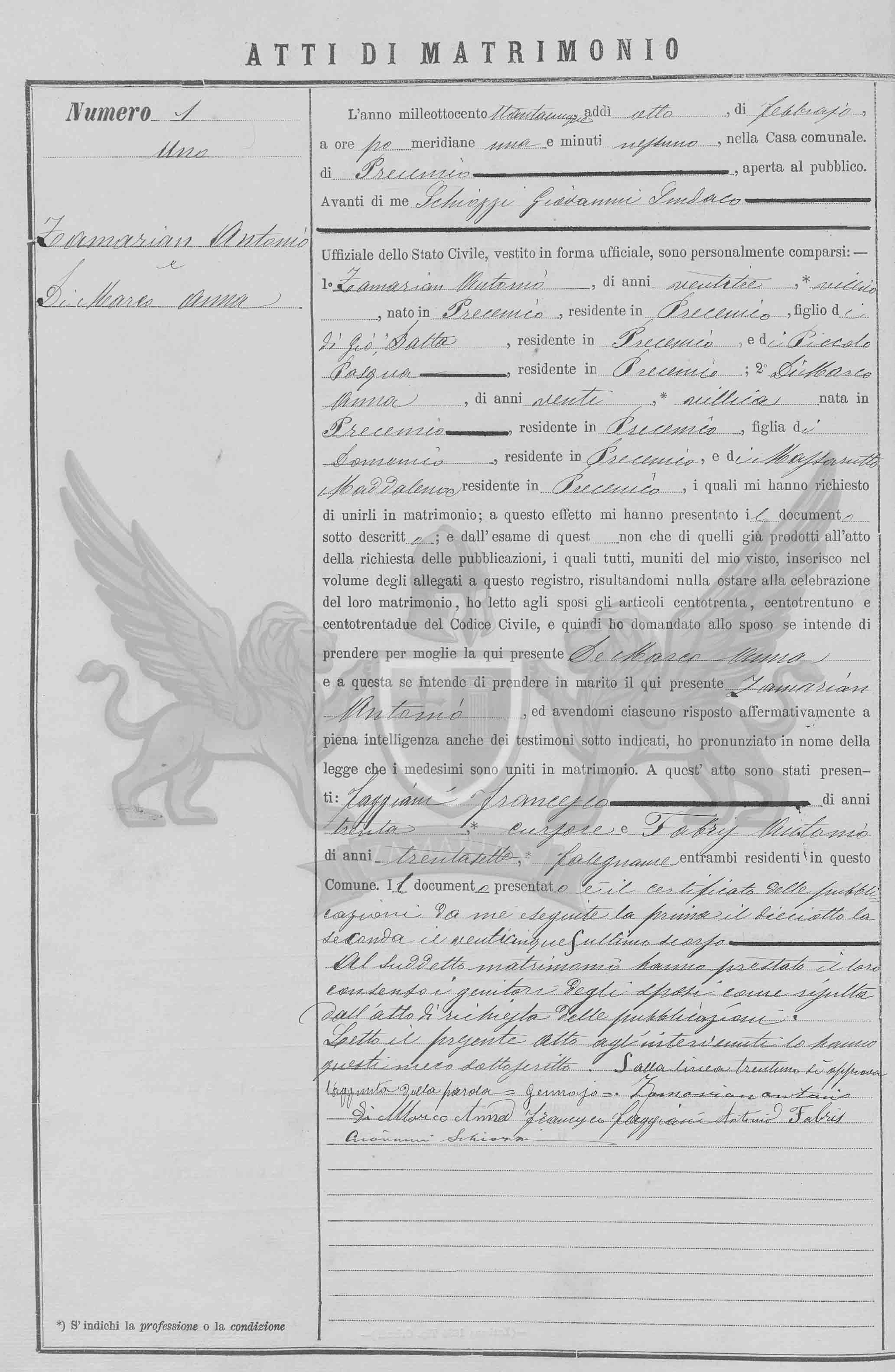 Diante de mim Peliozzi Giovanni Síndico Oficial do Registro Civil, vestido em forma oficial, compareceram pessoalmente: 1º Zamarian Antonio de vinte e três anos, camponês, nascido em Precenicco, residente em Precenicco, filho de Gio Batta, residente em Precenicco, e de Piccolo Pasqua, residente Precenicco; 2º Di Marco Anna de vinte anos, camponesa nascida em Precenicco, residente em Precenicco, filha de Domenico, residente em Precenicco, e Massarutto Maddalena, residente em Precenicco, os quais me pediram para uni-los em matrimônio; a este efeito me apresentaram o documento abaixo descrito; e do exame deste também daqueles já produzidos no ato do requerimento das publicações, os quais todos munidos do meu visto, inseridos no volume dos anexos a este registro, resultando-me nada a impedir à celebração deste matrimônio, eu li aos nubentes os artigos cento e trinta, cento e trinta e um e cento e trinta e dois do Código Civil e então perguntei ao nubente se intende de tomar por mulher a aqui presente De Marco Anna e a esta se entende de tomar por marido o aqui presente Zamarian Antonio, e havendo-me cada um respondido de maneira afirmativa em plena inteligência inclusive para as testemunhas sub indicadas , pronunciei em nome da lei que os referidos foram unidos em matrimônio. A este ato se apresentaram: Faggiani Francesco de trinta, cursor e Fabris Antonio de trinta e sete anos, marceneiro ambos presentes residentes neste Município.