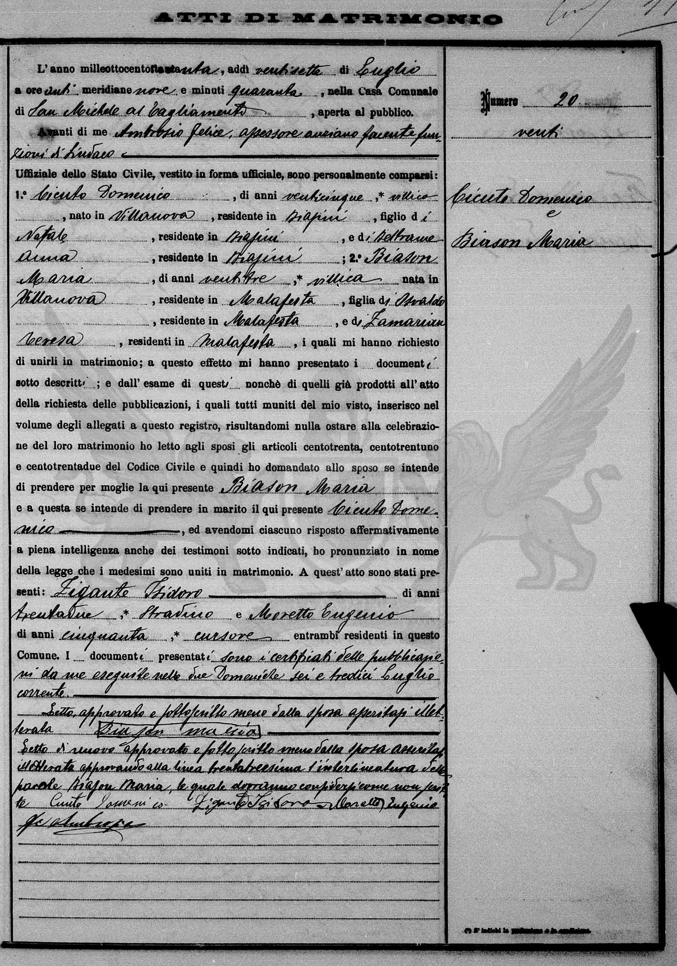 Diante de mim Ambrosio Felice, assessor mais antigo fazendo funções de Síndico Oficial do Estado Civil, vestido em forma oficial, pessoalmente compareceram: 1º Cicuto Domenico, de vinte e cinco anos, *camponês, nascido em Villanova, residente em Malafesta, filho de Natale, residente em Biasini, e de Beltrame Anna, residente Biasini; 2º Biason Maria de vinte e três anos, *camponesa nascida em Villanova, residente em Malafesta, filha de Osvaldo, residente em Malafesta, e de Zamarian Teresa, residente em Malafesta, os quais me solicitaram de uni-los em matrimônio; a este efeito me apresentaram os documentos abaixo descritos; e do exame destes e também daqueles já produzidos no ato da solicitação das publicações, os quais todos munidos do meu visto, inseri no volume dos anexos a este registro, resultando-me nada a impedir a celebração do matrimônio deles, li aos nubentes os artigos cento e trinta, cento e trinta e um e cento e trinta e dois do Código Civil e então perguntei ao nubente se intende tomar por mulher a aqui presente Biason Maria e a esta se intende de tomar por marido o aqui presente Cicuto Domenico, e tendo cada um respondido de maneira afirmativa em plena inteligência inclusive diante das testemunhas sub indicadas, pronunciei em nome da lei que os nubentes foram unidos em matrimônio. A este ato estiveram presentes: Zigante Isidoro de trinta e dois anos, *pavimentador e Moretto Eugenio de cinquenta anos, *cursor ambos presentes residentes neste Município. Os documentos apresentados são os certificados das publicações por mim exibidas nos dois domingos seis e treze de julho corrente.