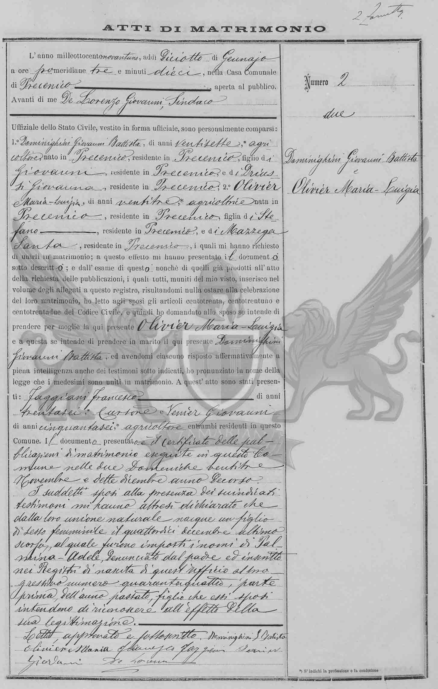 Diante de mim De Lorenzo Giovanni Síndico Oficial do Estado Civil, vestido em forma oficial, compareceram pessoalmente: 1º Dominighini Giovanni Battista, de vinte e sete anos, agricultor, nascido em Precenicco, residente em Precenicco, filho de Giovanni, residente em Precenicco, e de Driussi Giovanna, residente em Precenicco; 2º Olivier Maria-Luigia, de vinte e três anos, agricultora nascida em Precenicco, residente em Precenicco, filha de Stefano, residente em Precenicco, e de Mazzega Santa, residente em Precenicco, os quais me pediram para uni-los em matrimônio; a este efeito me apresentaram o documento abaixo descrito; e do exame deste também daqueles já produzidos no ato do requerimento das publicações, os quais todos munidos do meu visto, inseridos no volume dos anexos a este registro, resultando-me nada a impedir à celebração deste matrimônio, eu li aos nubentes os artigos cento e trinta, cento e trinta e um e cento e trinta e dois do Código Civil e então perguntei ao nubente se intende de tomar por mulher a aqui presente Biasin Anna Isolina e a esta se entende de tomar por marido o aqui presente Olivier Maria-Luigia, e havendo-me cada um respondido de maneira afirmativa em plena inteligência inclusive para as testemunhas sub indicadas , pronunciei em nome da lei que os referidos foram unidos em matrimônio. A este ato se apresentaram: Faggiani Francesco de trinta e seis anos cursor e Venier Giovanni de cinquenta e seis anos, *agricultor ambos residentes neste Município.