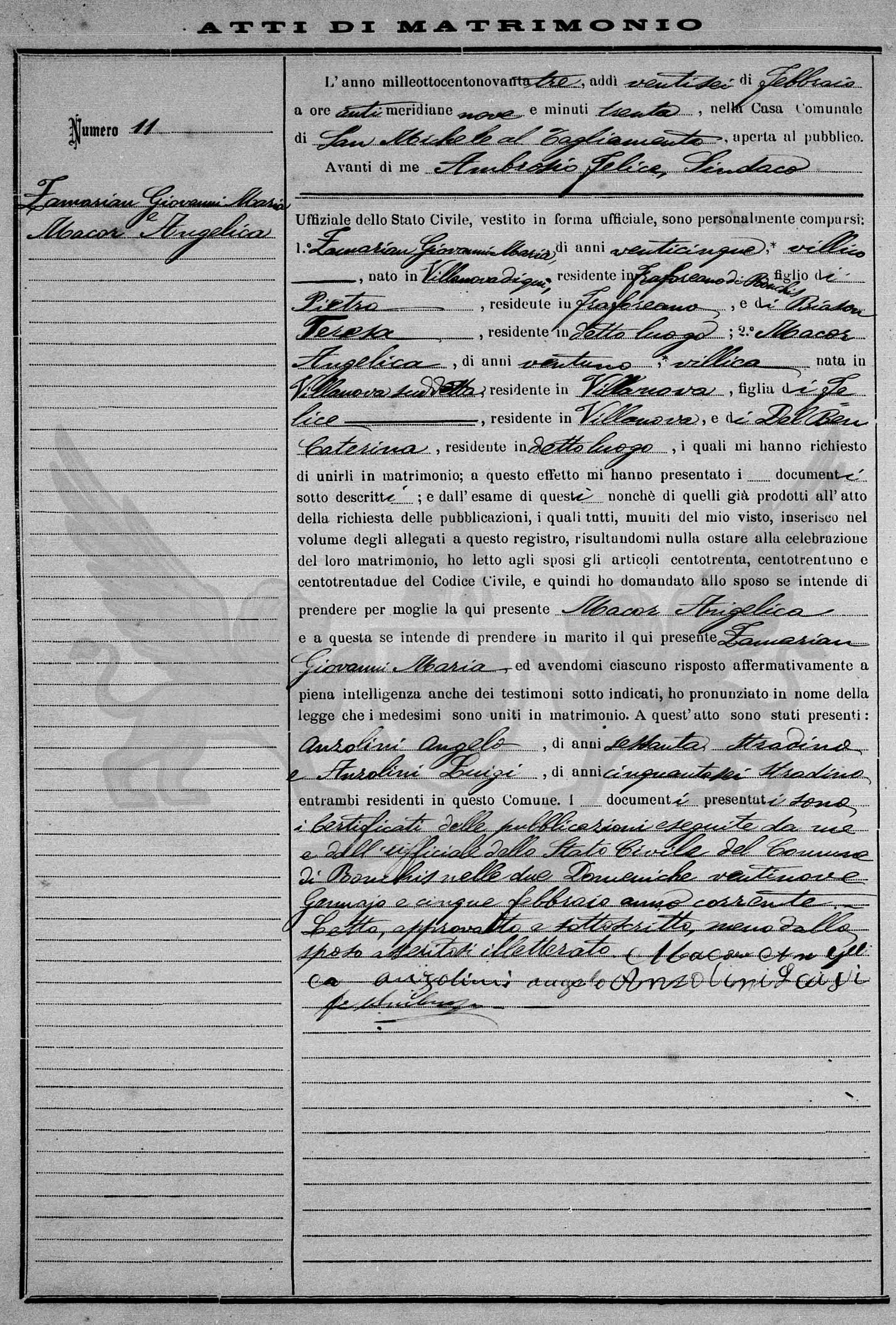 Diante de mim Ambrosio Felice, Síndico, Oficial do Registro Civil, vestido em forma oficial, compareceram pessoalmente: 1º Zamarian Giovanni Maria, de vinte e cinco anos, *camponês, nascido em Villanova daqui, residente em Fraforeano de Ronchis, filho de Pietro, residente em Fraforeano, e de Biason Teresa, residente no dito local; 2º Biason Teresa, de vinte e um anos, *camponesa nascida em Villanova supracitada, residente em Villanova, filha de Felice, residente em Villanova, e de Del Ben Caterina, residente em dito local, os quais me pediram para uni-los em matrimônio; a este efeito me apresentaram os documentos abaixo descritos; e do exame destes também daqueles já produzidos no ato do requerimento das publicações, os quais todos munidos do meu visto, inseridos no volume dos anexos a este registro, resultando-me nada a impedir à celebração deste matrimônio, eu li aos nubentes os artigos cento e trinta, cento e trinta e um e cento e trinta e dois do Código Civil e então perguntei ao nubente se intende de tomar por mulher a aqui presente Macor Angelica e a esta se entende de tomar por marido o aqui presente Zamarian Giovanni Maria, e havendo-me cada um respondido de maneira afirmativa em plena inteligência inclusive para as testemunhas sub indicadas , pronunciei em nome da lei que os referidos foram unidos em matrimônio. A este ato estavam presentes: Anzolini Angelo, de sessenta anos, calceteiro e Anzolini Luigi de cinquenta e seis anos, *calceteiro ambos presentes residentes neste Município. Os documentos apresentados são os certificados das publicações por mim exibidas e pelo Oficial do Estado Civil do Município de Ronchis nos dois domingos vinte e nove de janeiro e cinco de fevereiro do ano corrente.
