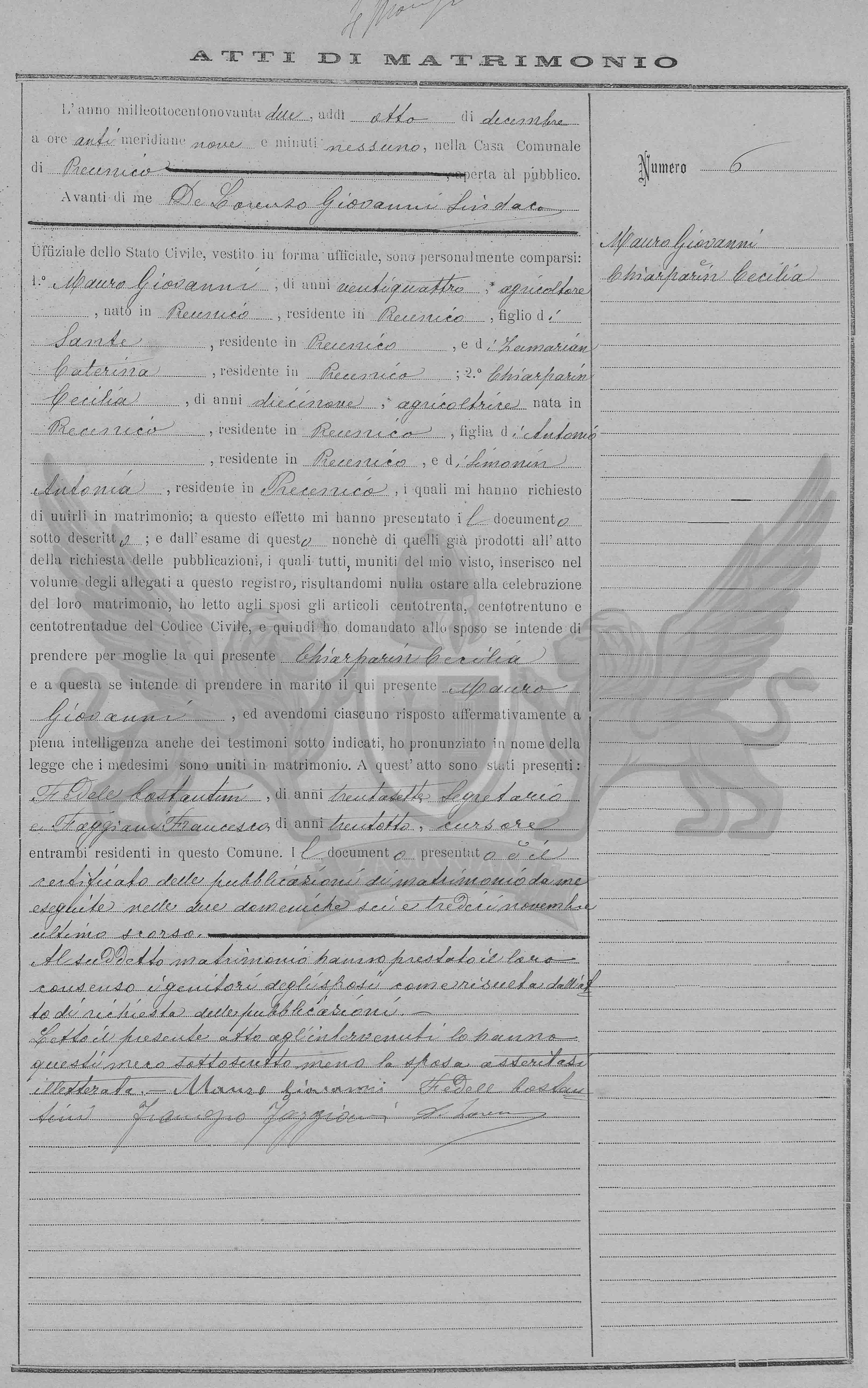 Ano mil oitocentos e noventa e dois aos oito dias de dezembro, às nove horas da manhã, na Casa Municipal de Precenicco, aberta ao público.