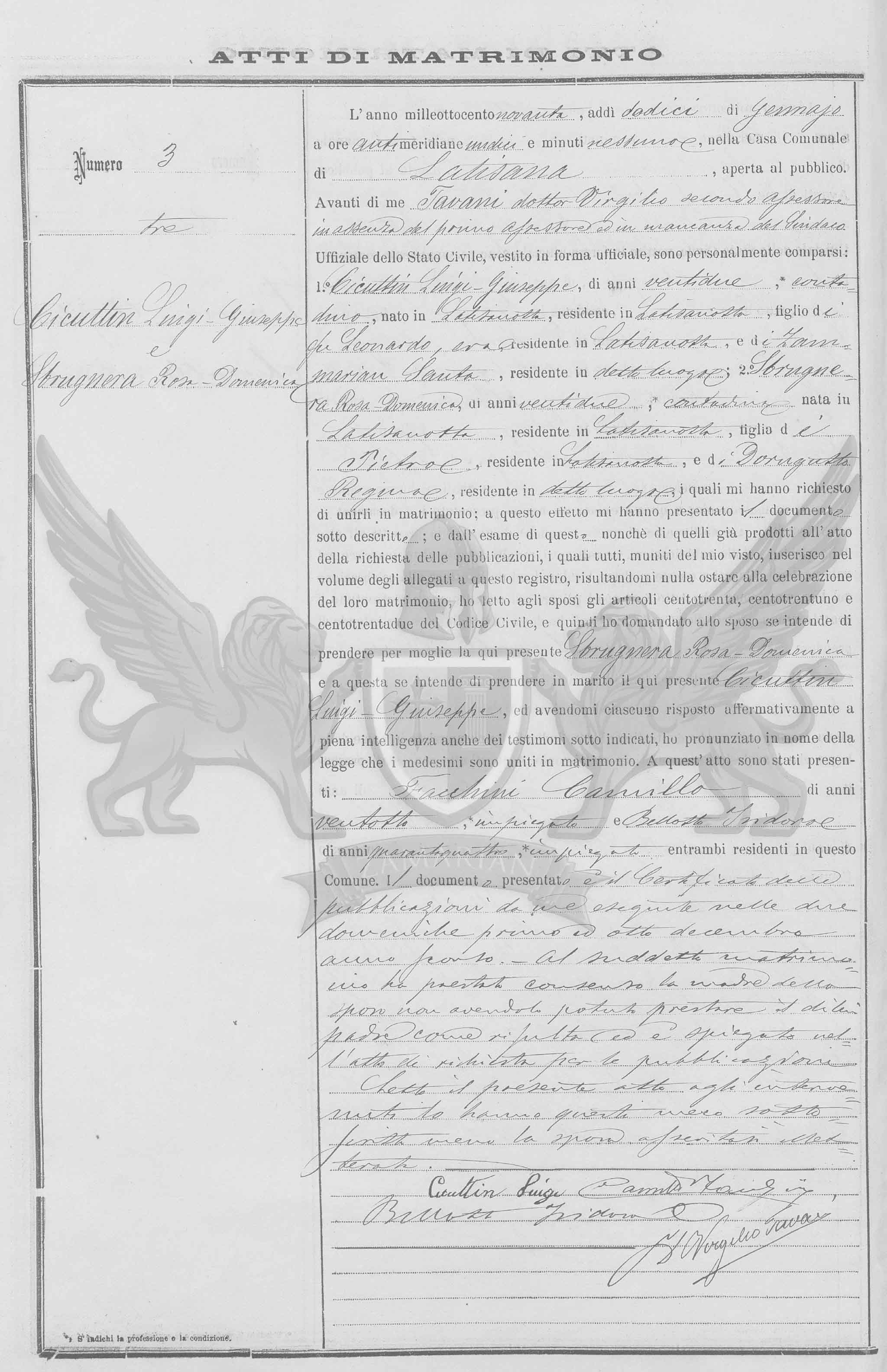 Diante de mim Tavani doutor Virgilio segundo assessor na ausência do primeiro assessor e na falta do Síndico Oficial do Registro Civil, vestido em forma oficial, compareceram pessoalmente: 1º Cicuttin Luigi-Giuseppe de vinte e dois anos, camponês, nascido em Latisanotta, residente em Latisanotta, filho do finado Leonardo, era residente em Latisanotta, e de Zammarian Santa, residente no referido local; 2º Sbrugnera Rosa-Domenica de vinte e dois anos, agricultora nascida em Latisanotta, residente em Latisanotta, filha de Pietro, residente em Latisanotta, e Dorigutto Regina, residente no citado local, os quais me pediram para uni-los em matrimônio; a este efeito me apresentaram o documento abaixo descrito; e do exame deste também daqueles já produzidos no ato do requerimento das publicações, os quais todos munidos do meu visto, inseridos no volume dos anexos a este registro, resultando-me nada a impedir à celebração deste matrimônio, eu li aos nubentes os artigos cento e trinta, cento e trinta e um e cento e trinta e dois do Código Civil e então perguntei ao nubente se intende de tomar por mulher a aqui presente Sbrugnera Rosa-Domenica e a esta se entende de tomar por marido o aqui presente Cicutti Luigi-Giuseppe, e havendo-me cada um respondido de maneira afirmativa em plena inteligência inclusive para as testemunhas sub indicadas , pronunciei em nome da lei que os referidos foram unidos em matrimônio. A este ato se apresentaram: Facchin Camillo de vinte e oito anos, empregado e Belotto Isidoro de quarenta e quatro anos, empregado ambos presentes residentes neste Município.