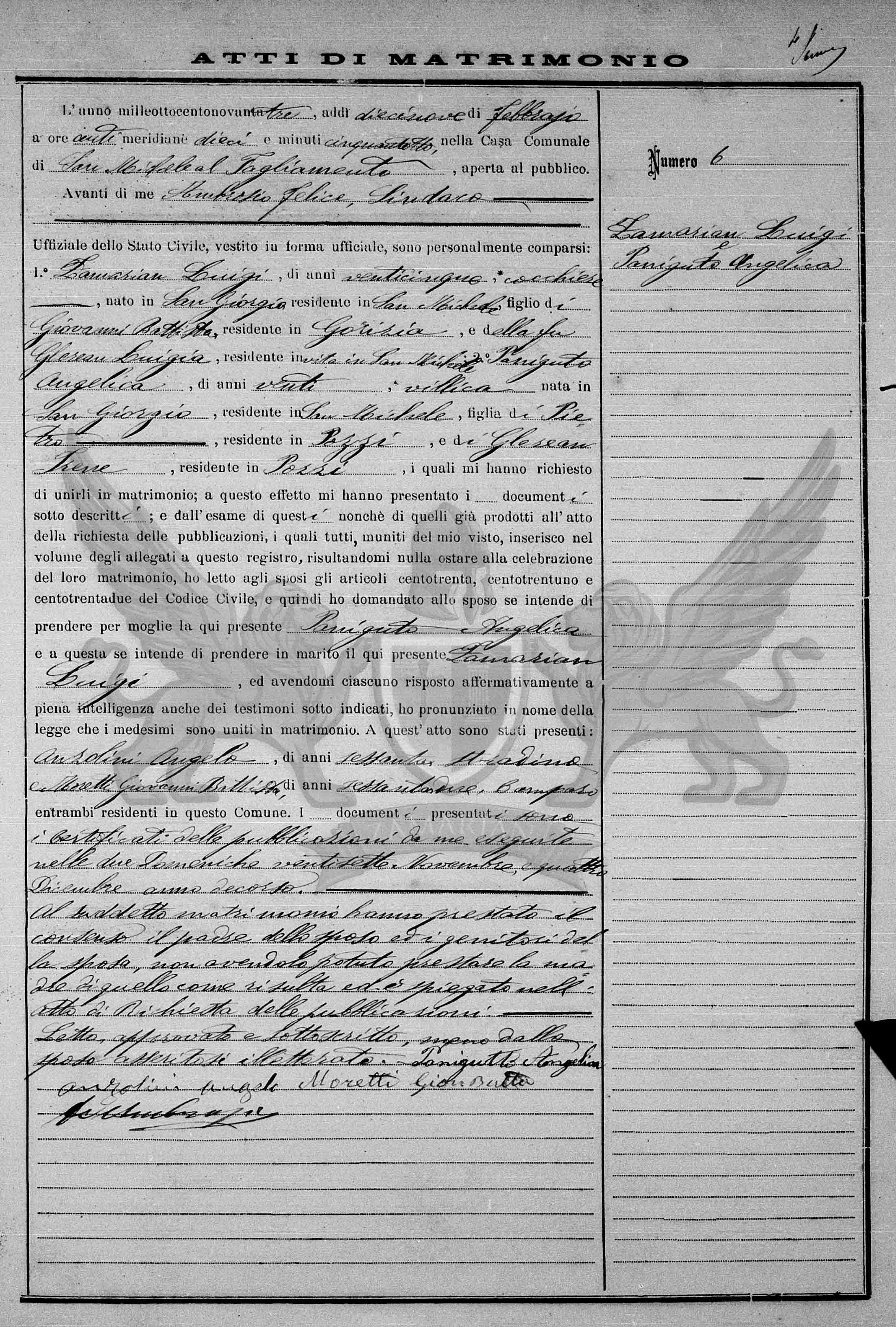 Diante de mim Ambrosio Felice, Síndico Oficial do Registro Civil, vestido em forma oficial, compareceram pessoalmente: 1º Zamarian Luigi, de vinte e cinco anos, *cocheiro, nascido em San Giorgio, residente em San Michele, filho de Giovanni Battista, residente em Gorizia, e da finada Glerean Luigia, residente em vida em San Michele; 2º Paniguto Angelica, de vinte anos, *camponesa nascida em San Giorgio, residente em San Michele, filha de Pietro, residente em Pozzi, e de Glerean Irene, residente em Pozzi, os quais me pediram para uni-los em matrimônio; a este efeito me apresentaram o documento abaixo descrito; e do exame deste também daqueles já produzidos no ato do requerimento das publicações, os quais todos munidos do meu visto, inseridos no volume dos anexos a este registro, resultando-me nada a impedir à celebração deste matrimônio, eu li aos nubentes os artigos cento e trinta, cento e trinta e um e cento e trinta e dois do Código Civil e então perguntei ao nubente se intende de tomar por mulher a aqui presente Paniguto Angelica e a esta se entende de tomar por marido o aqui presente Zamarian Luigi, e havendo-me cada um respondido de maneira afirmativa em plena inteligência inclusive para as testemunhas sub indicadas , pronunciei em nome da lei que os referidos foram unidos em matrimônio. A este ato estavam presentes: Anzolini Angelo, de sessenta anos, *Operário de estradas e Moretti Giovanni Battista de sessenta e dois anos, *Operário de canais ambos presentes residentes neste Município. Os documentos apresentados são os certificados das publicações por mim exibidas nos dois domingos vinte e sete de novembro e quatro de dezembro do ano passado.