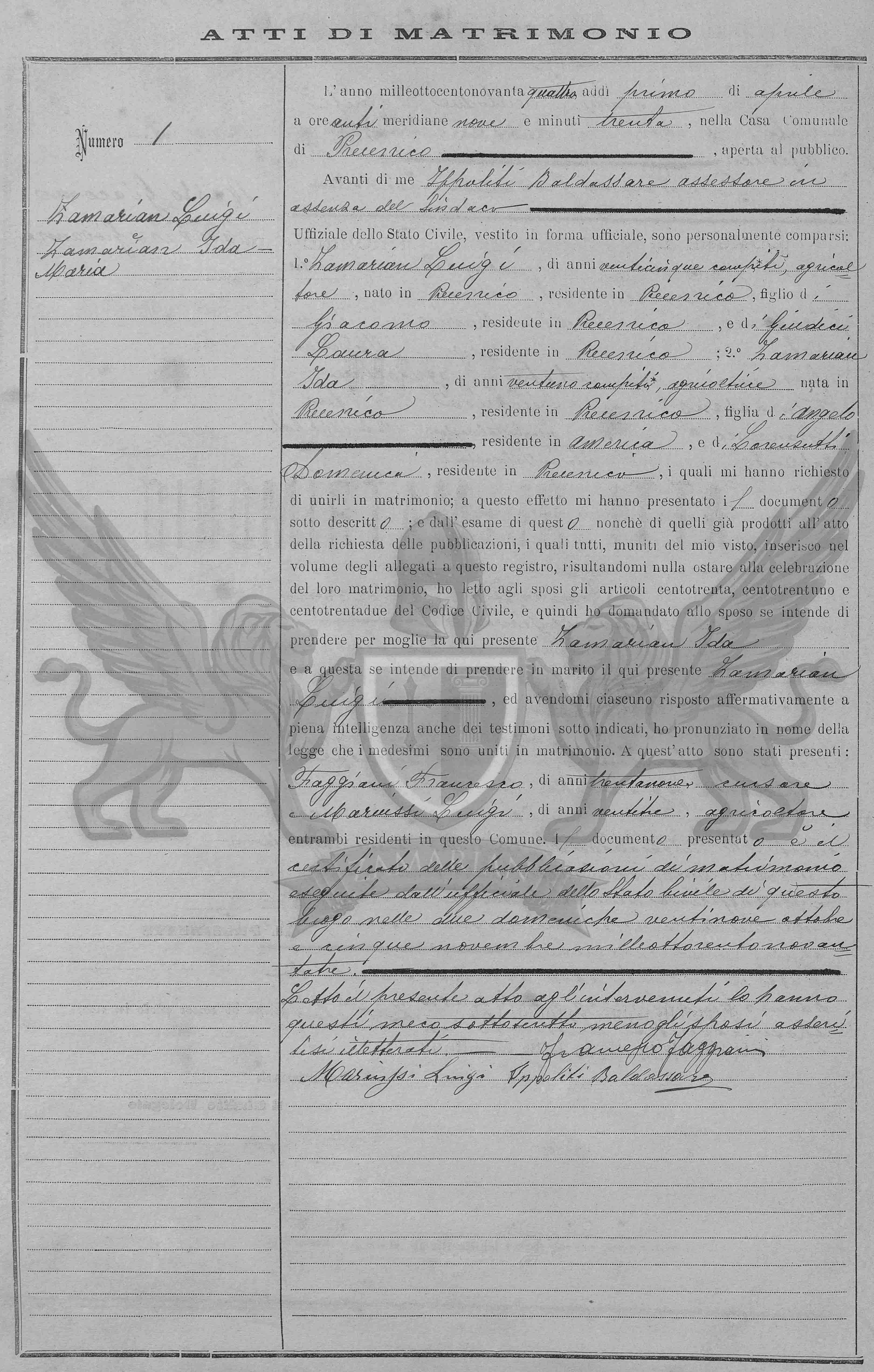 Diante de mim De Lorenzo Giovanni Síndico Oficial do Registro Civil, vestido em forma oficial, compareceram pessoalmente: 1º Zamarian Luigi, de vinte e cinco anos, agricultor, nascido em Precenicco, residente em Precenicco, filho de Giacomo, residente em Precenicco, e de Giudici Laura, residente em Precenicco; 2º Zamarian Ida de vinte e um anos completos, agricultora nascida em Precenicco, residente em Precenicco, filha de Angelo, residente na America, e de Lorenzutti Domenica, residente em Precenicco, os quais me pediram para uni-los em matrimônio; a este efeito me apresentaram o documento abaixo descrito; e do exame deste também daqueles já produzidos no ato do requerimento das publicações, os quais todos munidos do meu visto, inseridos no volume dos anexos a este registro, resultando-me nada a impedir à celebração deste matrimônio, eu li aos nubentes os artigos cento e trinta, cento e trinta e um e cento e trinta e dois do Código Civil e então perguntei ao nubente se intende de tomar por mulher a aqui presente Zamarian Ida e a esta se entende de tomar por marido o aqui presente Zamarian Luigi, e havendo-me cada um respondido de maneira afirmativa em plena inteligência inclusive para as testemunhas sub indicadas , pronunciei em nome da lei que os referidos foram unidos em matrimônio. A este ato se apresentaram: Faggiani Francesco de trinta e nove anos, cursor e Mariussi Luigi de vinte e três anos, agricultor ambos presentes residentes neste Município. O documento apresentado é o certificado das publicações de matrimônio exibidas pelo oficial do registro civil deste local nos dois domingos vinte e nove de outubro e cinco de novembro de mil oitocentos e noventa e três.