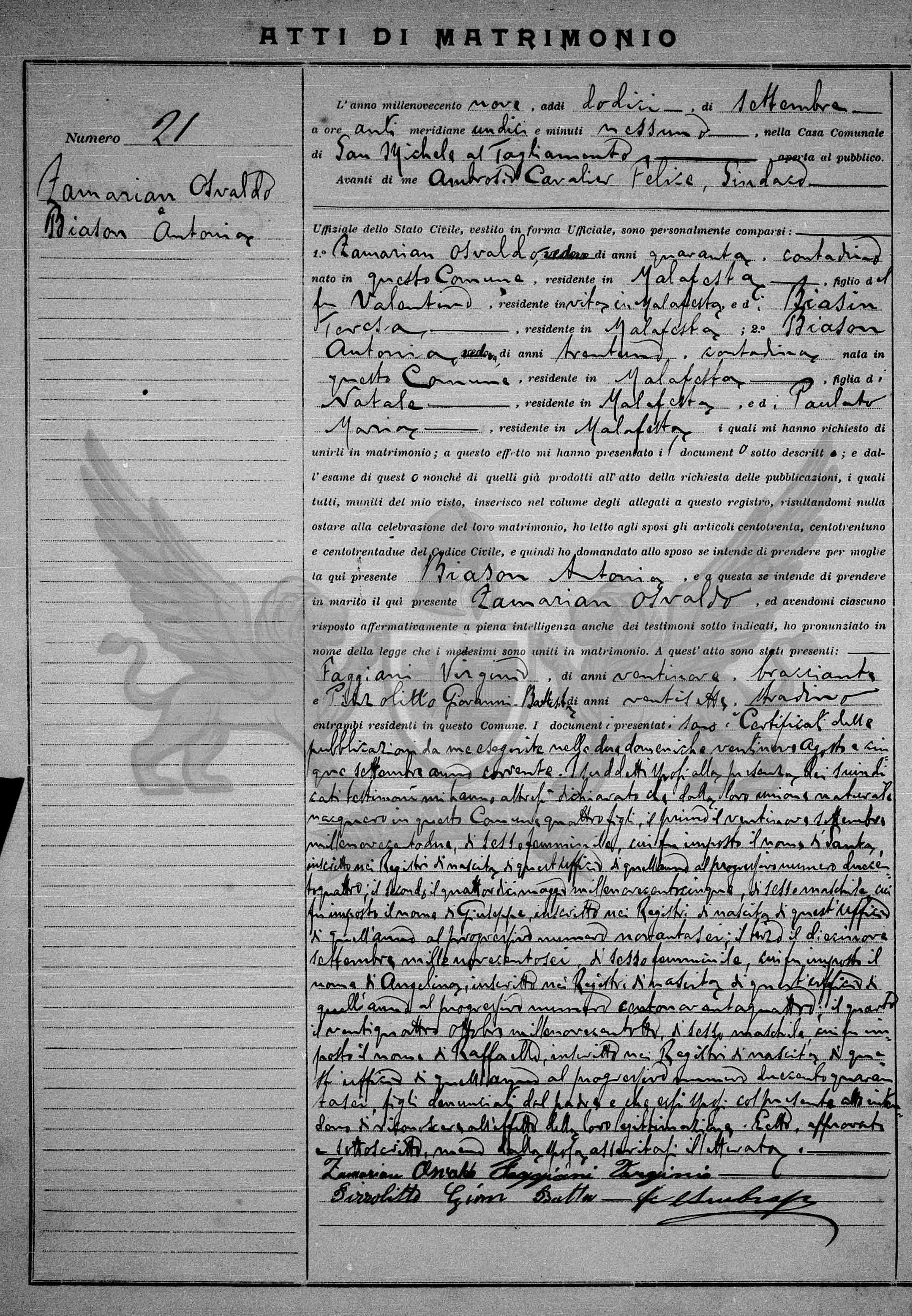 Diante de mim Ambrosio Felice, Síndico, Oficial do Registro Civil, vestido em forma oficial, compareceram pessoalmente: 1º Zamarian Osvaldo, viúvo de quarenta anos, *camponês, nascido neste Município, residente em Malafesta, filho do finado Valentino, residente em Malafesta, e de Biasin Teresa, residente em Malafesta; 2º Biason Antonia, viúva de trinta e um anos, *camponesa nascida neste município, residente em Malafesta, filha de Natale, residente em Malafesta, e de Paulato Maria, residente em Malafesta, os quais me pediram para uni-los em matrimônio; a este efeito me apresentaram o documento abaixo descrito; e do exame deste também daqueles já produzidos no ato do requerimento das publicações, os quais todos munidos do meu visto, inseridos no volume dos anexos a este registro, resultando-me nada a impedir à celebração deste matrimônio, eu li aos nubentes os artigos cento e trinta, cento e trinta e um e cento e trinta e dois do Código Civil e então perguntei ao nubente se intende de tomar por mulher a aqui presente Biason Antonia e a esta se entende de tomar por marido o aqui presente Zamarian Osvaldo, e havendo-me cada um respondido de maneira afirmativa em plena inteligência inclusive para as testemunhas sub indicadas , pronunciei em nome da lei que os referidos foram unidos em matrimônio. A este ato estavam presentes: Faggiani Virginio de vinte e nove anos, braçante e Pizzolitto Giovanni Battista de vinte e sete anos, *Manutenedor de estradas ambos presentes residentes neste Município. O documento apresentado é o certificado das publicações por mim exibidas nos dois domingos vinte e nove de agosto e cinco de setembro ano corrente.