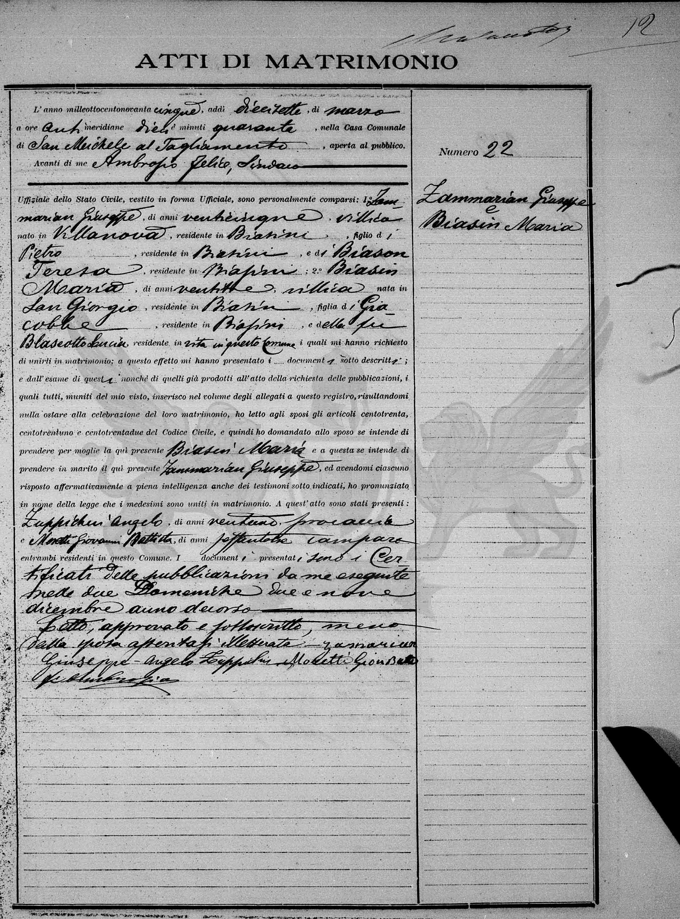 Diante de mim Ambrosio Felice, Síndico, Oficial do Registro Civil, vestido em forma oficial, compareceram pessoalmente: 1º Zammarian Giuseppe, de vinte e cinco anos, *camponês, nascido em Villanova, residente em Biasini, filho de Pietro, residente em Biasini, e de Biason Teresa, residente em Biasini; 2º Biasin Maria de vinte e três um anos, *camponesa nascida em San Giorgio, residente em Biasini, filha de Giacobbe, residente em Biasini, e da falecida Blaseotto Lucia, residente em vida neste Município, os quais me pediram para uni-los em matrimônio; a este efeito me apresentaram os documentos abaixo descritos; e do exame destes também daqueles já produzidos no ato do requerimento das publicações, os quais todos munidos do meu visto, inseridos no volume dos anexos a este registro, resultando-me nada a impedir à celebração deste matrimônio, eu li aos nubentes os artigos cento e trinta, cento e trinta e um e cento e trinta e dois do Código Civil e então perguntei ao nubente se intende de tomar por mulher a aqui presente Biasin Maria e a esta se entende de tomar por marido o aqui presente Zammarian Giuseppe, e havendo-me cada um respondido de maneira afirmativa em plena inteligência inclusive para as testemunhas sub indicadas , pronunciei em nome da lei que os referidos foram unidos em matrimônio. A este ato se apresentaram: Zuppichin Angelo de vinte e um anos, *escriturário e Moretti Giovanni Battista de setenta e três anos, *guardião ambos presentes residentes neste Município. Os documentos apresentados são os certificados das publicações exibidas por mim nos dois domingos dois e nove de dezembro do ano decorrido.