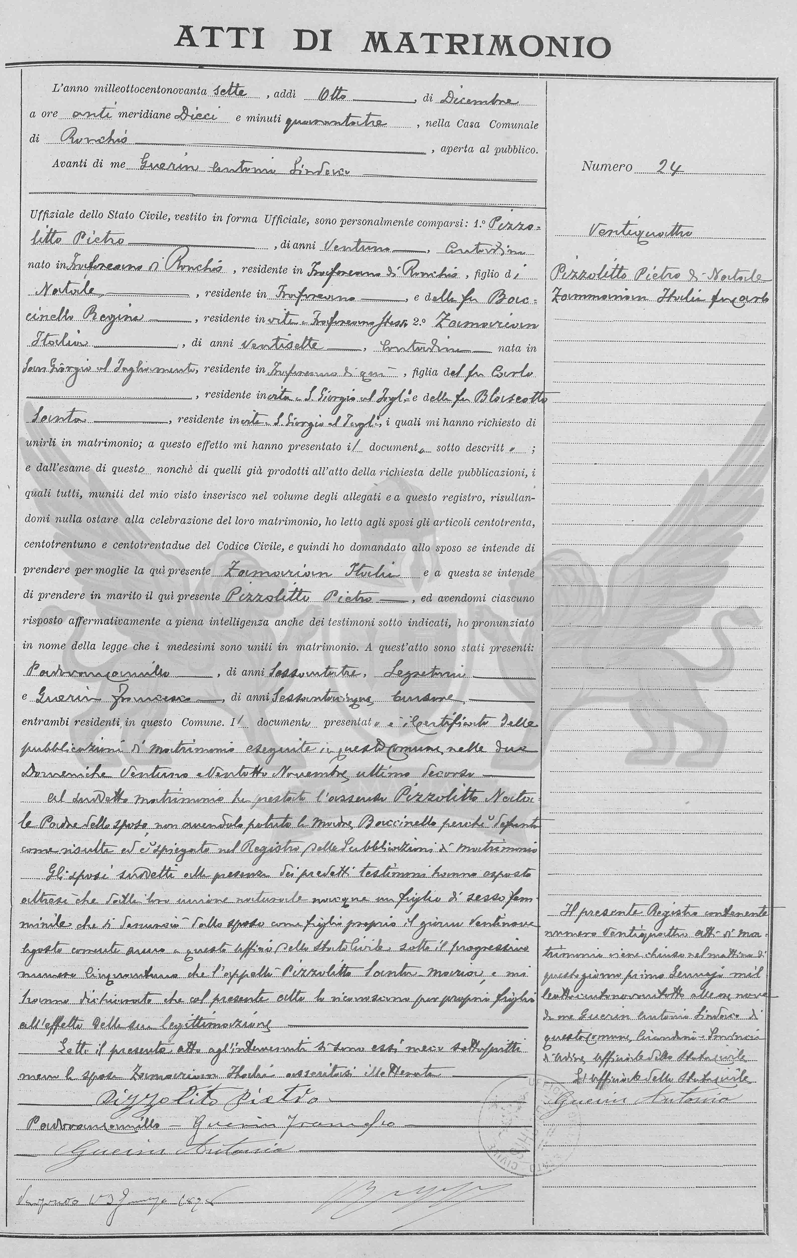 Diante de mim Guerin Antonio Sindaco Oficial do Registro Civil, vestido em forma oficial, compareceram pessoalmente: 1º Pizzolitto Pietro, de vinte e um anos, *camponês, nascido em Fraforeano de Ronchis, residente em Fraforeano de Ronchis, filho de Natale, residente em vida em Caorle, e da falecida Regina Bacinello, residente em vida em Fraforeano de Ronchis; 2º Zamarian Itália, de vinte e sete anos, *camponesa nascida em San Giorgio al Tagliamento, residente em Fraforeano de Ronchis, filha do falecido Carlo, residente em vida em San Giorgio al Tagliamento, e da falecida Blaseotto Santa, residente em vida em San Giorgio al Tagliamento, os quais me pediram para uni-los em matrimônio; a este efeito me apresentaram o documento abaixo descrito; e do exame deste também daqueles já produzidos no ato do requerimento das publicações, os quais todos munidos do meu visto, inseridos no volume dos anexos a este registro, resultando-me nada a impedir à celebração deste matrimônio, eu li aos nubentes os artigos cento e trinta, cento e trinta e um e cento e trinta e dois do Código Civil e então perguntei ao nubente se intende de tomar por mulher a aqui presente Zamarian Italia e a esta se entende de tomar por marido o aqui presente Pizzolitto Pietro, e havendo-me cada um respondido de maneira afirmativa em plena inteligência inclusive para as testemunhas sub indicadas , pronunciei em nome da lei que os referidos foram unidos em matrimônio. A este ato estavam presentes: Padovan Camillo de sessenta e três anos, *secretário e Guerin Francesco, de sessenta e cinco anos, *cursor ambos presentes residentes neste Município. O documento apresentado é o certificado das publicações exibidas neste município nos dois domingos vinte e um e vinte e oito de novembro último passado.