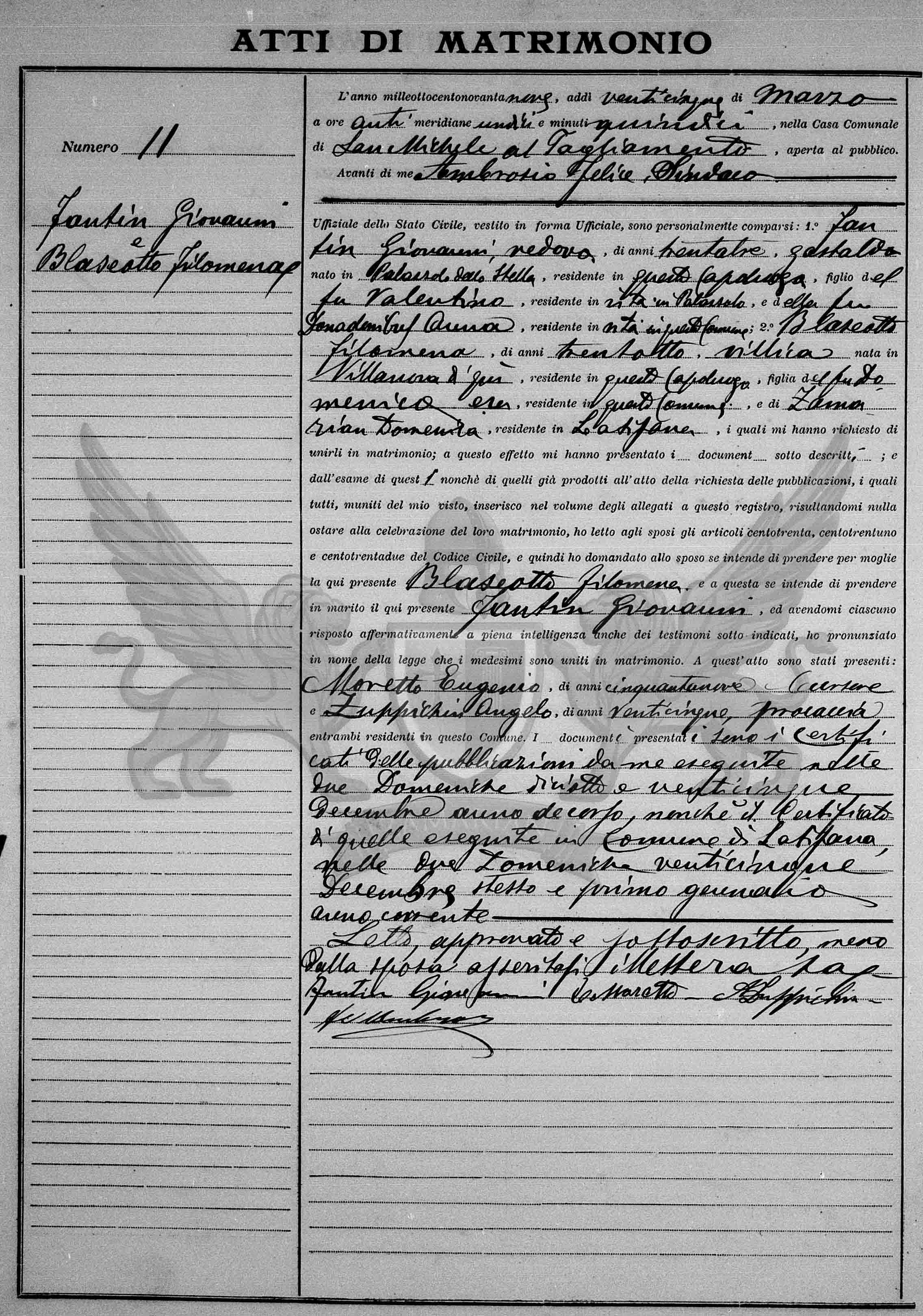 Diante de mim Ambrosio Felice Síndico Oficial do Estado Civil, vestido em forma oficial, compareceram pessoalmente: 1º Fantin Giovanni, viúvo, de trinta e três anos, *administrador de terras, nascido em Palazzolo dello Stella, residente neste Município, filho do finado Valentino, residente em vida em Palazzolo, e da finada Donadonibus Anna, residente em vida neste Município; 2º Blaseotto Filomena, de trinta e oito anos, *camponesa nascida em Villanova daqui, residente neste Município, filha do finado Domenico, residente em vida neste Município, de Zamarian Domenica, residente em Latisana, os quais me pediram para uni-los em matrimônio; a este efeito me apresentaram os documentos abaixo descritos; e do exame destes também daqueles já produzidos no ato do requerimento das publicações, os quais todos munidos do meu visto, inseridos no volume dos anexos a este registro, resultando-me nada a impedir à celebração deste matrimônio, eu li aos nubentes os artigos cento e trinta, cento e trinta e um e cento e trinta e dois do Código Civil e então perguntei ao nubente se intende de tomar por mulher a aqui presente Blaseotto Filomena e a esta se entende de tomar por marido o aqui presente Fantin Giovanni, e havendo-me cada um respondido de maneira afirmativa em plena inteligência inclusive para as testemunhas sub indicadas , pronunciei em nome da lei que os referidos foram unidos em matrimônio. A este ato estavam presentes: Moretto Eugenio de cinquenta e nove anos, *cursor e Zupichin Angelo de vinte e cinco anos, *caçador ambos presentes residentes neste Município.