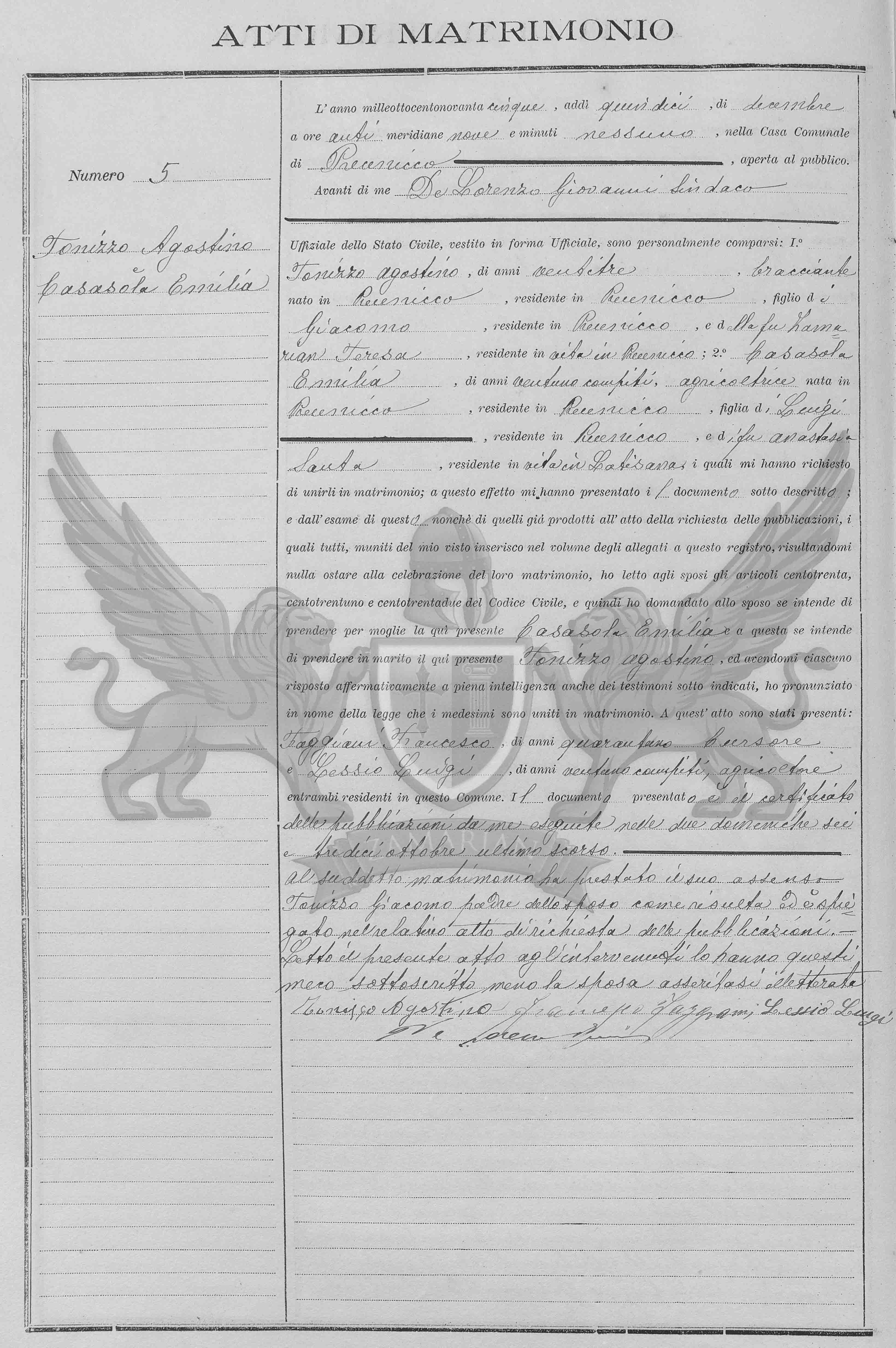 Diante de mim De Lorenzo Giovanni Síndico Oficial do Registro Civil, vestido em forma oficial, compareceram pessoalmente: 1º Tonizzo Agostino de vinte e três anos, operário, nascido em Precenicco, residente em Precenicco, filho de Giacomo, residente em Precenicco, e da finada Zamarian Teresa, residente em Precenicco; 2º Casasola Emilia de vinte e um anos completos, agricultora nascida em Precenicco, residente em Precenicco, filha de Luigi, residente em Precenicco, e da finada Anastasia Santa, residente em Latisana, os quais me pediram para uni-los em matrimônio; a este efeito me apresentaram o documento abaixo descrito; e do exame deste também daqueles já produzidos no ato do requerimento das publicações, os quais todos munidos do meu visto, inseridos no volume dos anexos a este registro, resultando-me nada a impedir à celebração deste matrimônio, eu li aos nubentes os artigos cento e trinta, cento e trinta e um e cento e trinta e dois do Código Civil e então perguntei ao nubente se intende de tomar por mulher a aqui presente Casasola Emilia e a esta se entende de tomar por marido o aqui presente Tonizzo Agostino, e havendo-me cada um respondido de maneira afirmativa em plena inteligência inclusive para as testemunhas sub indicadas , pronunciei em nome da lei que os referidos foram unidos em matrimônio. A este ato se apresentaram: Faggiani Francesco de quarenta e um anos, cursor e Lessio Luigi de vinte e um anos completos, agricultor ambos presentes residentes neste Município.