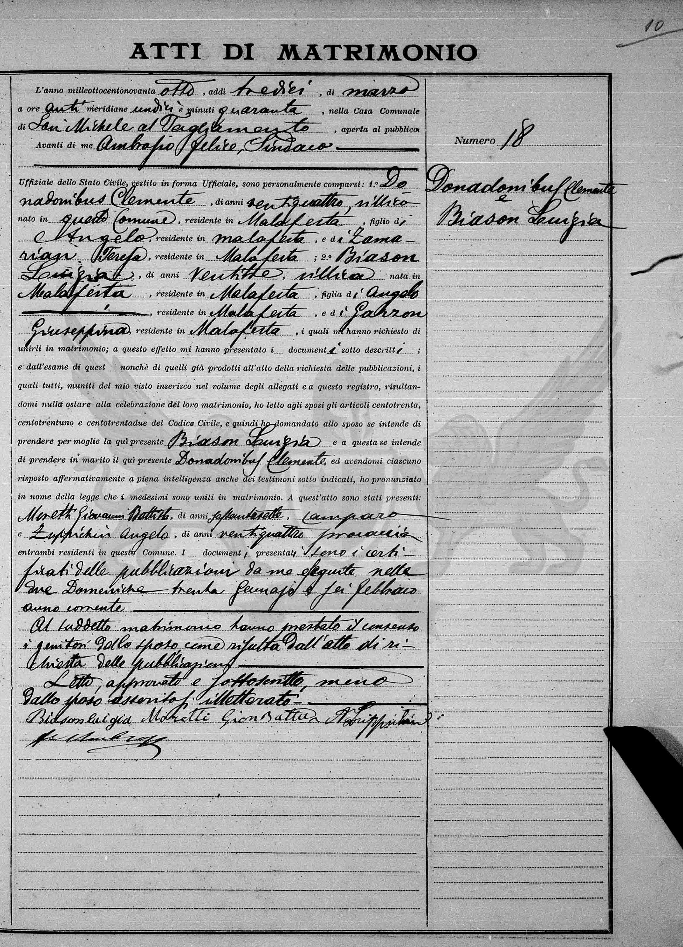 Diante de mim Ambrosio Felice, Síndico Oficial do Registro Civil, vestido em forma oficial, compareceram pessoalmente: 1º Donadonibus Clemente, solteiro, de vinte e quatro anos, *camponês, nascido neste município, residente em Malafesta, filho de Angelo, residente em Malafesta, e de Zamarian Teresa, residente em Malafesta; 2º Biason Luigia de vinte e três anos, *camponesa nascida em Malafesta, residente em Malafesta, filha de Angelo, residente em Malafesta, e de Garzon Giuseppina, residente em Malafesta, os quais me pediram para uni-los em matrimônio; a este efeito me apresentaram os documentos abaixo descritos; e do exame destes também daqueles já produzidos no ato do requerimento das publicações, os quais todos munidos do meu visto, inseridos no volume dos anexos a este registro, resultando-me nada a impedir à celebração deste matrimônio, eu li aos nubentes os artigos cento e trinta, cento e trinta e um e cento e trinta e dois do Código Civil e então perguntei ao nubente se intende de tomar por mulher a aqui presente Biason Luigia e a esta se entende de tomar por marido o aqui presente Donadonibus Clemente, e havendo-me cada um respondido de maneira afirmativa em plena inteligência inclusive para as testemunhas sub indicadas , pronunciei em nome da lei que os referidos foram unidos em matrimônio. A este ato estavam presentes: Moretti Giovanni Battista de sessenta e sete anos, guardião e Zuppichin Angelo de vinte e quatro anos, *despachante ambos presentes residentes neste Município. Os documentos apresentados são os certificados das publicações por mim exibidos nos dois domingos trinta de janeiro e seis de fevereiro do ano corrente.