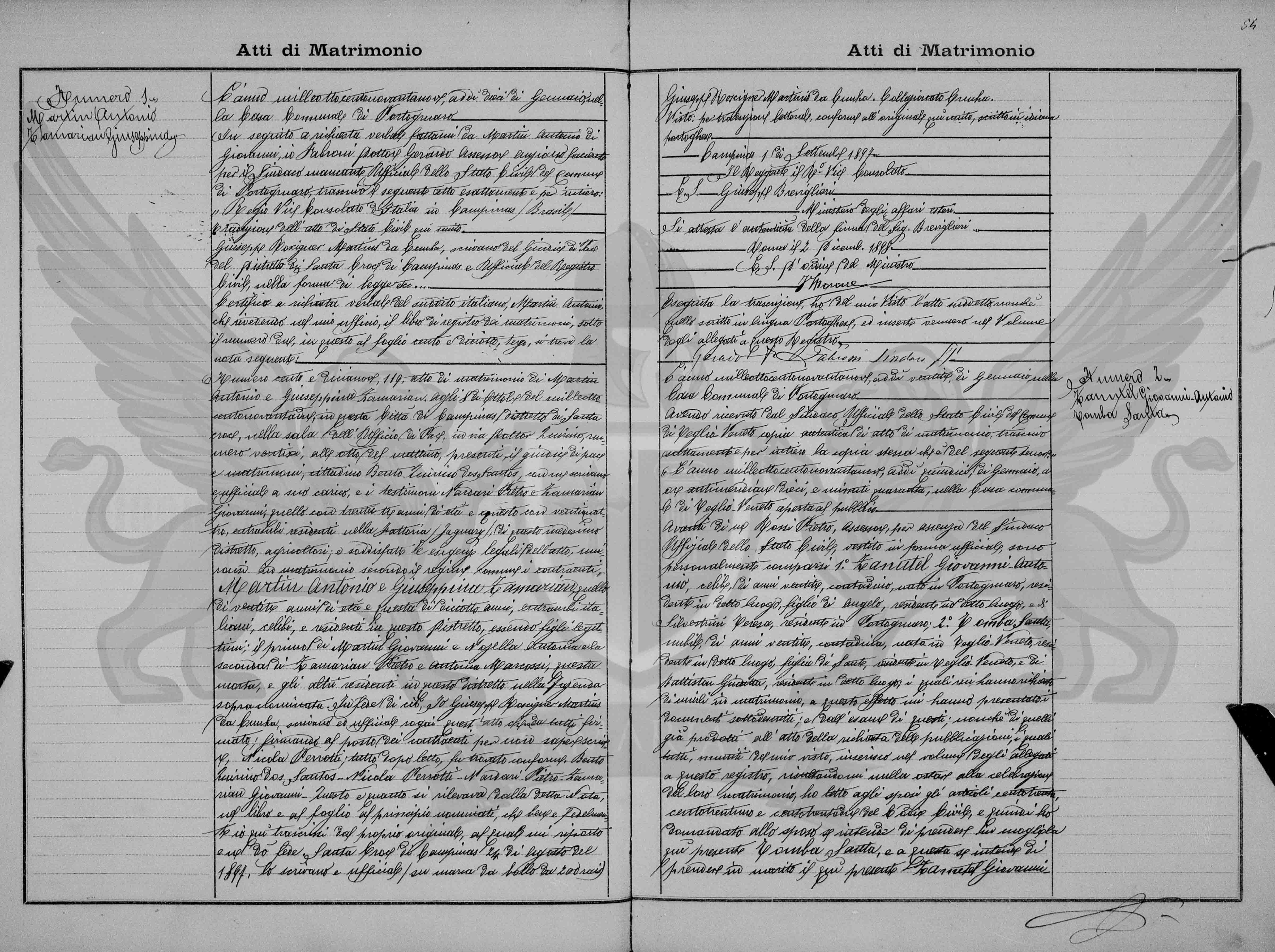 Número cento e dezenove, 119, ato de matrimônio de Martin Antonio e Giuseppina Zamarian, aos 8 de outubro de mil oitocentos e noventa e dois (1892), nesta cidade de Campinas/ distrito de Santa Cruz, na sala do ofício de Paz, na rua Doutor Quirino, número vinte e seis, às oito horas da manhã, presentes o juiz de paz e matrimônios Bento Quirino dos Santos, com seu escrivão oficial a seu encargo, e testemunhas Nardari Pietro e Zamarian Giovanni, aquele com trinta e três anos de idade e este com vinte e quatro, ambos residentes na Fazenda Jaguary, deste citado Distrito, agricultores; e satisfeita as exigências legais do ato, unireis em matrimônio segundo o regime comum os contraentes Martin Antonio e Giuseppina Zamarian, aquele de vinte e três anos de idade e esta de dezoito anos, ambos italianos, solteiros, e residentes neste distrito, sendo filhos legítimos. O primeiro de Martin Giovanni e Nosella Antonia e a segunda de Zamarian Pietro e Antonia Marcossi, esta falecida, e os outros residentes neste distrito na fazenda supra nominada. Foi juiz, eu José Rodrigues Martins da Cunha, escrivão oficial roguei este ato e assinei; Assinaram no lugar dos contraentes por não saber escreverem. Nicola Perrotti depois de lido, de acordo com o conforme. Bento Quirino dos Santos - Nicola Perrotti - Nardari Pietro - Zamarian Giovanni.