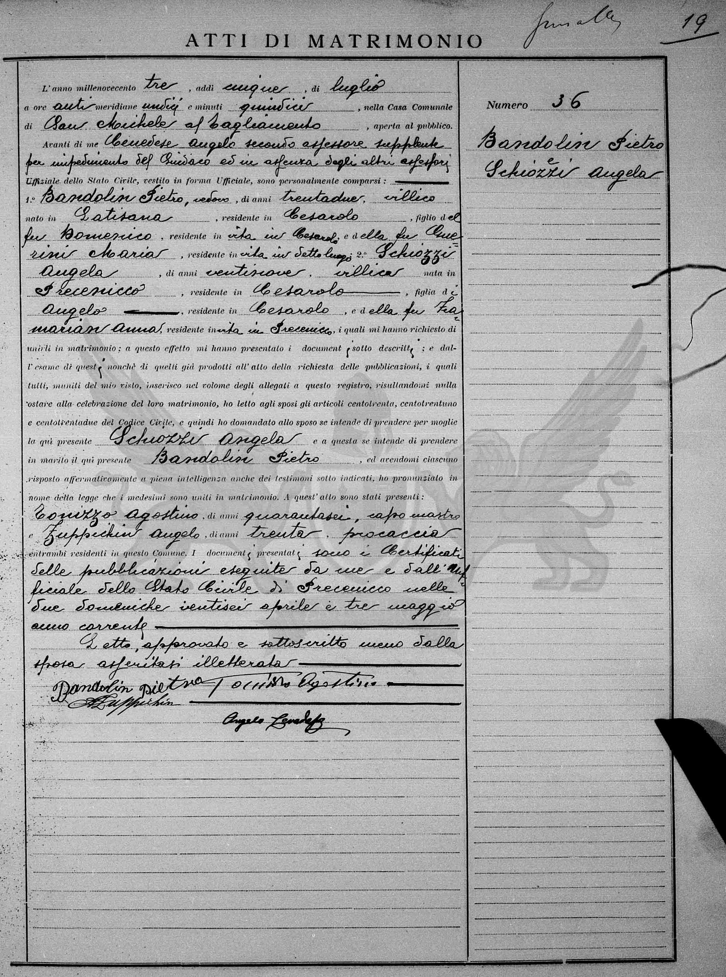Diante de mim Cenedese Angelo segundo assessor Suplente por impedimento do Síndico e em ausência dos outros assessores Oficial do Registro Civil, vestido em forma oficial, compareceram pessoalmente: 1º Bandolin Pietro, viúvo, de trinta e dois anos, camponês, nascido em Latisana, residente Cesarolo, filho do finado Domenico, residente em vida em Cesarolo, e da finada Guerino Maria, residente em vida em Cesarolo; 2º Schiozzi Angela de vinte e nove anos, camponesa nascida em Precenicco, residente em Cesarolo, filha de Angelo, residente em Cesarolo, e da finada Zamarian Anna, residente em vida em Precenicco, os quais me pediram para uni-los em matrimônio; a este efeito me apresentaram os documentos abaixo descritos; e do exame destes também daqueles já produzidos no ato do requerimento das publicações, os quais todos munidos do meu visto, inseridos no volume dos anexos a este registro, resultando-me nada a impedir à celebração deste matrimônio, eu li aos nubentes os artigos cento e trinta, cento e trinta e um e cento e trinta e dois do Código Civil e então perguntei ao nubente se intende de tomar por mulher a aqui presente Schiozzi Angela e a esta se entende de tomar por marido o aqui presente Bandolin Pietro, e havendo-me cada um respondido de maneira afirmativa em plena inteligência inclusive para as testemunhas sub indicadas , pronunciei em nome da lei que os referidos foram unidos em matrimônio. A este ato se apresentaram: Tonizzo Agostino de quarenta e seis anos, *diretor de escola e Zuppichin Angelo de trinta anos, transportador mercante ambos presentes residentes neste Município. Os documentos apresentados são os certificados das publicações por mim exibidas e pelo oficial do Registro Civil de Precenicco nos dois domingos vinte e seis de abril e três de maio do ano corrente.