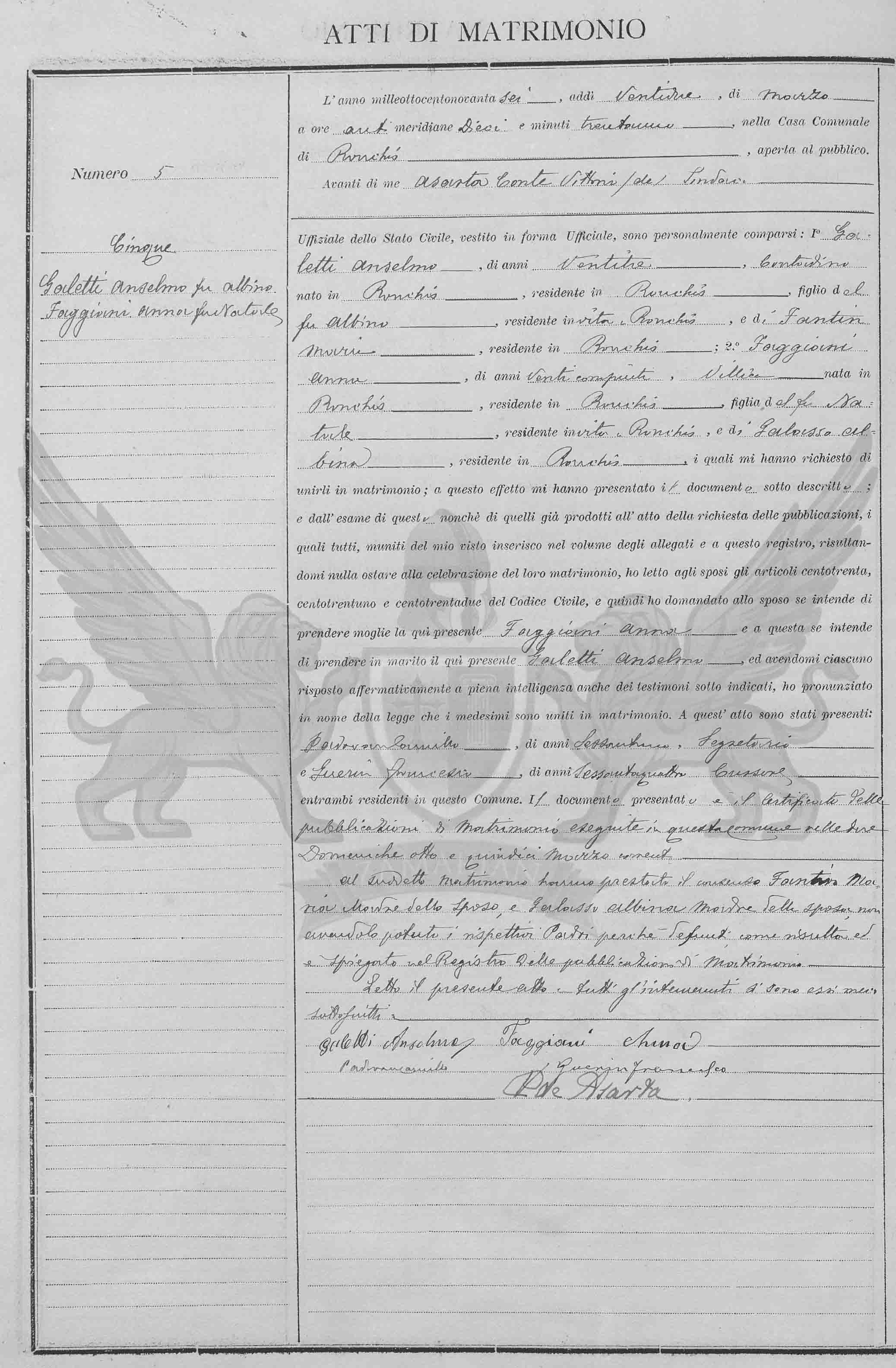 Diante de mim Conte Vittorio Síndico Oficial do Registro Civil, vestido em forma oficial, compareceram pessoalmente: 1º Galetti Anselmo, de vinte e três anos, *camponês, nascido em Ronchis, residente em Ronchis, filho de Albino, residente em vida em Ronchis, e de Fantin Maria, residente em Ronchis; 2º Faggiani Anna, de vinte anos completos, *camponesa nascida em Ronchis, residente em Ronchis, filha do finado Natale, residente em vida em Ronchis, e de Galasso Albina, residente em Ronchis, os quais me pediram para uni-los em matrimônio; a este efeito me apresentaram o documento abaixo descrito; e do exame deste também daqueles já produzidos no ato do requerimento das publicações, os quais todos munidos do meu visto, inseridos no volume dos anexos a este registro, resultando-me nada a impedir à celebração deste matrimônio, eu li aos nubentes os artigos cento e trinta, cento e trinta e um e cento e trinta e dois do Código Civil e então perguntei ao nubente se intende de tomar por mulher a aqui presente Faggiani Anna e a esta se entende de tomar por marido o aqui presente Galetti Anselmo, e havendo-me cada um respondido de maneira afirmativa em plena inteligência inclusive para as testemunhas sub indicadas , pronunciei em nome da lei que os referidos foram unidos em matrimônio.