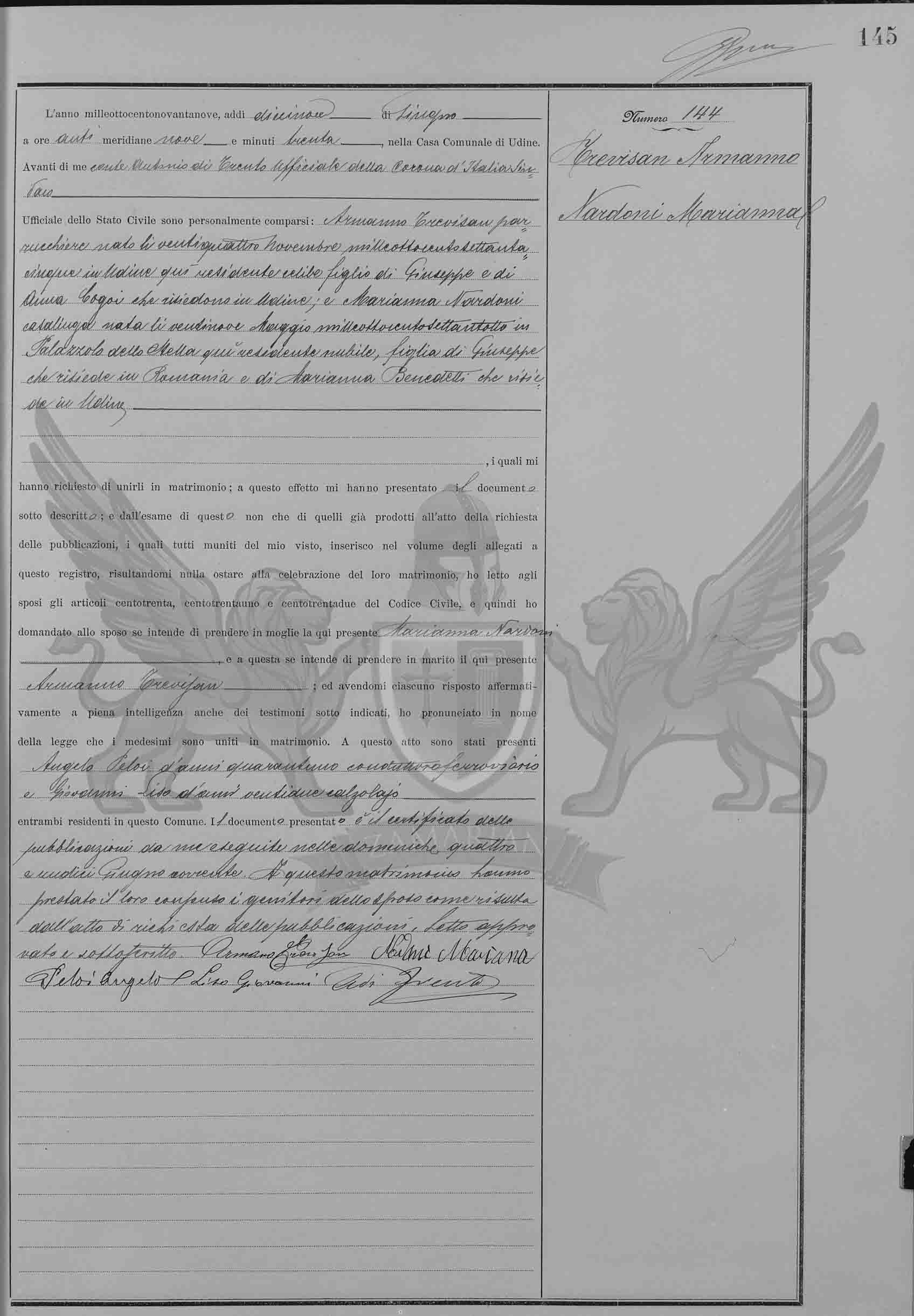 Diante de mim conde Antonio de Trento, oficial da Coroa, Síndico Oficial do Estado Civil, vestido em forma oficial, compareceram pessoalmente: Armanno Trevisan, cabeleireiro, nascido no dia vinte e quatro de novembro de mil oitocentos e setenta e cinco em Udine, solteiro, filho de Giuseppe e de Anna Cogoi, que residem em Udine; e Marianna Nardoni, *dona de casa nascida no dia vinte e nove de maio de mil oitocentos e setenta e oito em Palazzolo dello Stella, aqui residente solteira, filha de Giuseppe que reside na Romênia, e de Marianna Benedetti, que reside em Udine, os quais me pediram para uni-los em matrimônio; a este efeito me apresentaram o documento abaixo descrito; e do exame deste também daqueles já produzidos no ato do requerimento das publicações, os quais todos munidos do meu visto, inseridos no volume dos anexos a este registro, resultando-me nada a impedir à celebração deste matrimônio, eu li aos nubentes os artigos cento e trinta, cento e trinta e um e cento e trinta e dois do Código Civil e então perguntei ao nubente se intende de tomar por mulher a aqui presente Marianna Nardoni e a esta se entende de tomar por marido o aqui presente Armanno Trevisan, e havendo-me cada um respondido de maneira afirmativa em plena inteligência inclusive para as testemunhas sub indicadas , pronunciei em nome da lei que os referidos foram unidos em matrimônio. A este ato estavam presentes: Angelo Peloi de quarenta e um anos, *condutor ferroviário e Giovanni Liso de vinte e dois anos, *sapateiro, ambos presentes residentes neste Município.
