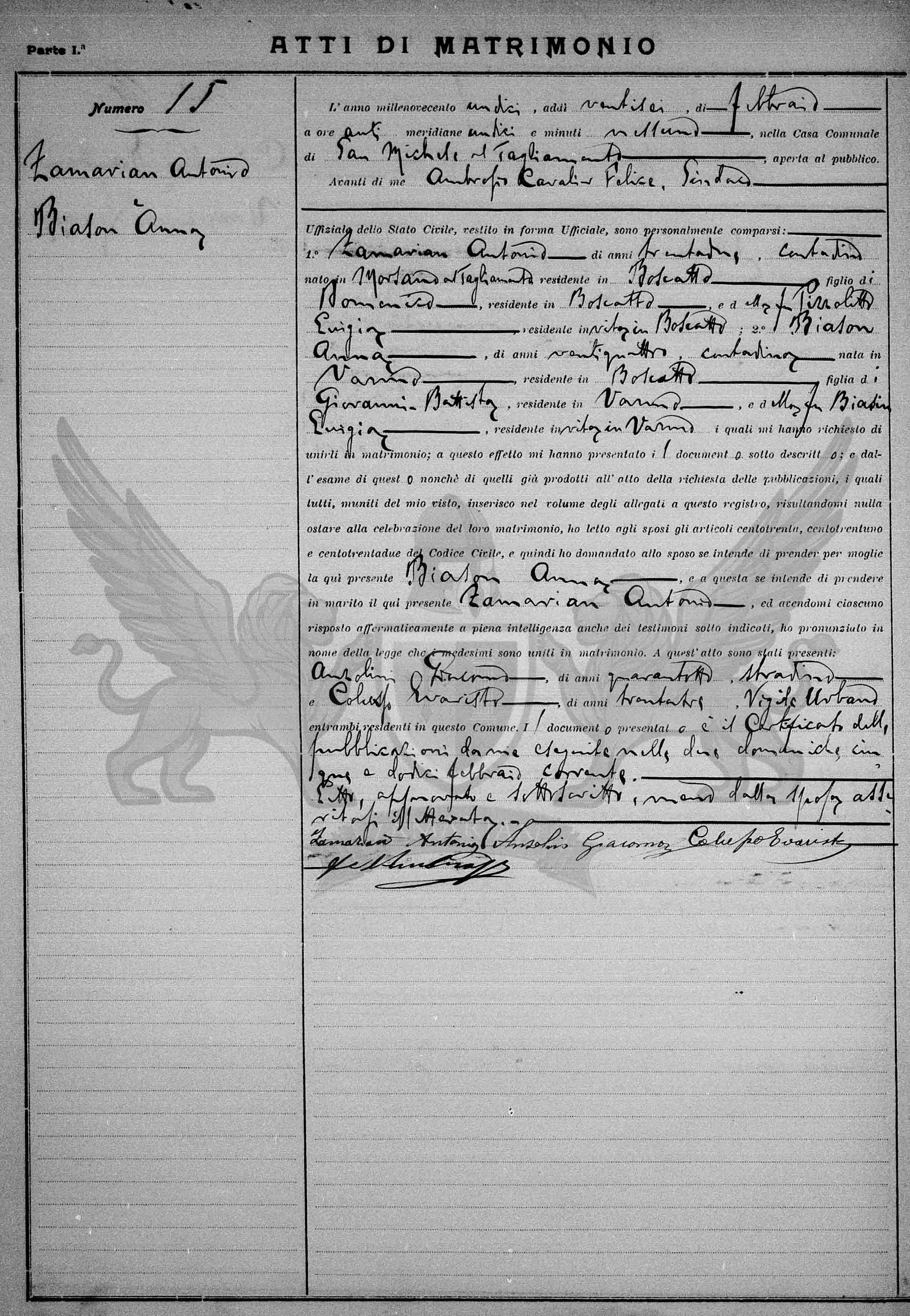 Diante de mim Ambrosio Cavalier Felice, Síndico, Oficial do Registro Civil, vestido em forma oficial, compareceram pessoalmente: 1º Zamarian Antonio, de trinta e três anos, *lavrador, nascido em Morsano al Tagliamento, residente em Villanova, filho de Domenico, residente em Boscatto, e da falecida Pizzolitto Luigia, residente em vida em Boscatto; 2º Biason Anna, de vinte e quatro anos, *lavradora, nascida em Varmo, residente em Boscatto, filha de Giovanni Battista, residente em Varmo, e da falecida Biasin Luigia, residente em vida em Varmo, os quais me pediram para uni-los em matrimônio; a este efeito me apresentaram o documento abaixo descrito; e do exame deste também daqueles já produzidos no ato do requerimento das publicações, os quais todos munidos do meu visto, inseridos no volume dos anexos a este registro, resultando-me nada a impedir à celebração deste matrimônio, eu li aos nubentes os artigos cento e trinta, cento e trinta e um e cento e trinta e dois do Código Civil e então perguntei ao nubente se intende de tomar por mulher a aqui presente Biason Anna e a esta se entende de tomar por marido o aqui presente Zamarian Antonio, e havendo-me cada um respondido de maneira afirmativa em plena inteligência inclusive para as testemunhas sub indicadas , pronunciei em nome da lei que os referidos foram unidos em matrimônio. A este ato estavam presentes: Anzolin Giacomo de quarenta e quatro anos, pavimentador e Colusso Evaristo de trinta e três anos, *Vigia Municipal ambos presentes residentes neste Município. O documento apresentado é o certificado das publicações por mim exibidas nos dois domingos cinco e doze de fevereiro corrente.
