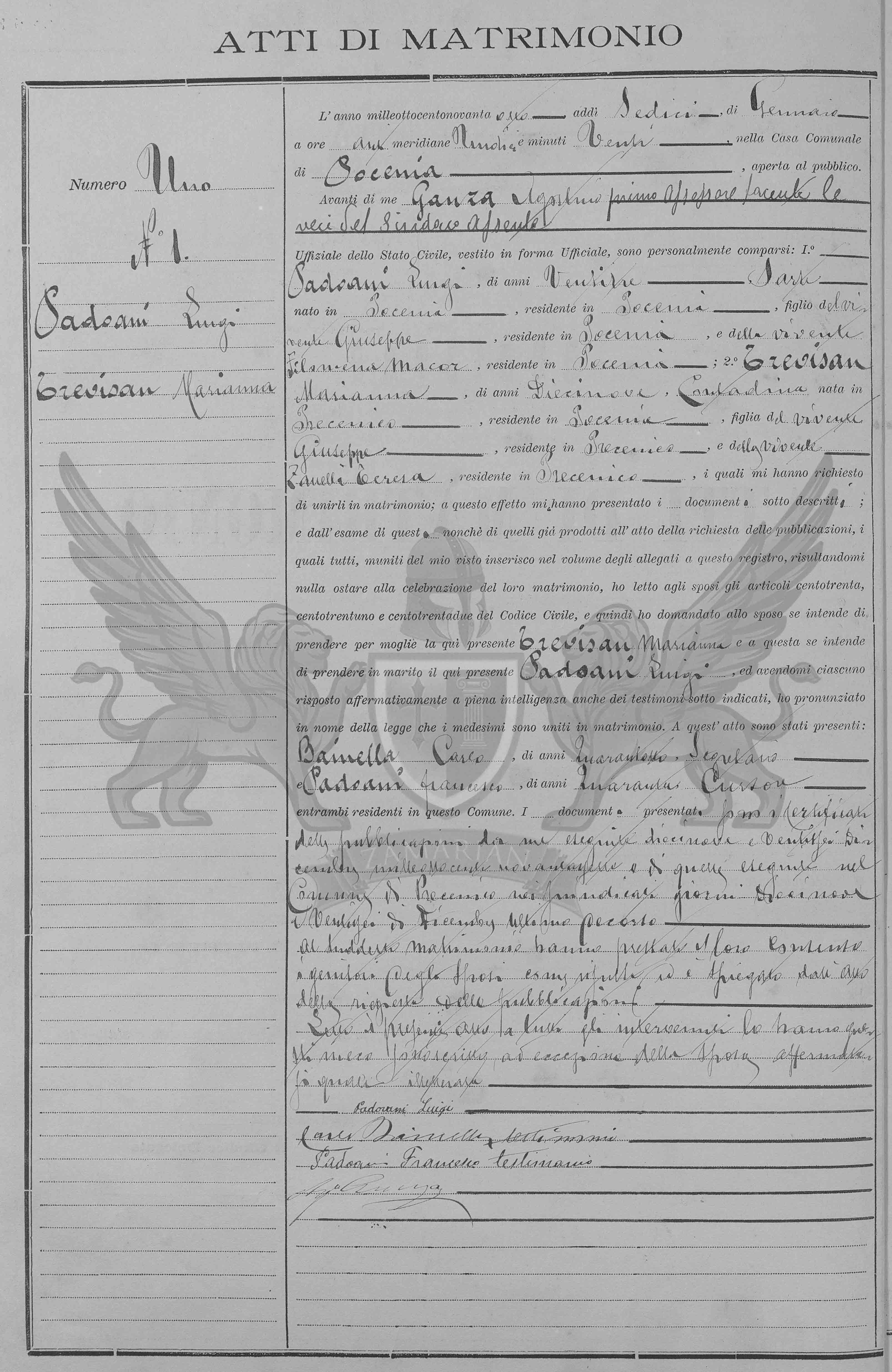 Diante de mim Ganza Agostino primeiro assessor fazendo as vozes do Síndico ausente Oficial do Estado Civil, vestido em forma oficial, compareceram pessoalmente: 1º Padoani Luigi, de vinte e três anos, *artesão, nascido em Pocenia, residente em Pocenia, filho do vivente Giuseppe, residente em Pocenia, e da vivente Filomena Macor, residente em Pocenia; 2º Trevisan Marianna, de dezenove anos, *camponesa nascida em Precenicco, residente em Precenicco, filha do vivente Giuseppe, residente em Precenicco, e da vivente Zanelli Teresa, residente em Precenicco, os quais me pediram para uni-los em matrimônio; a este efeito me apresentaram o documento abaixo descrito; e do exame deste também daqueles já produzidos no ato do requerimento das publicações, os quais todos munidos do meu visto, inseridos no volume dos anexos a este registro, resultando-me nada a impedir à celebração deste matrimônio, eu li aos nubentes os artigos cento e trinta, cento e trinta e um e cento e trinta e dois do Código Civil e então perguntei ao nubente se intende de tomar por mulher a aqui presente Trevisan Marianna e a esta se entende de tomar por marido o aqui presente Padoani Luigi, e havendo-me cada um respondido de maneira afirmativa em plena inteligência inclusive para as testemunhas sub indicadas , pronunciei em nome da lei que os referidos foram unidos em matrimônio. A este ato estavam presentes: Bainella Carlo, de quarenta e oito anos, *secretário e Padoani Francesco de quarenta anos, *cursor ambos presentes residentes neste Município. Os documentos apresentados são os certificado das publicações de matrimônio por mim exibidas dia dezenove e vinte e seis de dezembro de mil oitocentos e e noventa e seis e daquelas exibidas no Município de Precenicco nos citados dias de dezenove e vinte e seis de dezembro último decorrido.