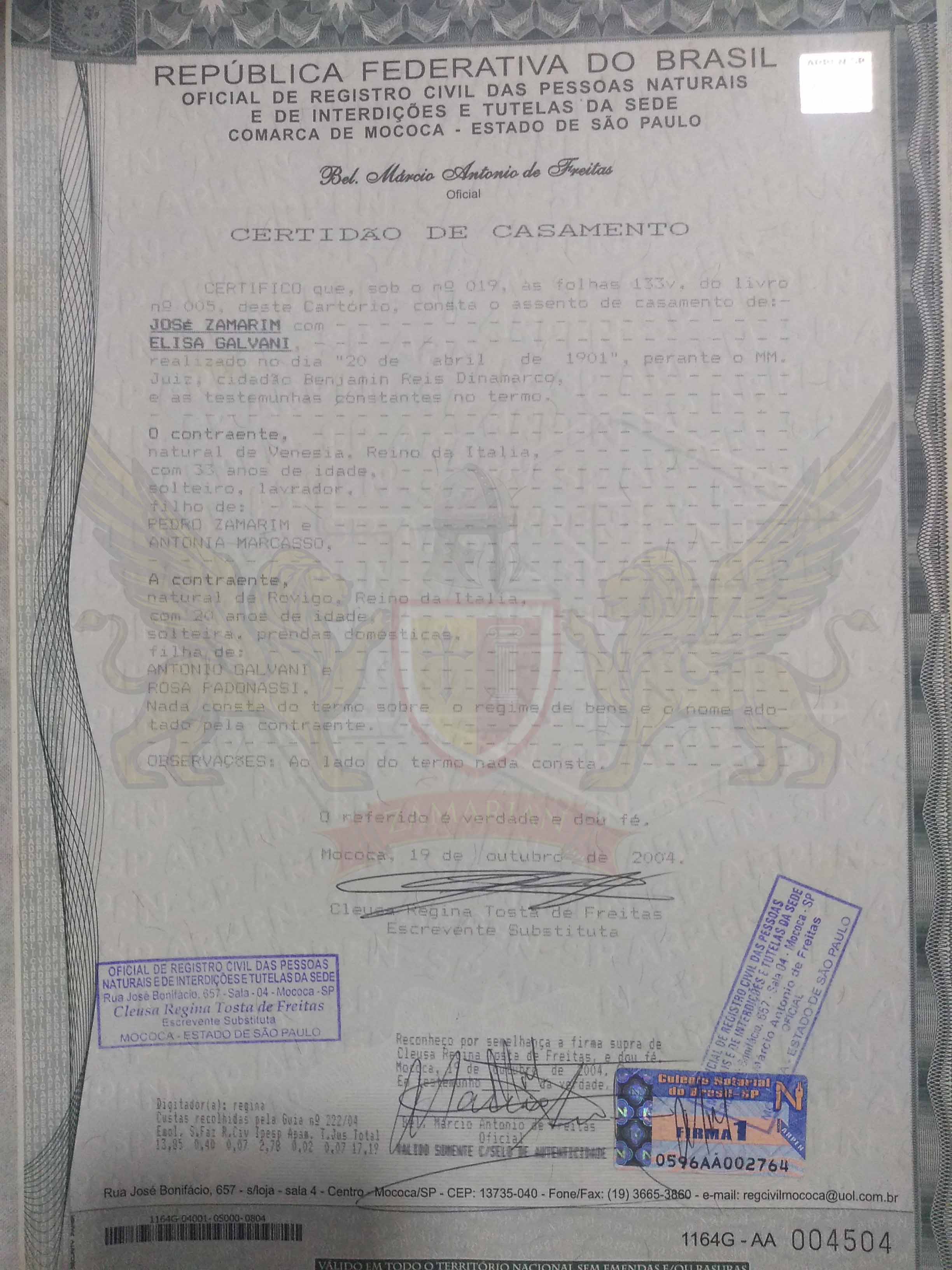 CERTIFICO que, sob nº 019, Às folhas 133v, do livro nº 005, deste Cartório, consta o assento de casamento de: JOSÉ ZAMARIM com ELISA GALVANI,realizado no dia “20 de abril de 1901”, perante MM. Juiz, cidadão Benjamin Reis Dinamarca, e as testemunhas constantes no termo.