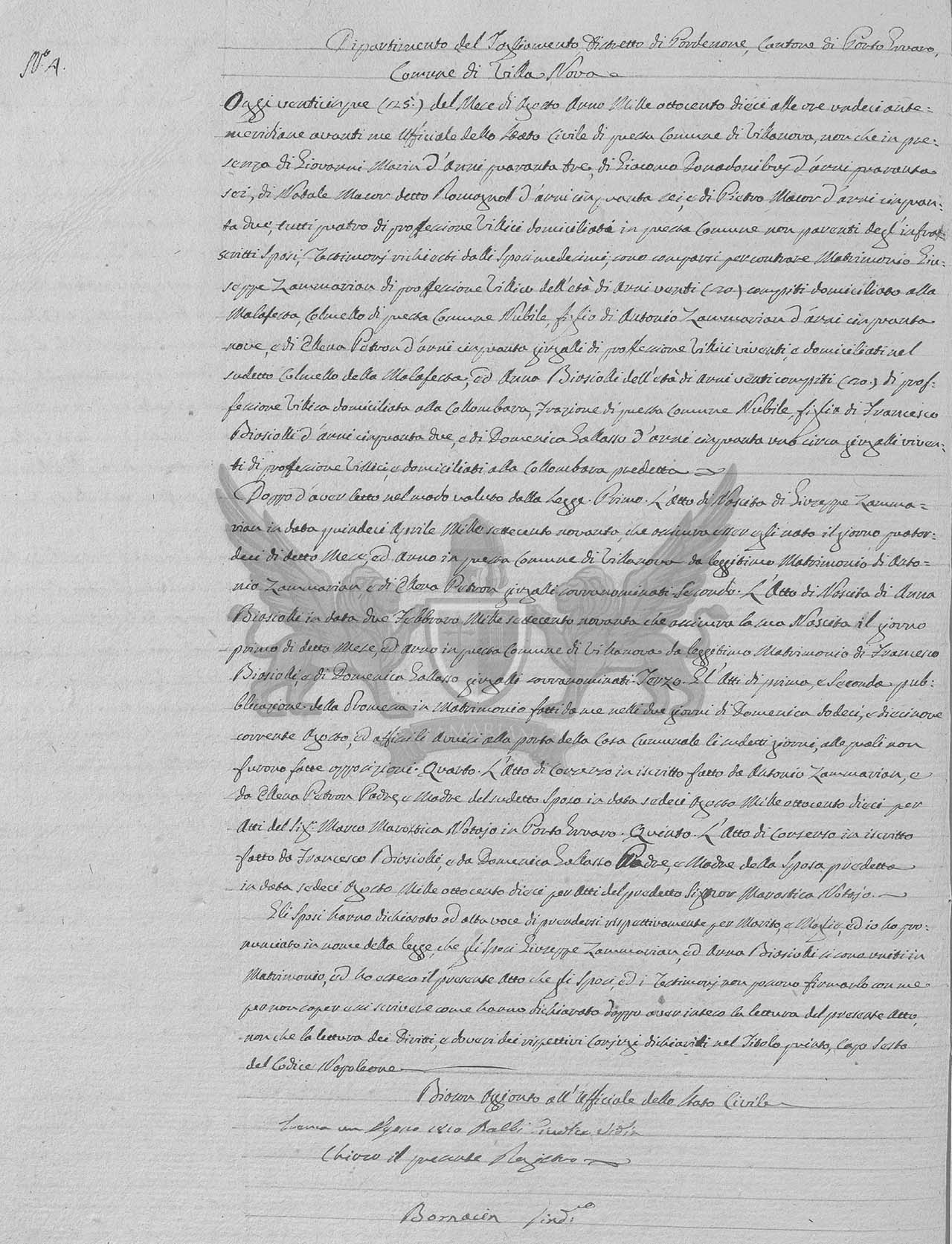 Hoje dia vinte e cinco (25) do mês de agosto ano mil oitocentos e dez às onze horas da manhã diante de mim Oficial do Registro Civil deste Município de Villanova, também em presença de Giovanni Marin de quarenta e três anos, de Giacomo Donadonubis de quarenta e seis anos, de Natale Mauro conhecido como Romagnol de cinquenta e seis anos, e de Pietro Macor de cinquenta e dois anos, todos os quatro de profissão camponês domiciliados neste Município não parentes dos infra inscritos nubentes, testemunhas escolhidos pelos mesmos, compareceram para contrair matrimonio Giuseppe Zamarian de profissão camponês de vinte (20) anos de idade completos domiciliados em Malafesta, Fração desse Município solteiro, filho de Antonio Zammarian de cinquenta e nove anos, e de Elena Petron de cinquenta anos da mesma forma camponeses viventes, e domiciliados na já citada Fração de Malafesta; e Anna Biasiolli de vinte (20) anos de idade de profissão camponesa domiciliada à Colombara, Fração deste Município Solteira, filha de Francesco Biasiolli de cinquenta e dois anos, e de Domenica Sallasso de cerca de cinquenta e um anos da mesma forma viventes de profissão camponeses, e domiciliados em Colombara já citada.