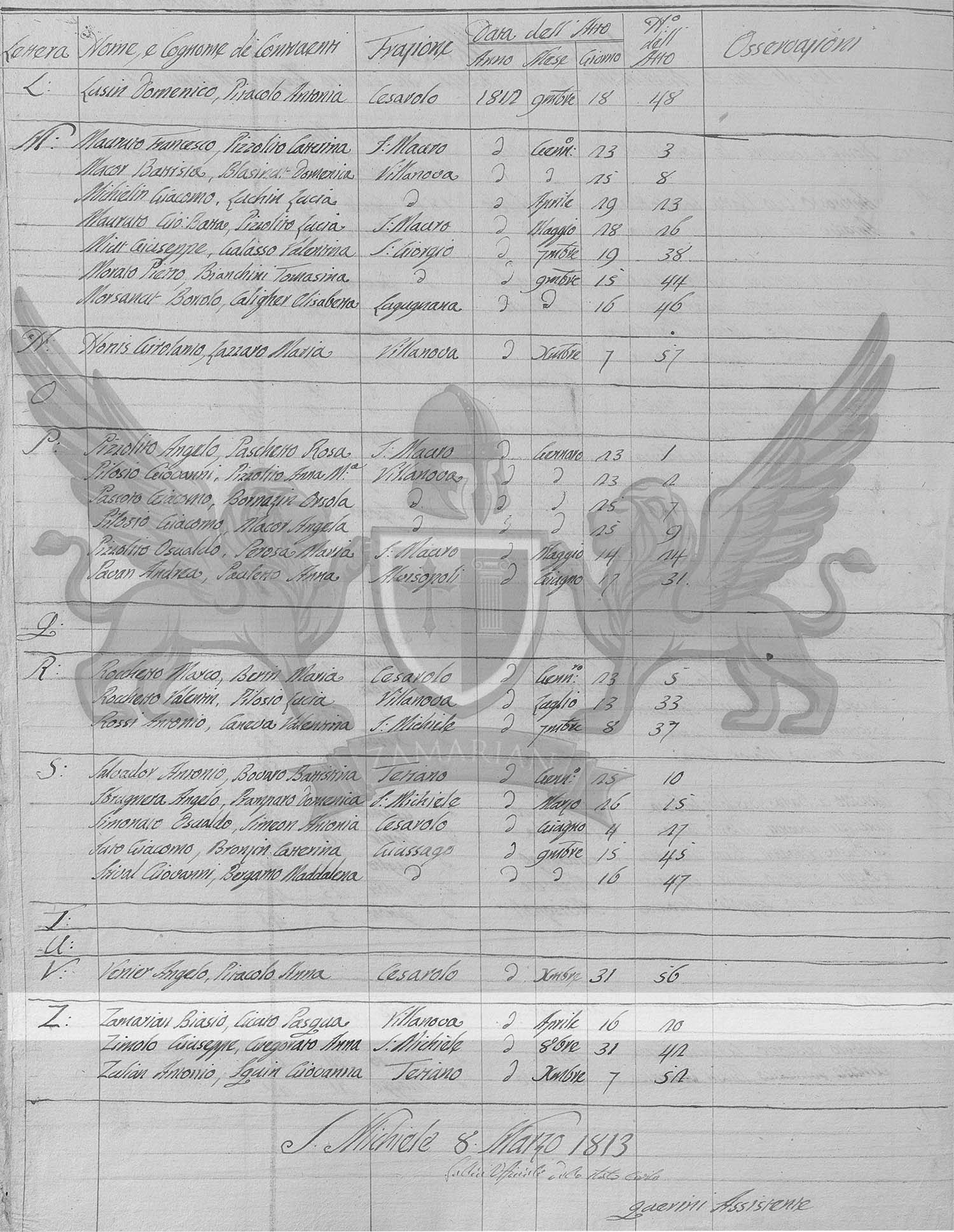 A lista foi elaborada no município de San Michele no dia 8 de março de 1813 pelo Assistente do Oficial do Estado Civil municipal Guerini.