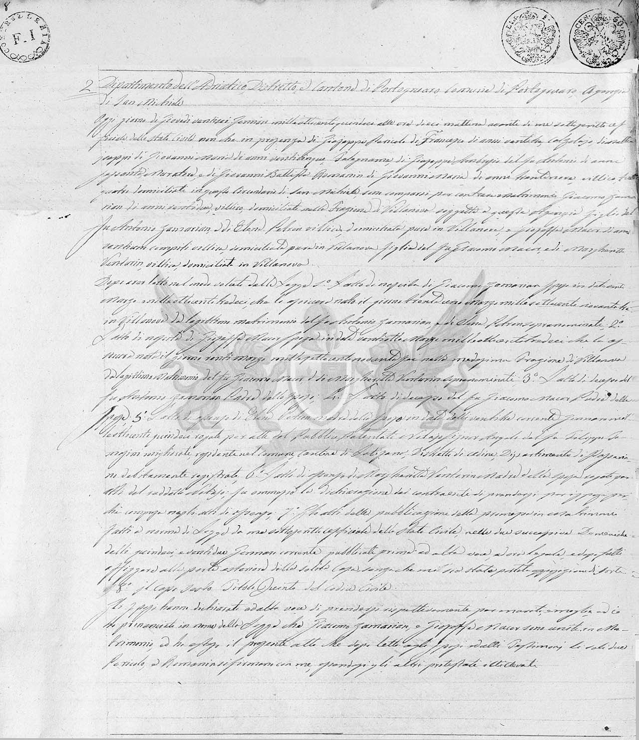 Depois de ter lido no modo devido da Lei; 1º: o Ato de nascimento de Giacomo Zamarian nubente na data vinte de março de mil oitocentos e treze, que o assegura ter sido nascido no dia trinta e um de março do ano de mil setecentos e noventa e três na já citada Fração de Villanova, do legitimo matrimonio do finado Antonio Zamarian, e de Elena Petrona ambos supracitados. 2º: o Ato de nascimento de Gioseffa Macor em data de vinte e oito de Março de mil oitocentos e treze, que assegura ter sido nascida no dia vinte de Março de mil setecentos e noventa e seis, na referida Fração de Villanova do legitimo matrimonio do finado Giacomo Macor, e de Margherita Venturin supramencionados. 3º: O certificado de óbito do finado Antonio Zamarian, pai do nubente. 4º O certificado de óbito de Giacomo Macor, pai da nubente. 5º : O Ato de Consenso por escrito de Elena Petron Mãe do nubente na data de vinte e três do corrente janeiro de mil oitocentos e quinze emitido pelo licenciado Notário publico Senhor Angelo filho do finado Fillipo Famosini residente no Município e Cantão de Latisana, Distrito de Udine Departamento de Passariano devidamente registrado. 6º : O Ato de Consenso por escrito de Margherita Venturin mãe da nubente emitido pelo já citado Notário. 7º: Os atos das publicações da promessa de matrimônio feitas na forma da Lei por mim subscrita e certificada pelo Registro Civil nos dois sucessivos domingos dos dias quinze e vinte e dois de janeiro corrente publicados primeiro em alta voz na hora local e depois fixados na porta exterior da referida Casa sem que tenha retornado a mim oposição. 8º: O Cap. Sexto Título Quinto do Código Civil.