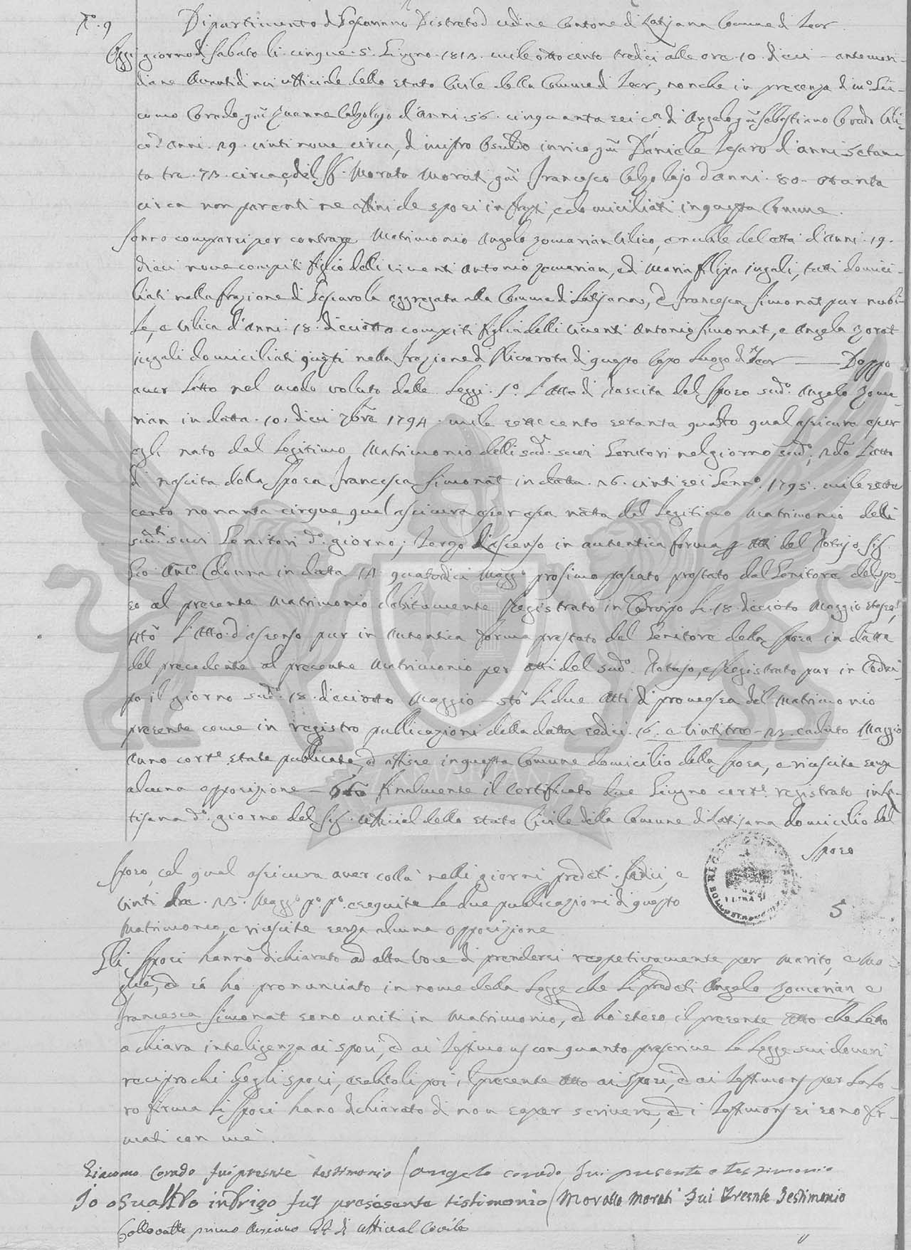 Depois de ter lido no modo requerido pela Lei. 1º: o registro de nascimento do nubente subscrito Angelo Zamarian na data de -10- dez de setembro de -1794- mil setecentos e novanta e quatro, o qual assegura ter nascido do legítimo matrimônio dos supracitados genitores na data; Segundo; o registro e nascimento da nubente Francesca Simonat nascida no dia -26- vinte e seis de janeiro de -1795- mil setecentos e noventa e cinco, o qual assegura ter nascida do legítimo matrimônio dos supracitados genitores na data; Terceiro: o assenso autenticado pelo notário Sr. Giovanni Antonio Colonna na data de -14- quatorze de maio passado pelo genitor do nubente ao presente matrimônio devidamente registrado e Codroipo no di -18- dezoito de maio; 4º o registro de assenso também autenticado prestado pelo genitor da nubente em data precedente daquela do matrimônio através do notário, e registrado da mesma forma em Codroipo no citado dia -18- de maio; 5º Os dois atos de promessa do matrimônio (avisos) presentes no registro de publicações na data de -16- e -23- de maio corrente, publicadas e afixadas neste Município da nubente , e re-fixada sem nenhuma oposição.