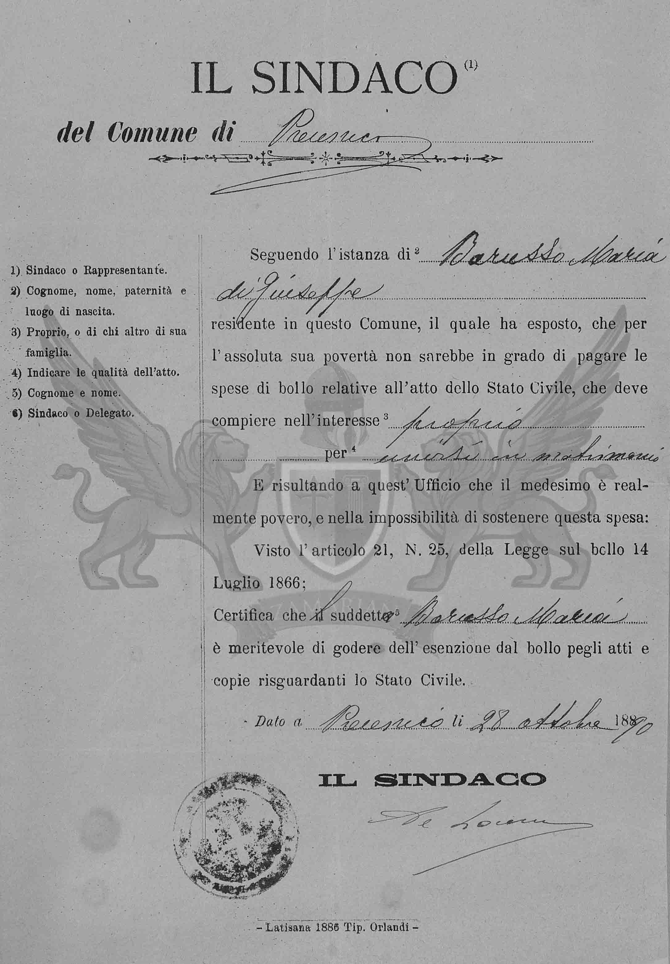 Seguindo a instância de 2 ) Baruzzo filha de Giuseppe residente neste Município, a qual expôs, que para a absoluta sua pobreza não estaria em condições de pagar as despesas de taxa relativas ao ato do Estado Civil, que deve cumprir no interesse 3 ) seu próprio para 4 ) contrair matrimônio civil.