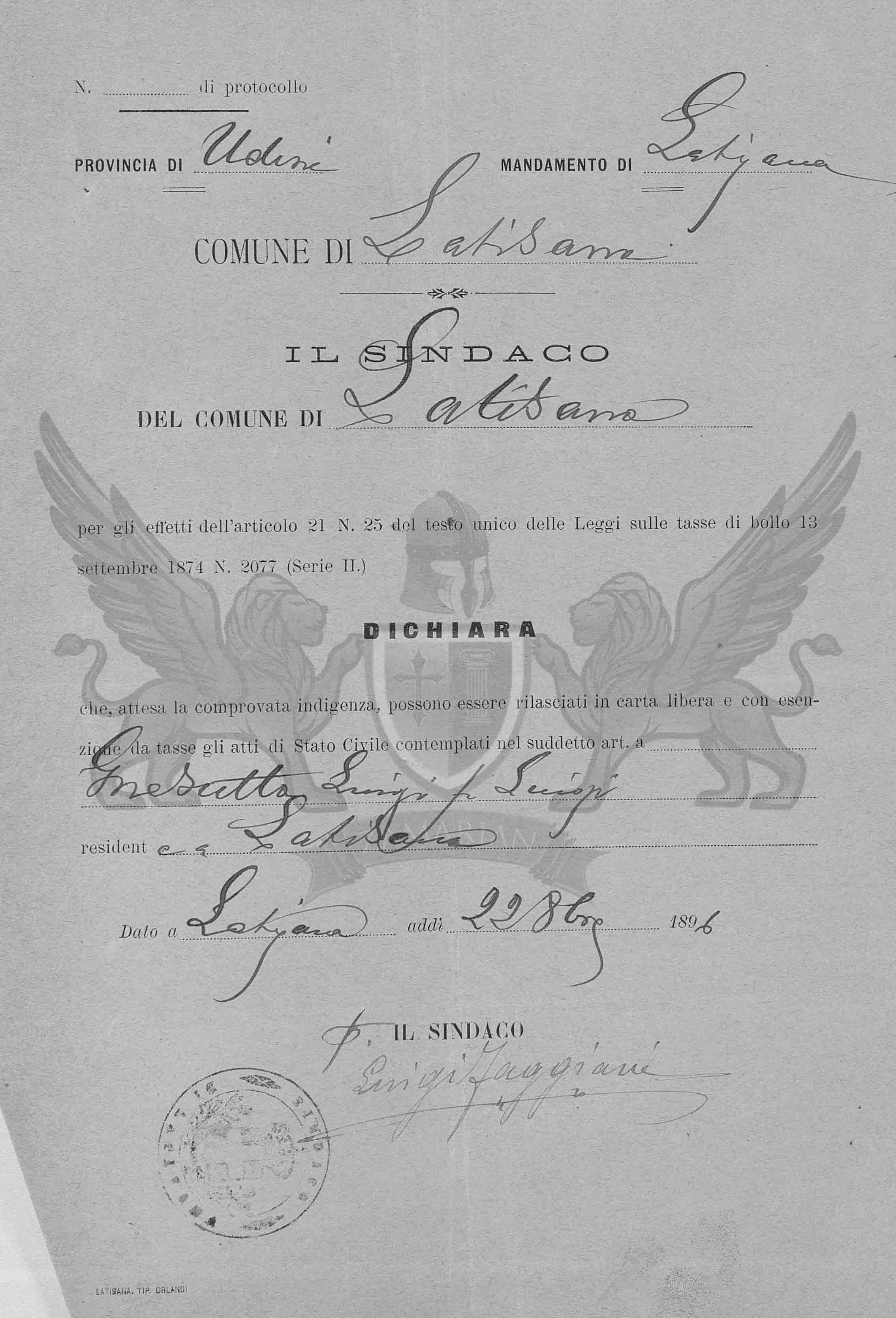 que, atenta a comprovada indigência, podem ser expedida em papel libre com isenção de taxas os atos de Estado Civil contemplados no supracitado artigo para Gnesutta Luigi filho do falecido Luigi residente em Latisana.