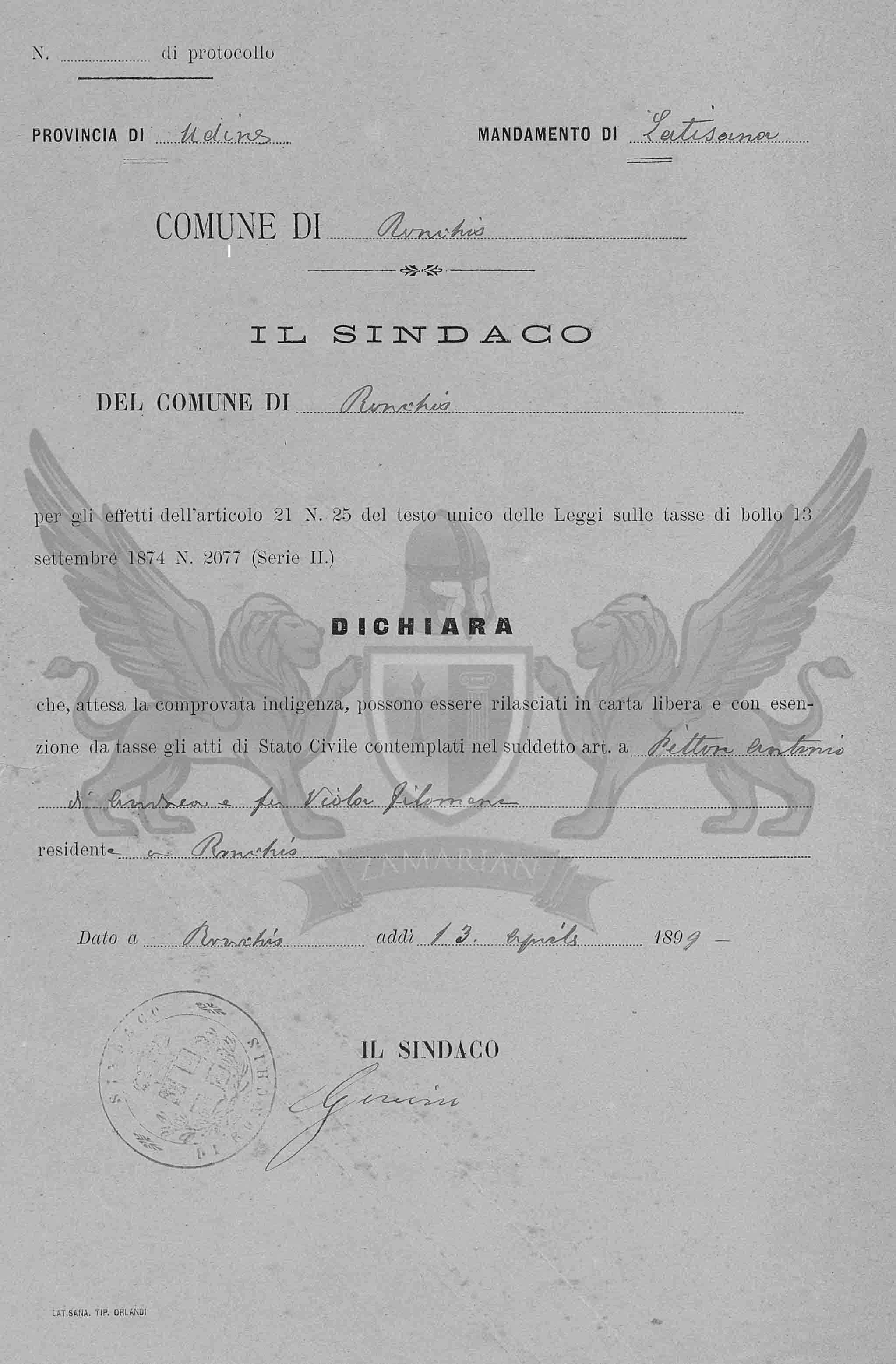 ue, em vista à comprovada indigência, podem ser emitidas em papel livre e com isenção das taxas os atos do Estado Civil contemplados no supracitado artigo para Pittoan Antonio filho de Andrea e de Viola Filomena residente em Ronchis.