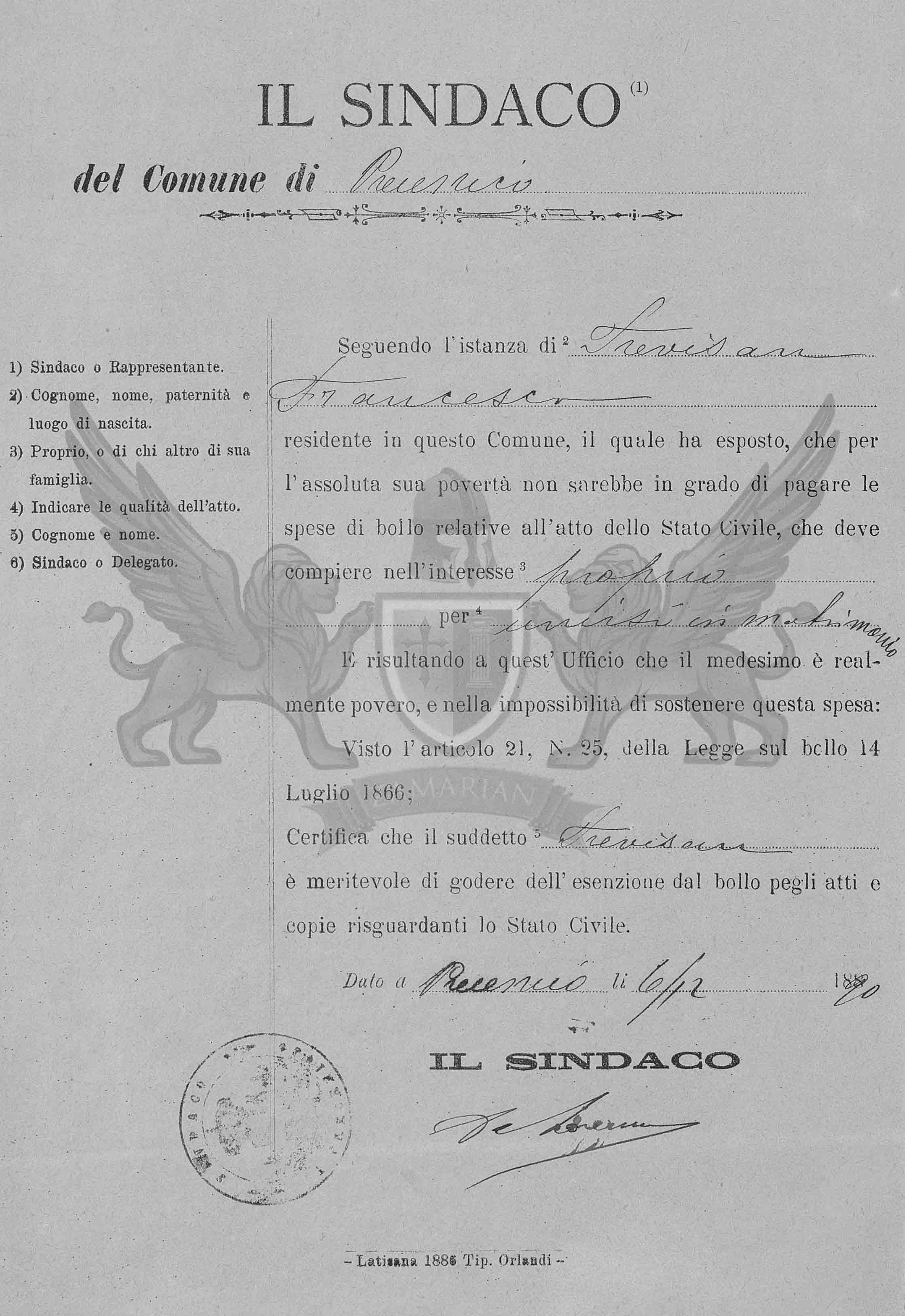 Seguindo a instância de 2 ) Trevisan Francesco residente neste Município, o qual expôs, que pela sua absoluta pobreza não estaria em condições de pagar as despesas de taxa relativas ao ato do Estado Civil, que deve cumprir no interesse 3 ) seu próprio para 4 ) unir-se em matrimônio.