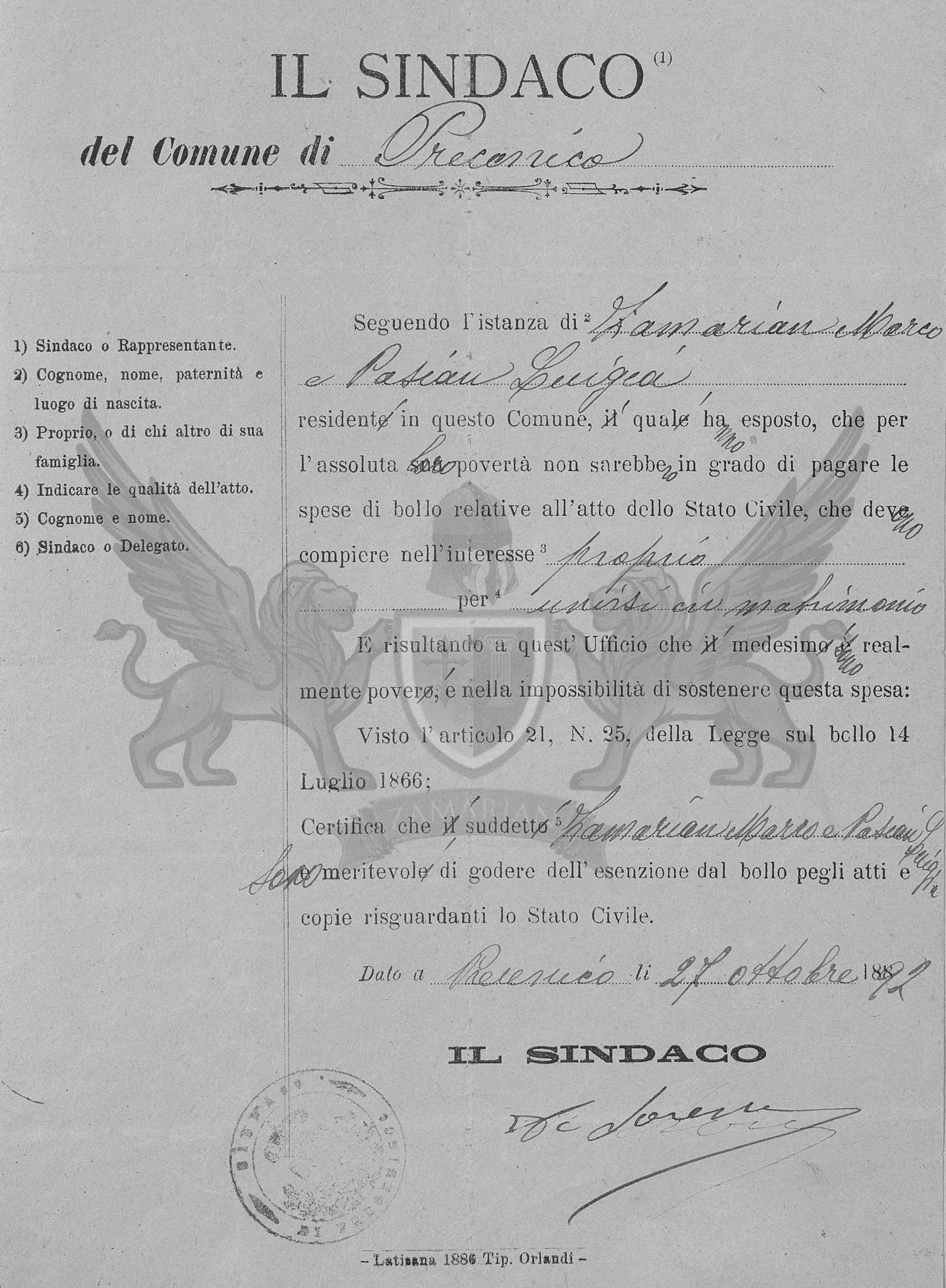 Seguindo a instância de 2 ) Zamarian Marco e Pasian Luigia residentes neste Município, os quais expuseram, que pela absoluta pobreza não estariam em condições de pagarem as despesas de taxa relativas ao ato do Estado Civil, que deve cumprir no interesse 3 ) seu próprio para 4 ) unirem-se em matrimônio.