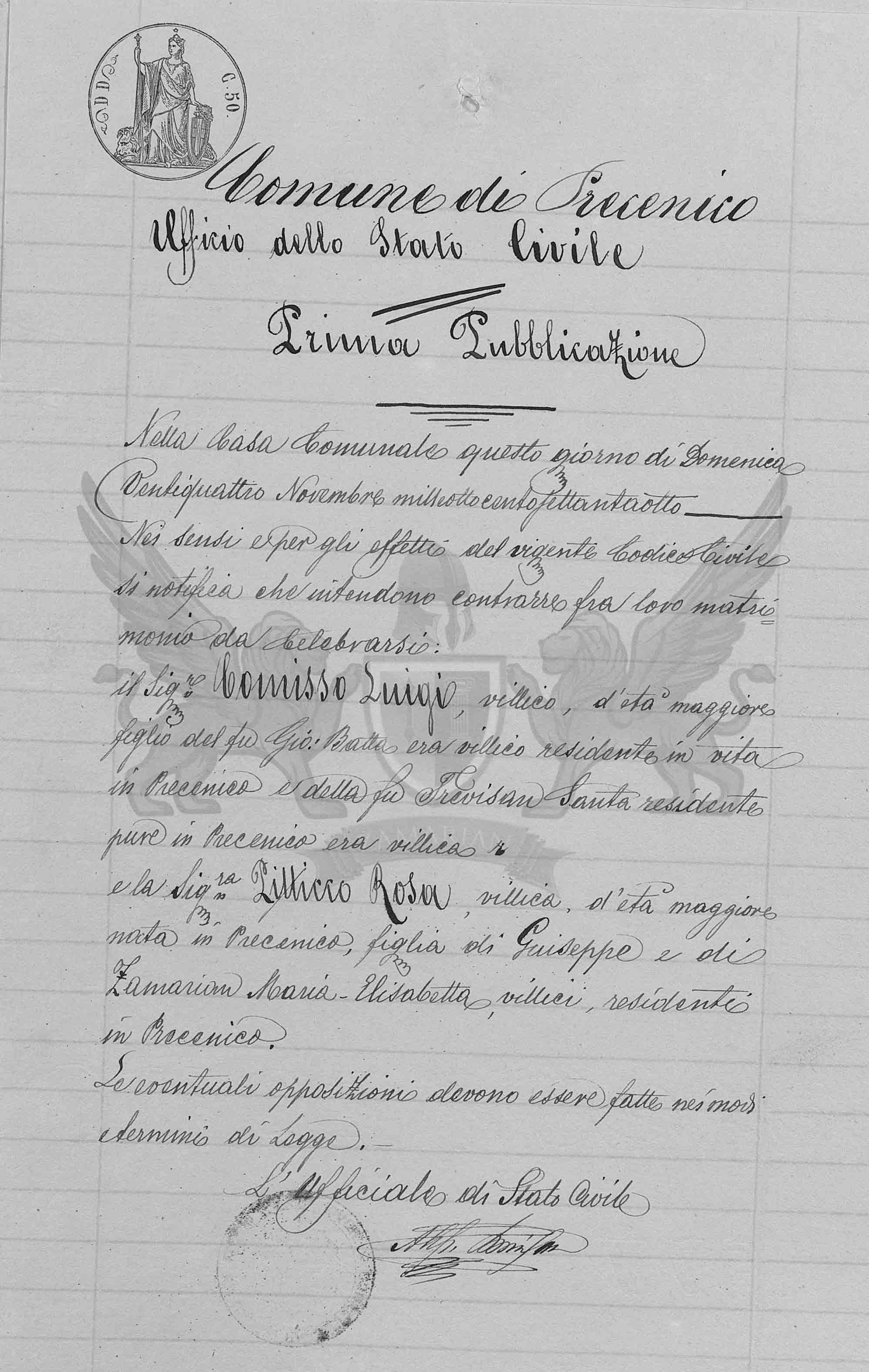 O Senhor Comisso Luigi, camponês, de idade maior filho do falecido Giovanni Battista era camponês residente em vida em Precenicco e da falecida Trevisan Santa residente também em Precenicco era camponesa.