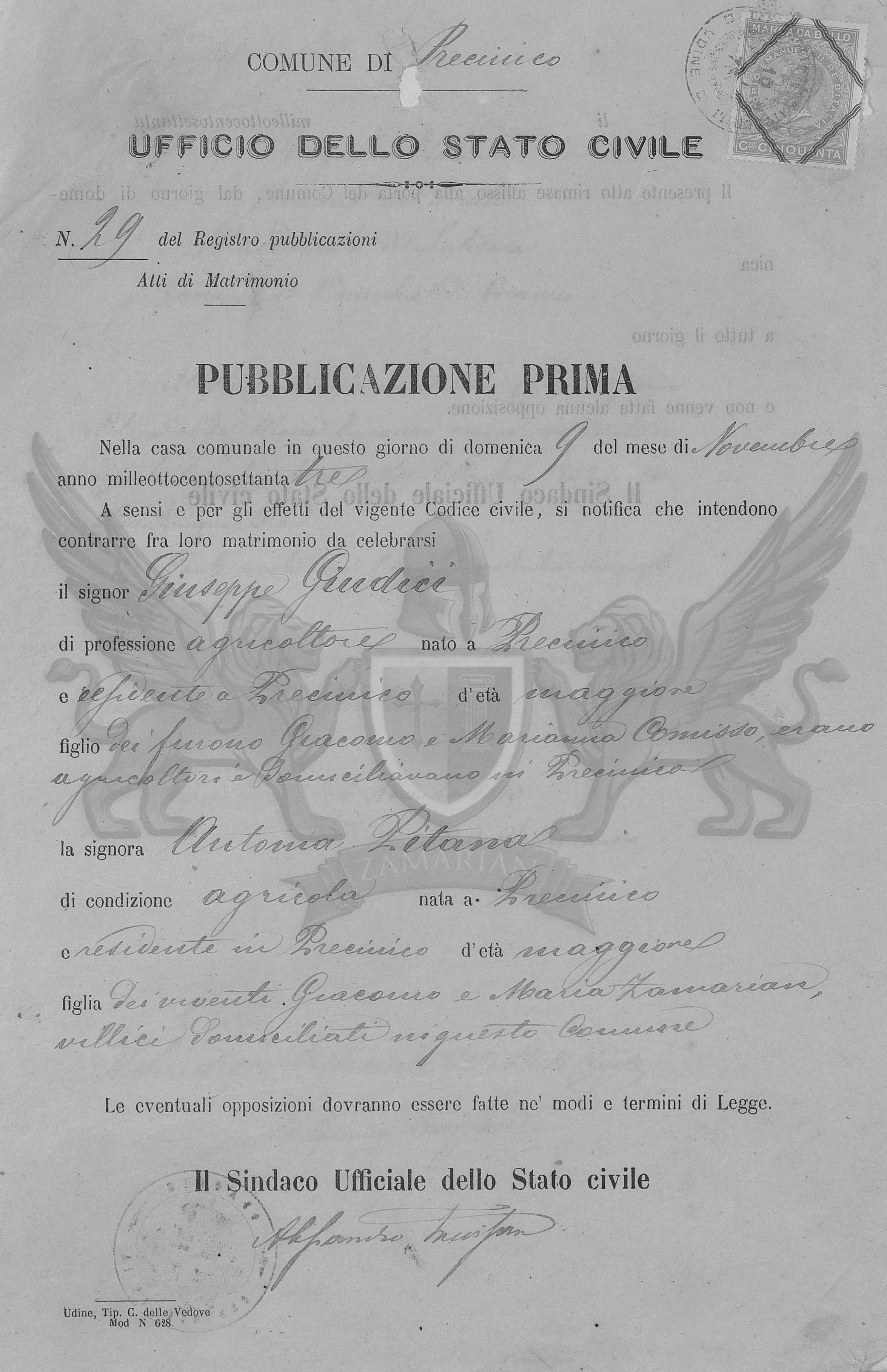 A sensos e pelos efeitos do vigente Código Civil, se notifica que ontem contrair matrimônio entre eles a celebrar neste Ofício o Senhor Stefano Mazzega, solteiro, de profissão camponês nascido em Piancada de Palazzolo dello Stella e residente em Piancada supracitada, de idade maior, filho dos viventes Domenico Mazzega e Maria Bertoli, camponeses e domiciliados em Piancada supracitada e a Senhora Clementina Trevisan, de condição camponesa, nascida em Precenicco e residente em Precenicco, de idade maior, filha dos viventes Giovanni Battista Trevisan e Maria Cicuttini, camponeses domiciliados em Precenicco.