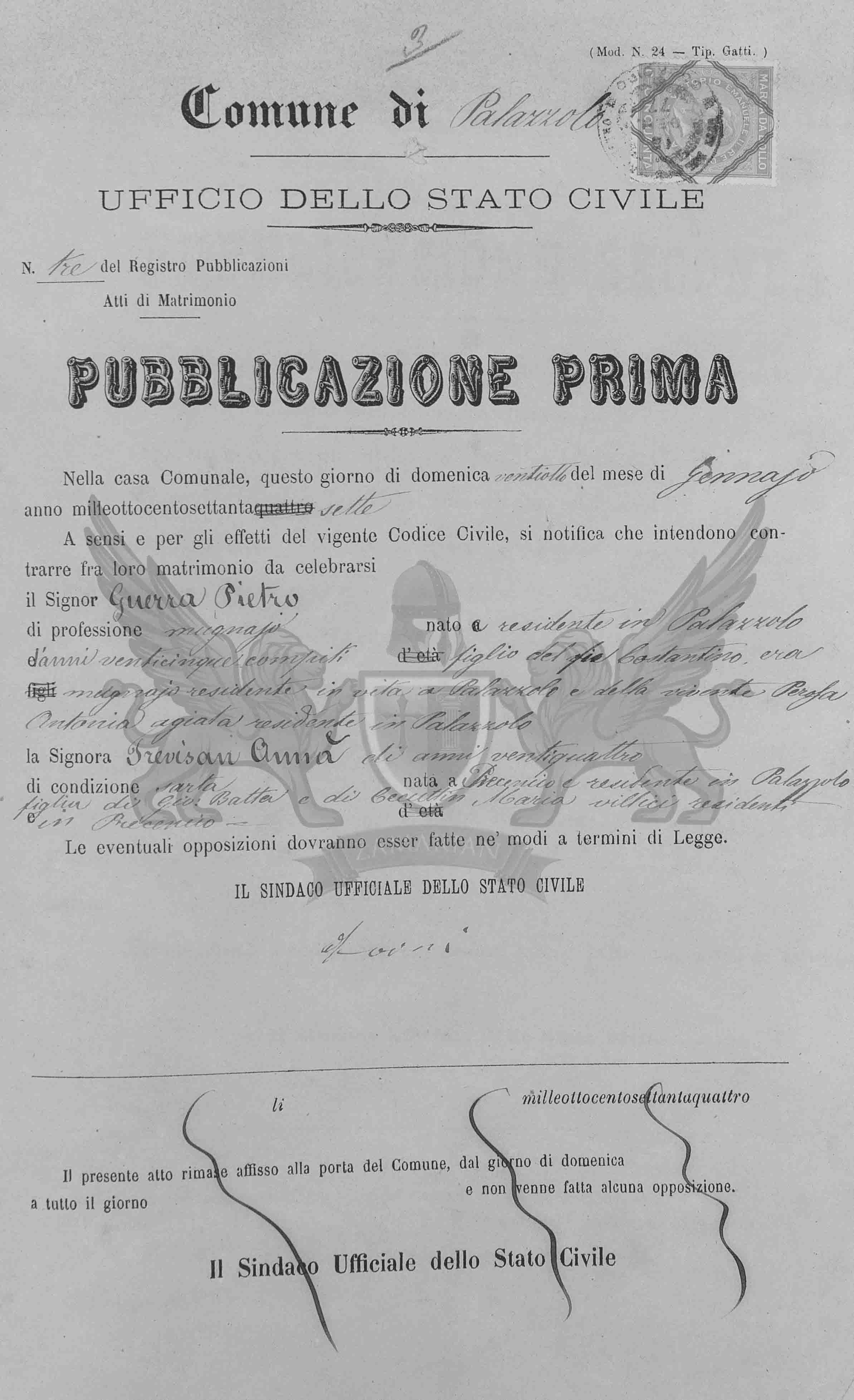 A sensos e pelos efeitos do vigente Código Civil se notifica que intendem contrair matrimônio a celebrar-se o Senhor Guerra Pietro de profissão moedor nascido e residente em Palazzolo de vinte e cinco anos completos filho do falecido Costantino, era moedor residente em vida em Palazzolo e da vivente Perosa Antonia comerciante residente em Palazzolo e a Senhora Trevisan Anna de vinte e quatro anos de condição artesã nascida em Precenicco e residente em Palazzolo filha de Giovanni Battista e de Ceccutin Maria camponeses residentes em Precenicco.