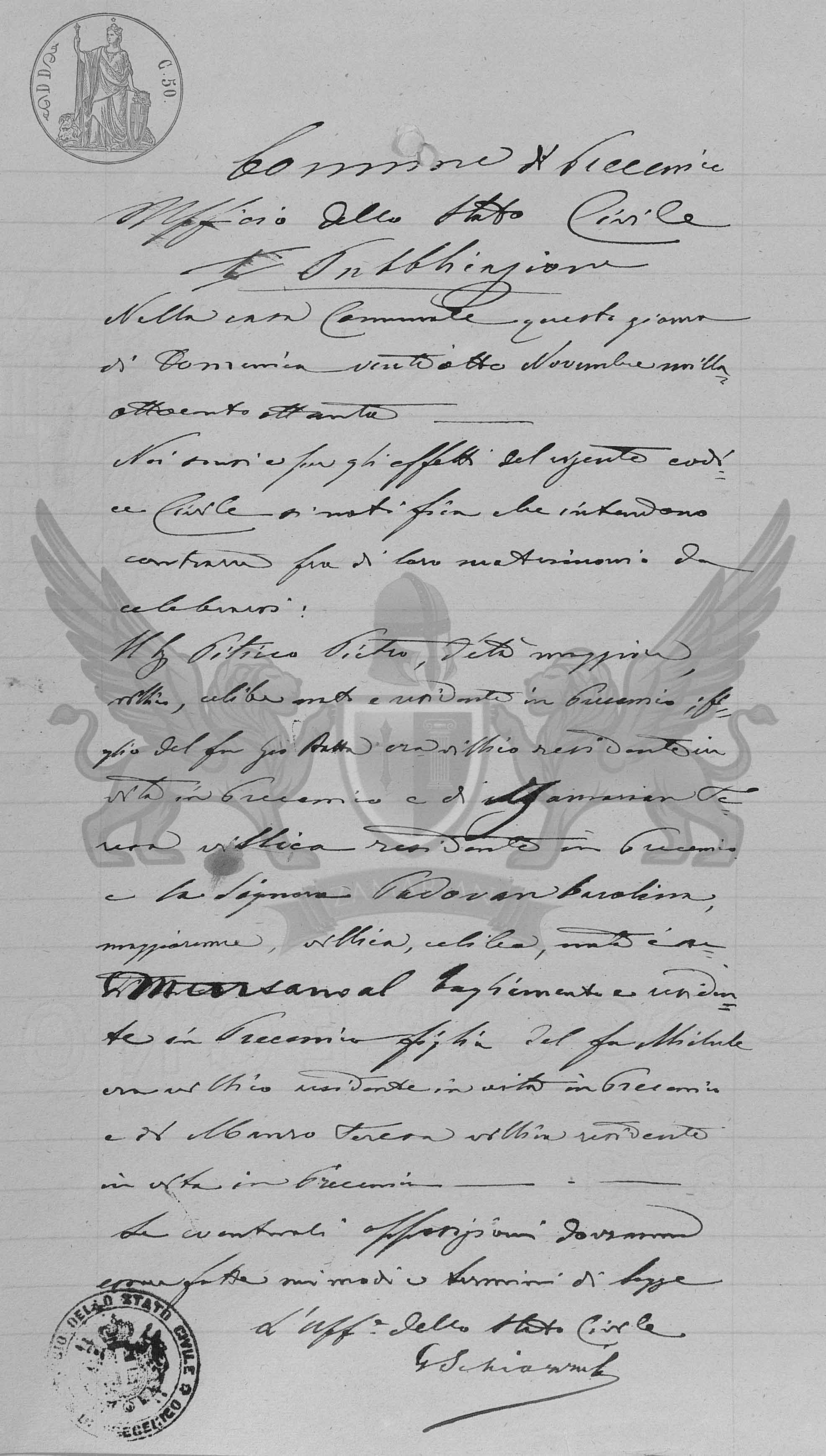 O Senhor Piticco Pietro, de maior de idade, camponês, solteiro nascido e residente em Precenicco filho do falecido Giovanni Battista era camponês residente em vida em Precenicco e de Zamarian Teresa camponesa residente em Precenicco;