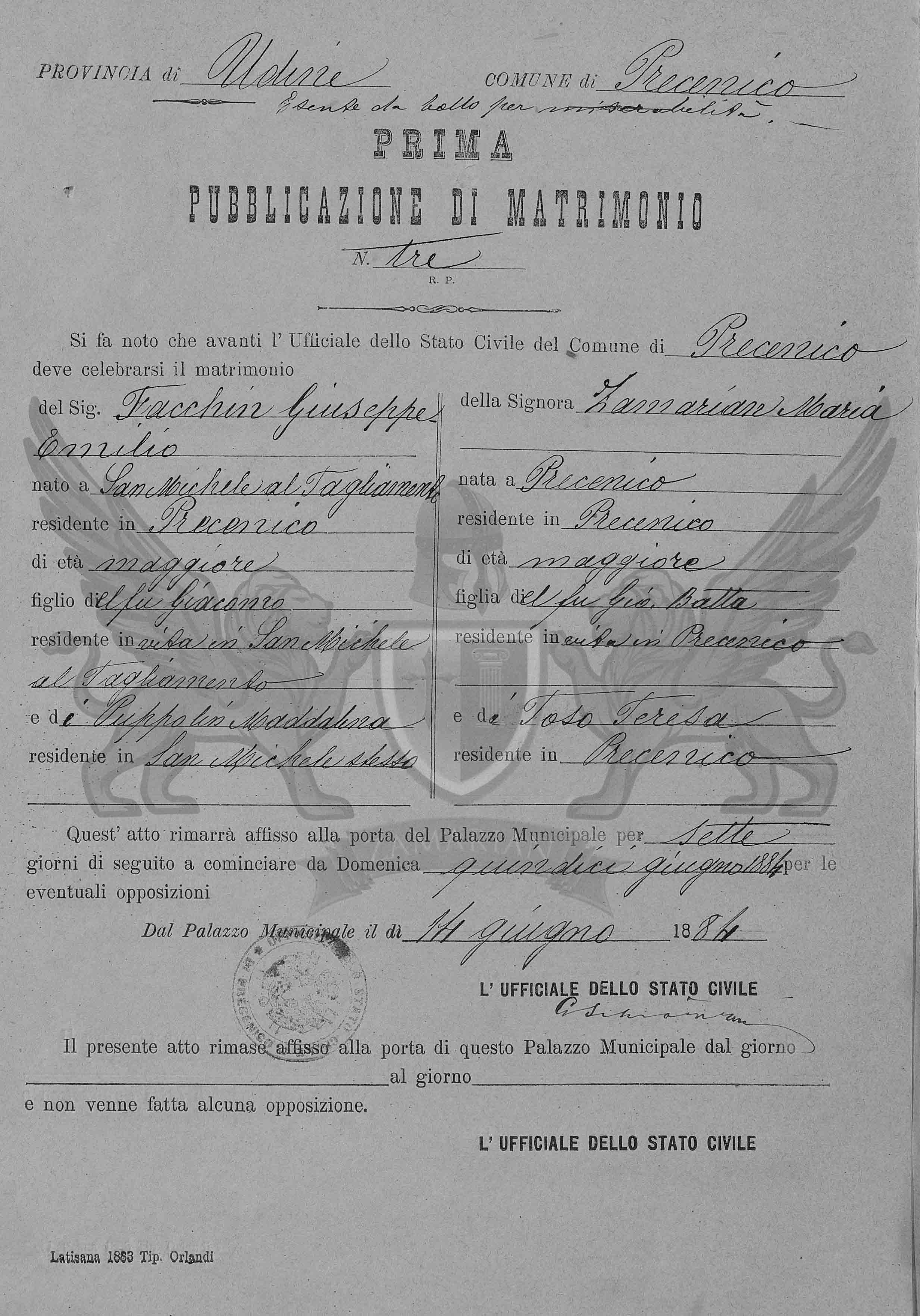 e faz notório que diante do Oficial do Estado Civil do Município de Precenicco deve celebrar-se o matrimônio do Senhor Facchin Giuseppe Emilio, nascido em San Michele al Tagliamento, residente em vida em San Michele al Tagliamento, e de Puppolin Maddalena, residente em San Michele supracitada, e da Senhora Zamarian Maria, nascida em Precenicco, residente em Precenicco, de idade maior, filha do falecido Giovanni Battista, residente em vida em Precenicco e de Toso Teresa, residente em Precenicco.