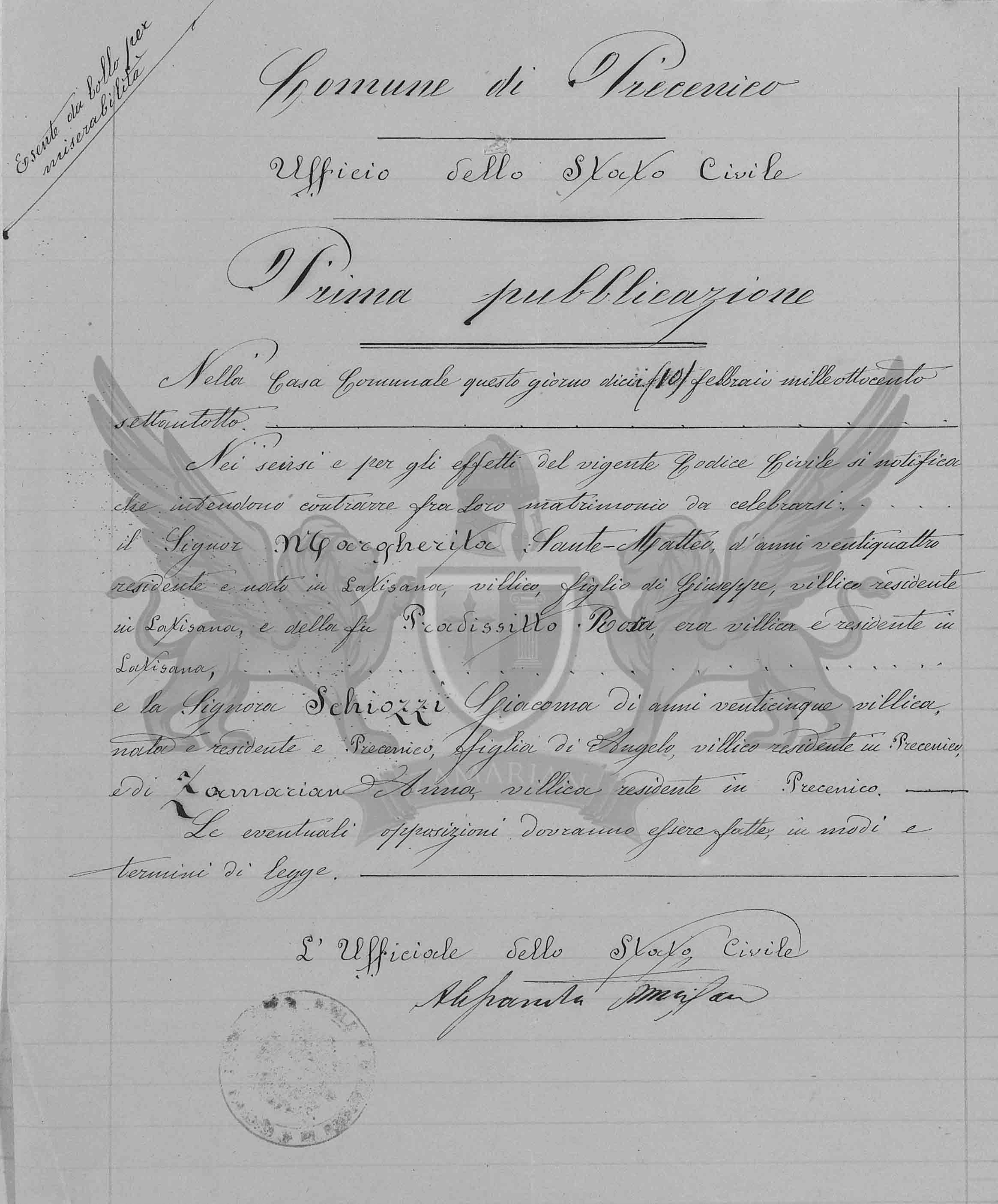 O Senhor Margherita Sante-Matteo, de vinte e quatro anos residente nascido em Latisana, camponês, filho de Giuseppe, camponês residente em Latisana, e da finada Pradissitto Rosa, era camponesa e residente em Latisana.